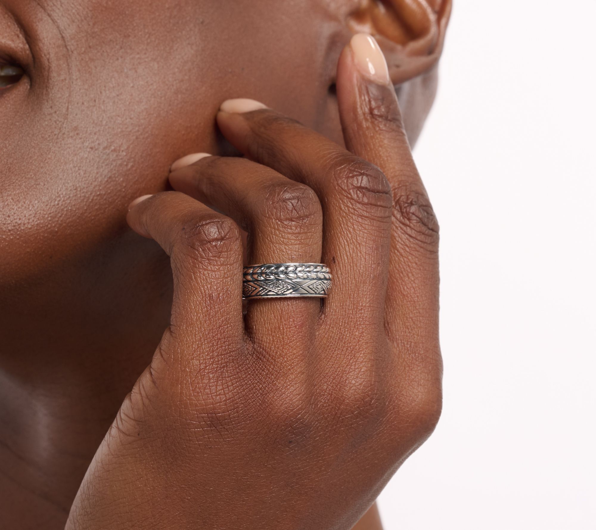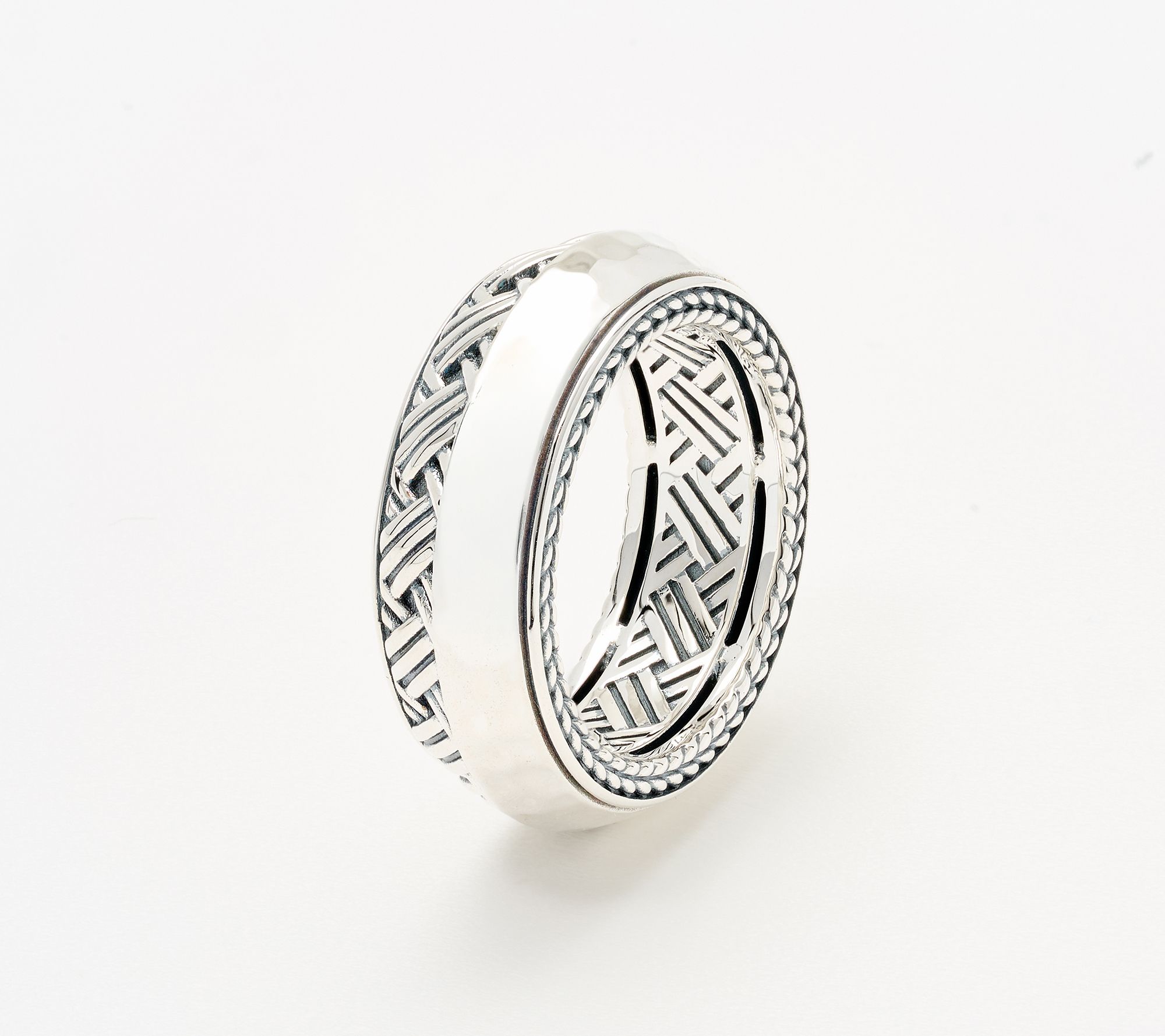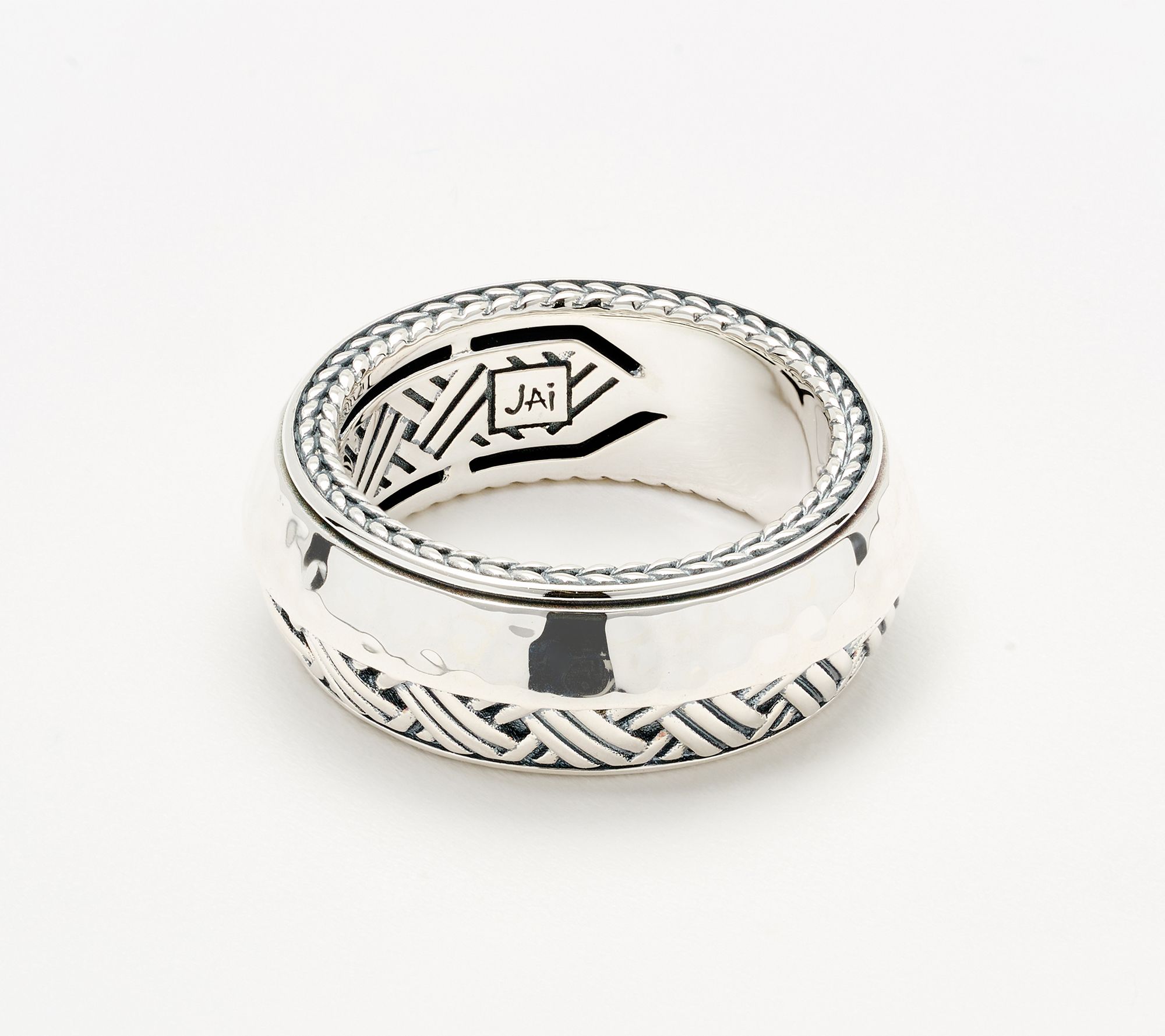 Slip on this JAI sterling silver band ring -- with inspiration from QVC® Host Alberti Popaj -- and instantly accentuate your look with dimensional texture in either diamond-cut and basketweave or hammered and woven styles. The appealing texture and knife edge profile make a striking statement, whether you wear it for daily inspiration or as the finishing touch to your evening ensemble. From JAI.
