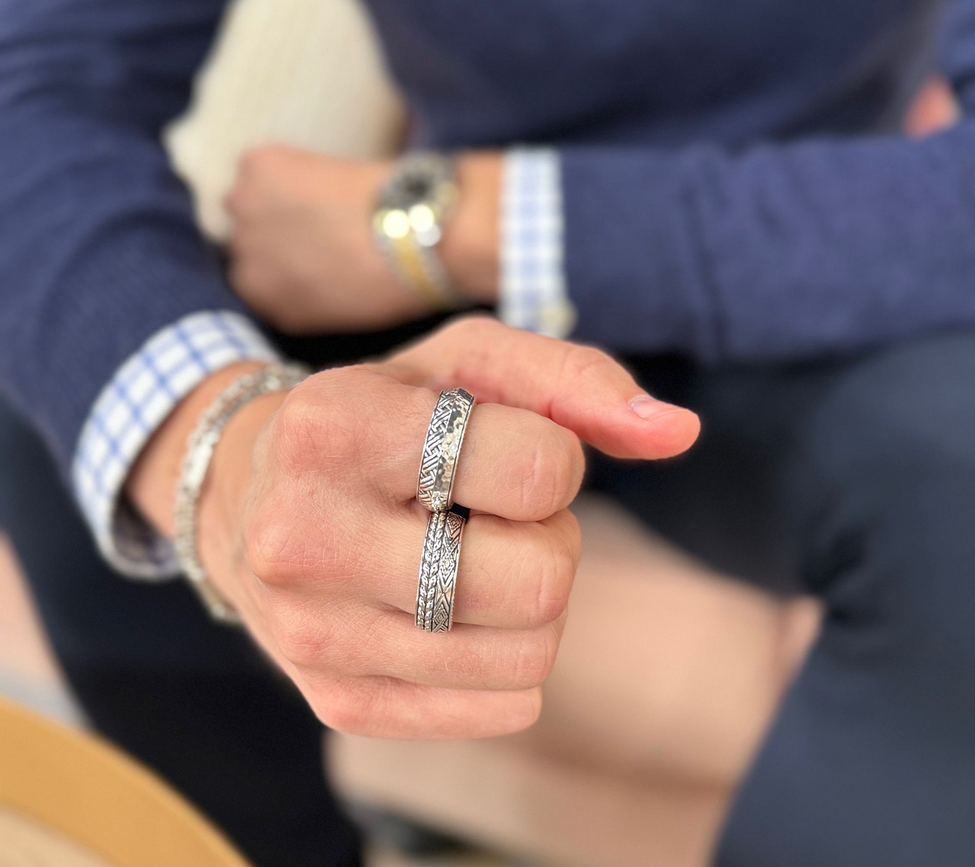 Choice of diamond cut and basketweave texture or hammered and woven artizane texture; knife edge style; oxidized; polished finish