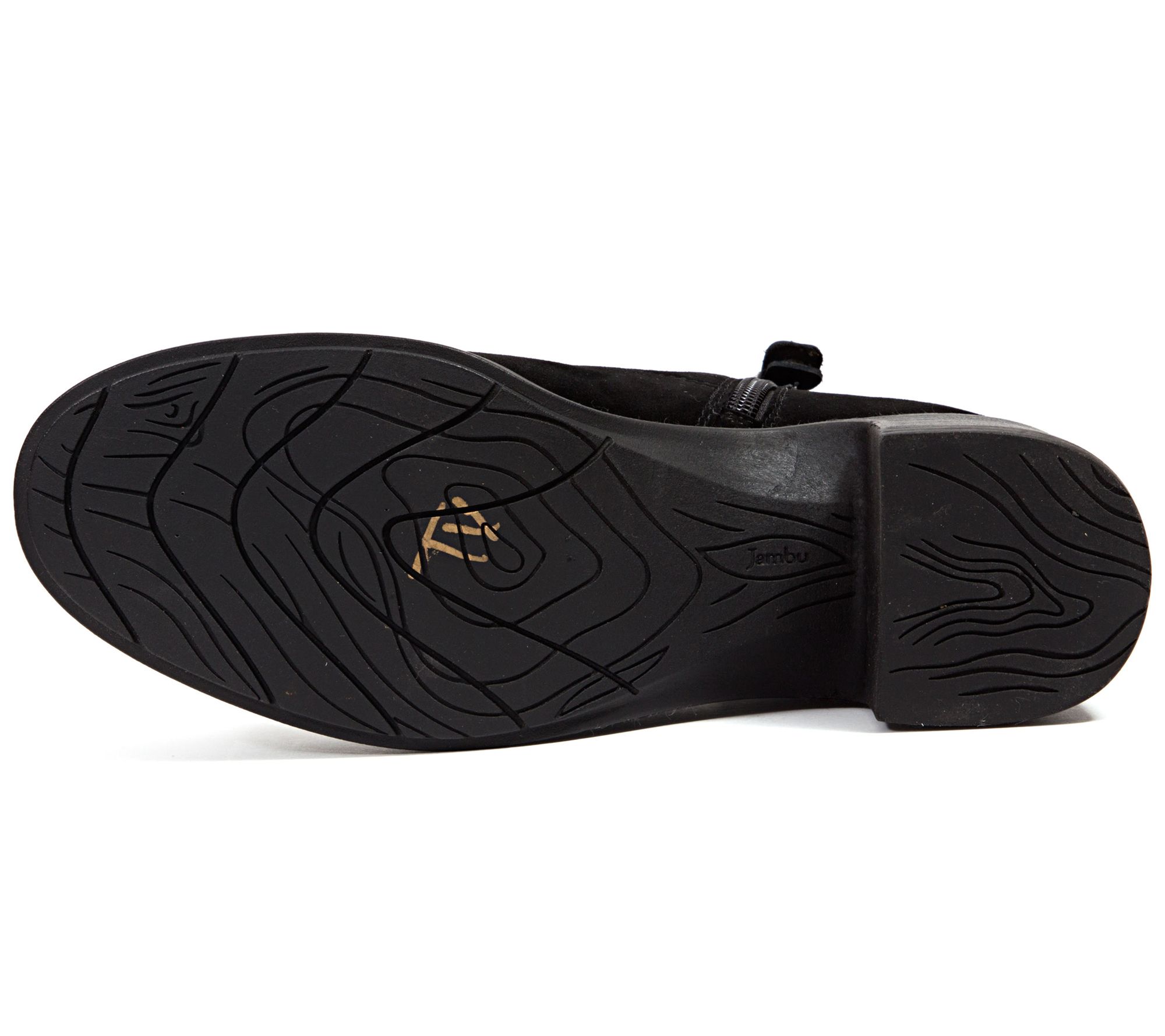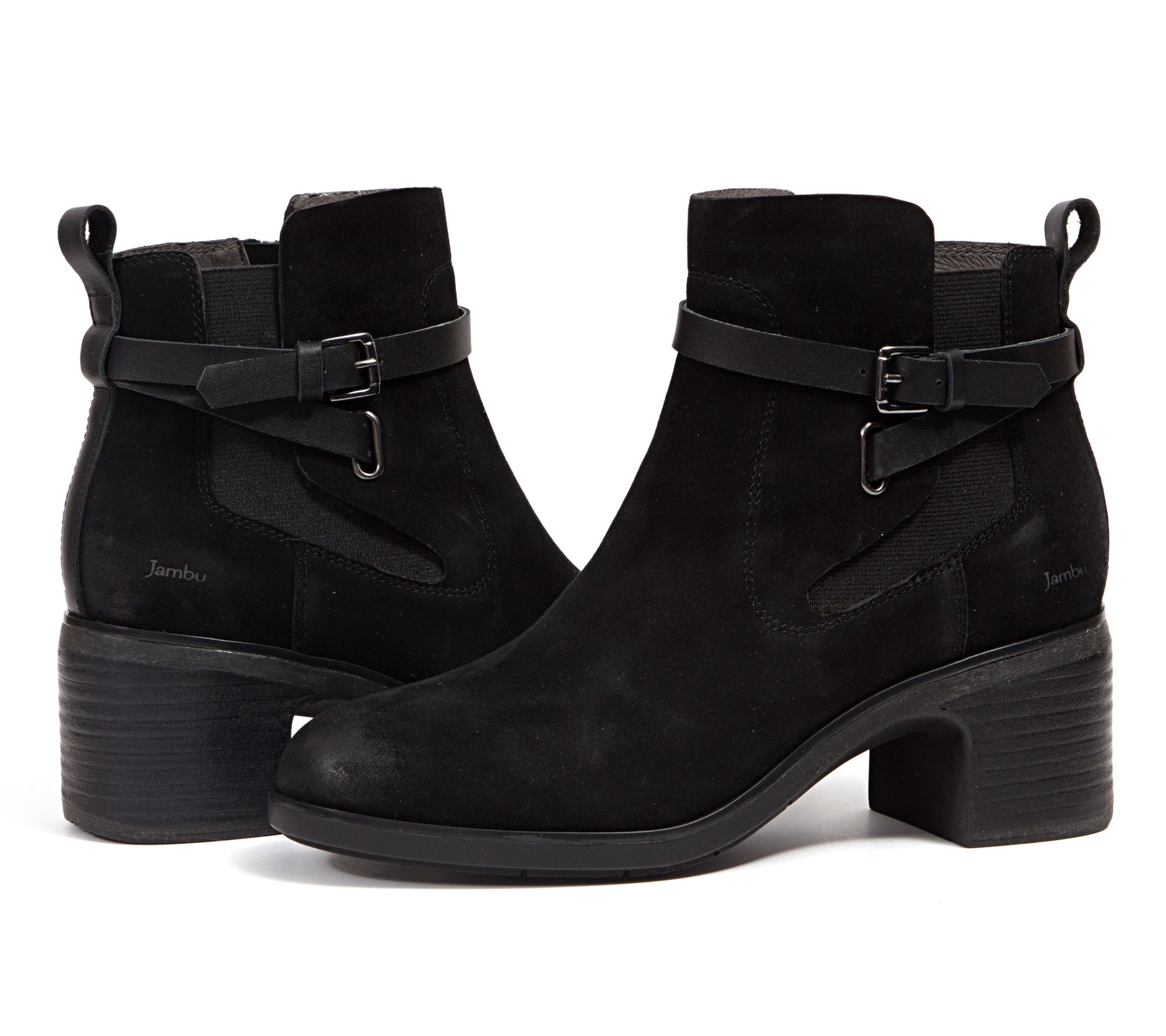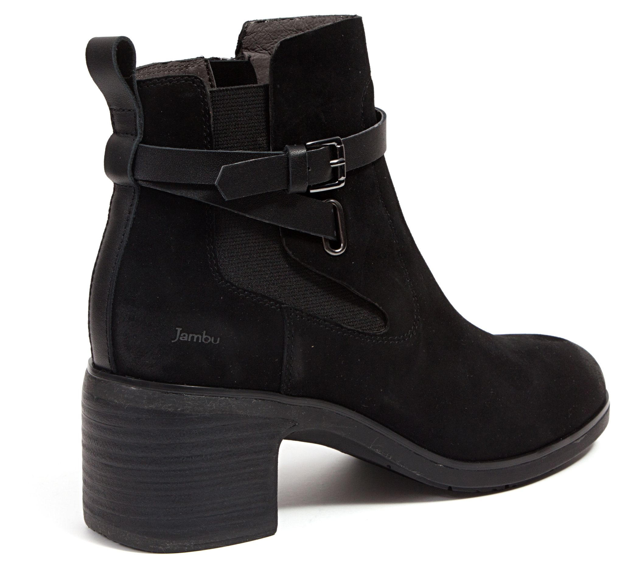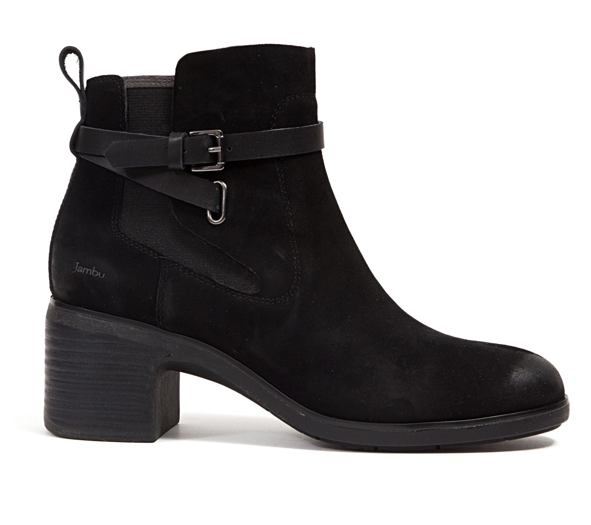 Jambu's Vivi water-resistant heeled bootie proves that sometimes the chicest things come in small packages. Inspired by the classic Chelsea boot, this stylish bootie features smooth kid suede construction and a thin band with buckle around the ankle for added flair. Elastic panels on the sides make it easy to slip on and off. From Jambu.