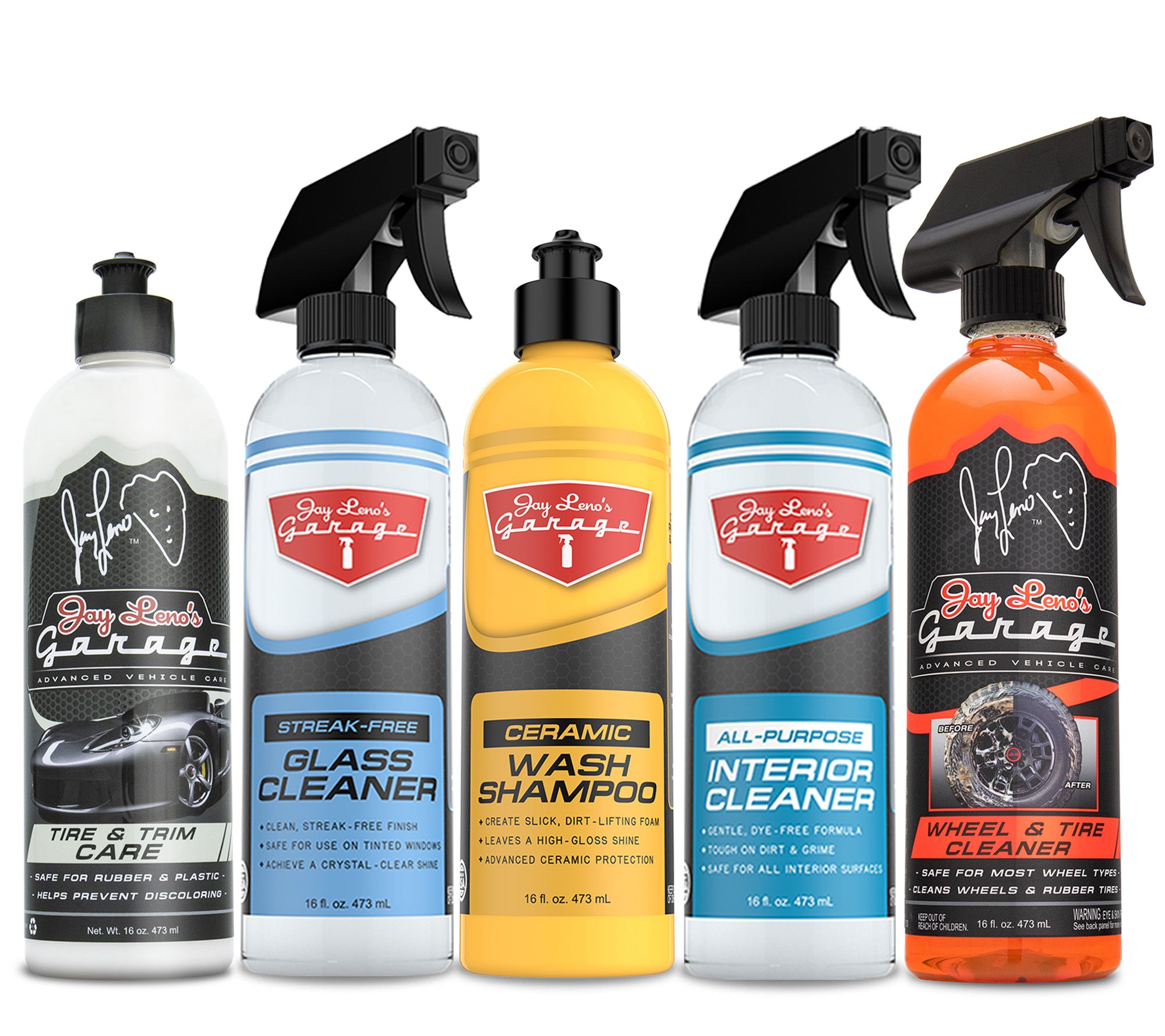 Includes five 16-fl oz bottles of car care essentials: one each of Ceramic Wash Shampoo, Glass Cleaner, Wheel & Tire Cleaner, Tire & Trim Care, and All-Purpose Interior Cleaner; and 5-gallon bucket