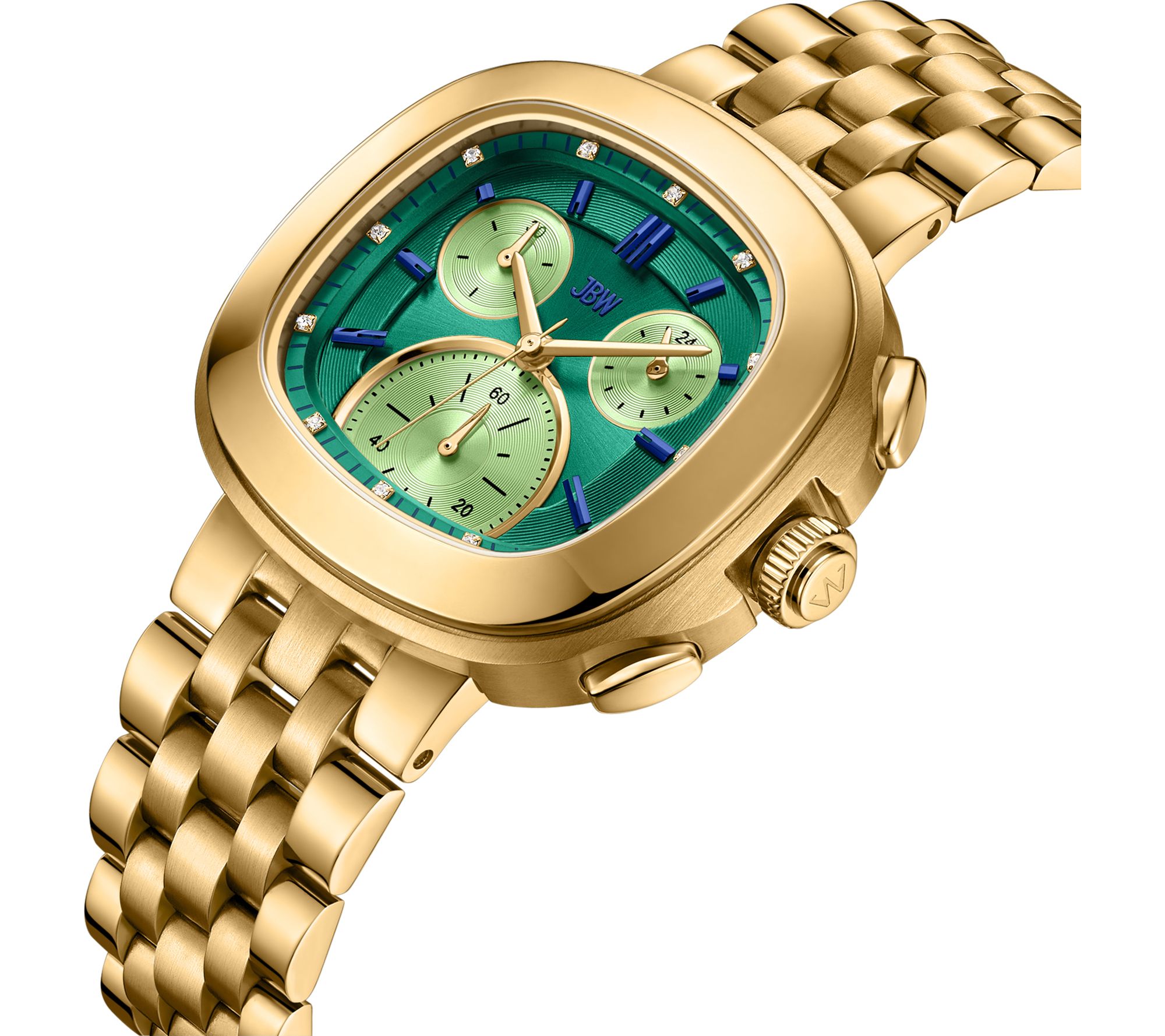 Experience every moment in style with this men's watch, where a bold green dial and 18K gold-plated stainless steel construction meet innovative touches like lab-grown diamond accents and chronograph functionality. Whether you're navigating a busy weekday or heading out for an evening event, this striking timepiece offers water-resistance and a commanding presence that bridges tradition and modernity. From JBW.