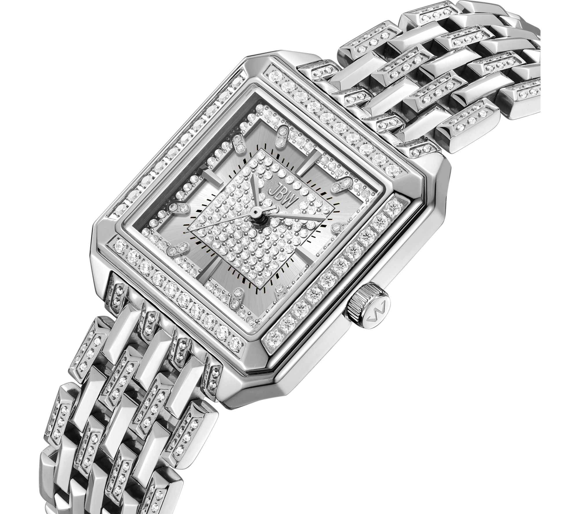 For evenings out or days at the office, this women's watch brings together angular style and shimmer -- 328 crystals sparkle across a square dial with a grid-inspired design, while a stainless steel bracelet mirrors the watch's sleek geometry. Swiss quartz movement delivers precision you can rely on, making it a standout companion for every occasion. From JBW.