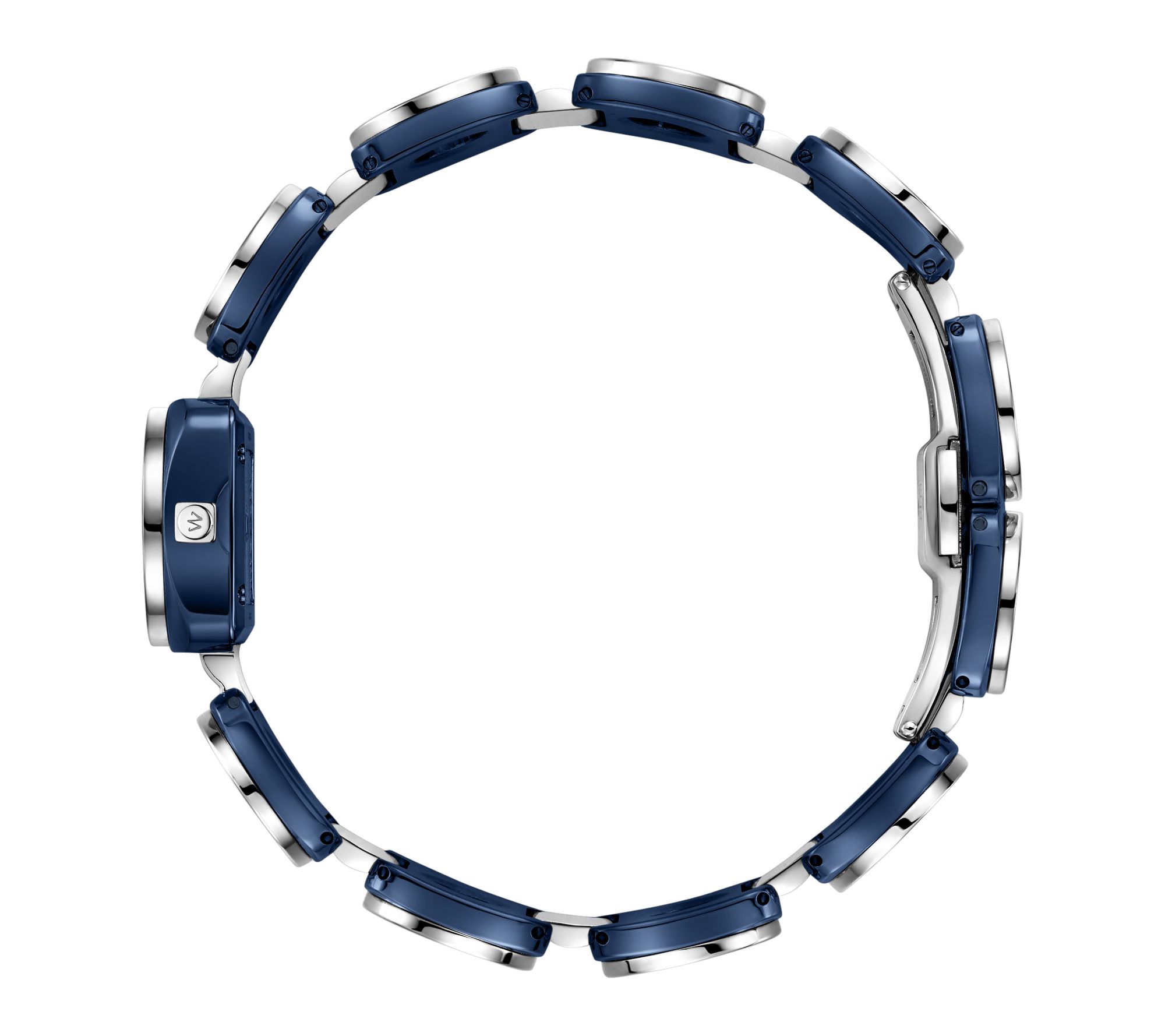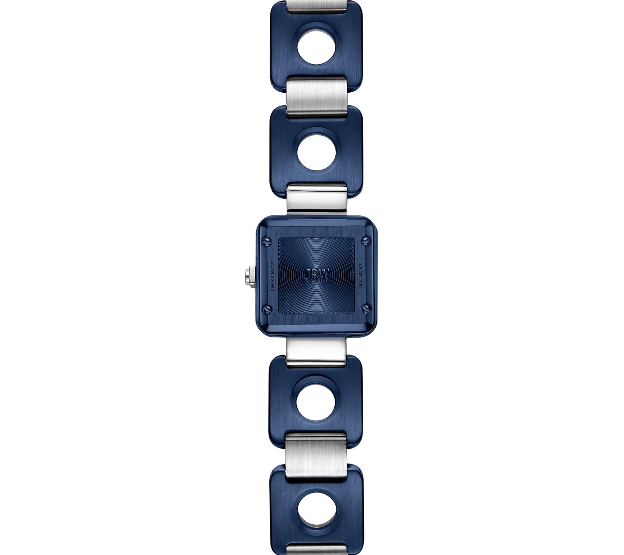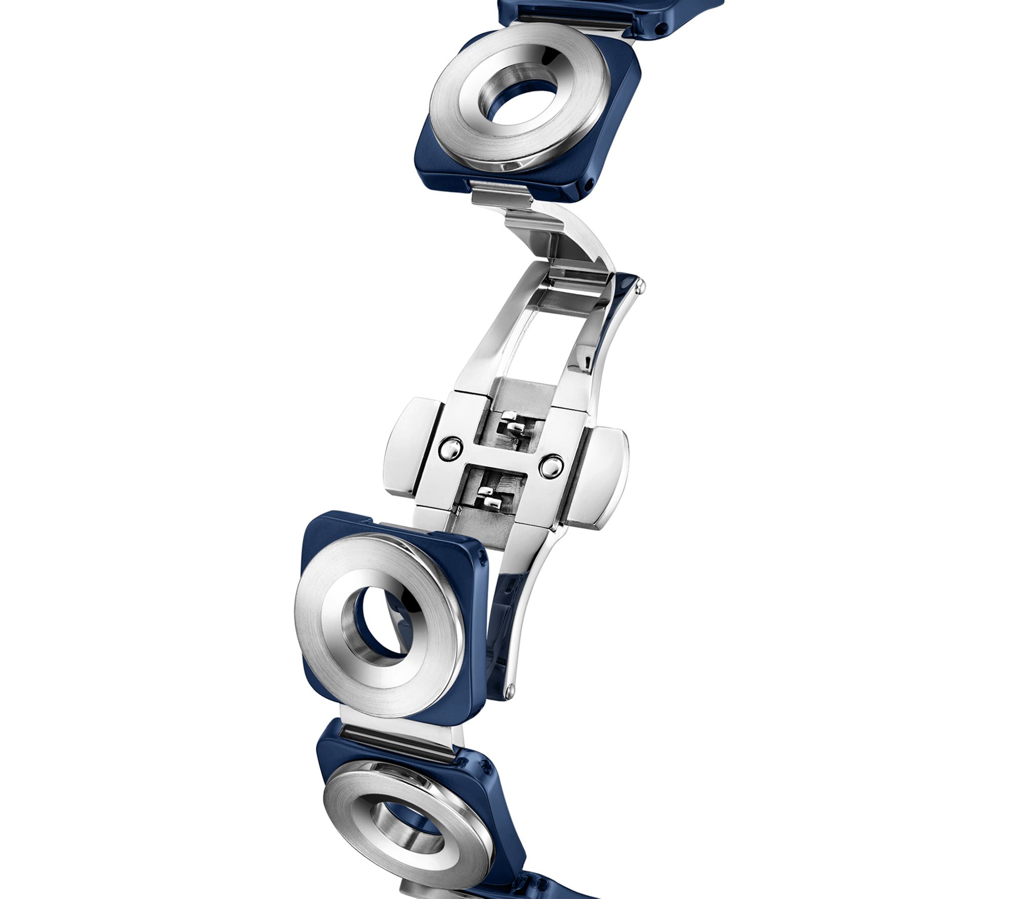 • Bracelet: stainless steel/blue; ten single-link pieces with circular cutouts; push-button hidden clasp