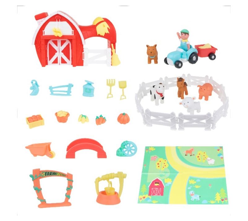 • Includes stable, dog, boy, tractor, extra cart, well pump, fence, water jug, fork, shovel, fence, pig, sheep, horse, cow, pepper crate, banana basket, corn, carrots, pumpkin, wheelbarrow, bridge, wheel, farm mat, welcome farm sign with arch, and water well