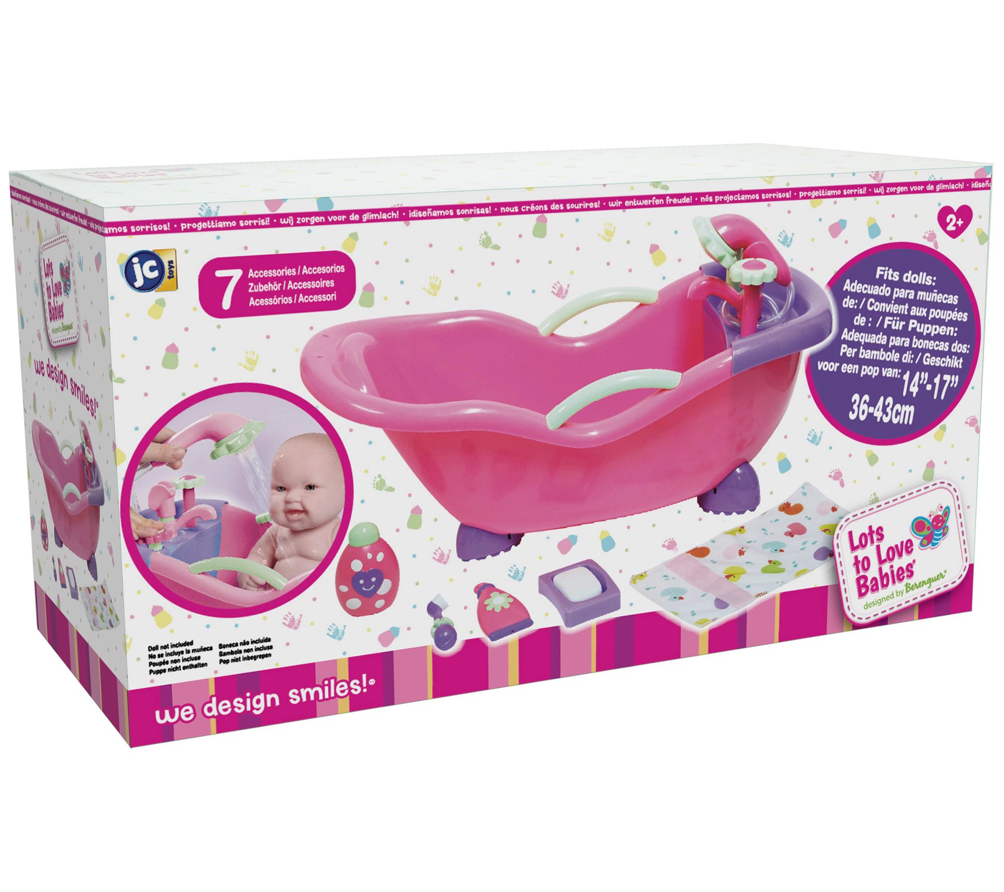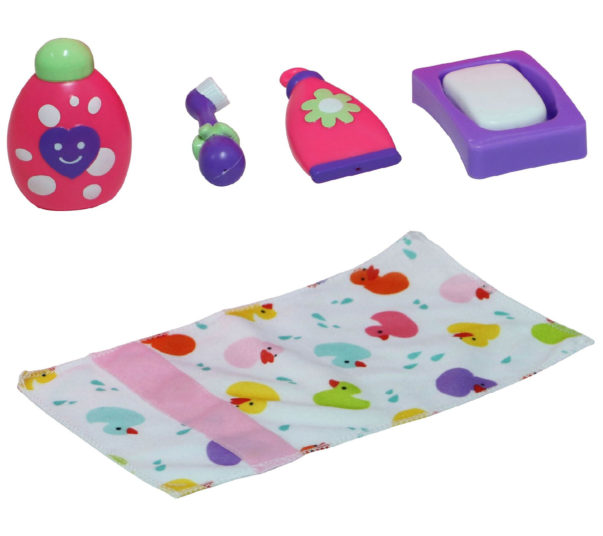 Keep your sweet doll clean and happy with this adorable working bath. This set includes a bar of play soap with a soap dish, a baby wash bottle, and a soft towel for drying your baby doll. From JC Toys.