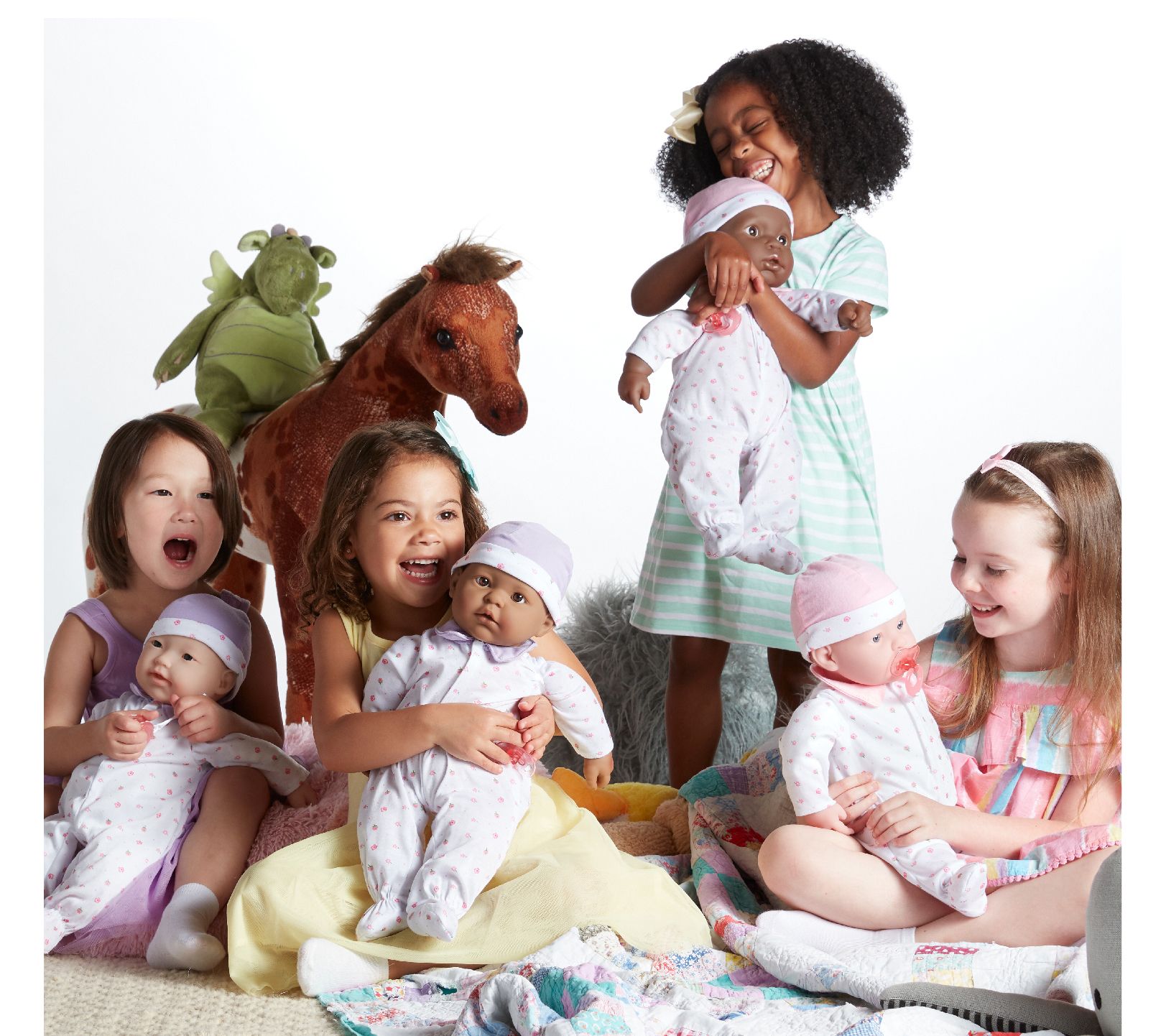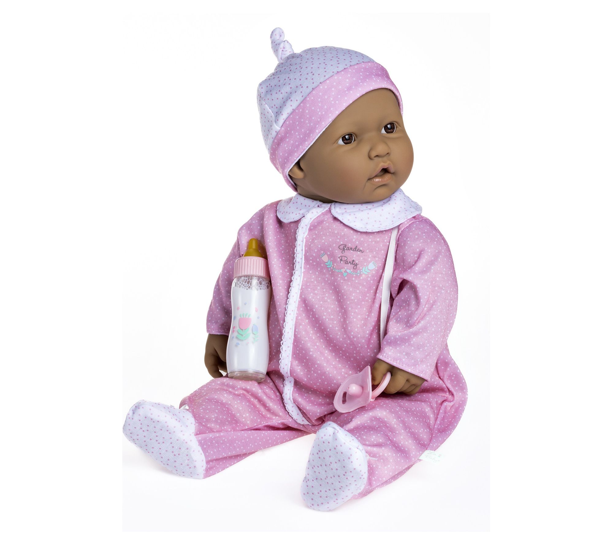 This snuggly cutie is ready to bring a smile to your child's face. She's wearing a sweet outfit with a hat and comes with a bottle and pacifier. From JC Toys.