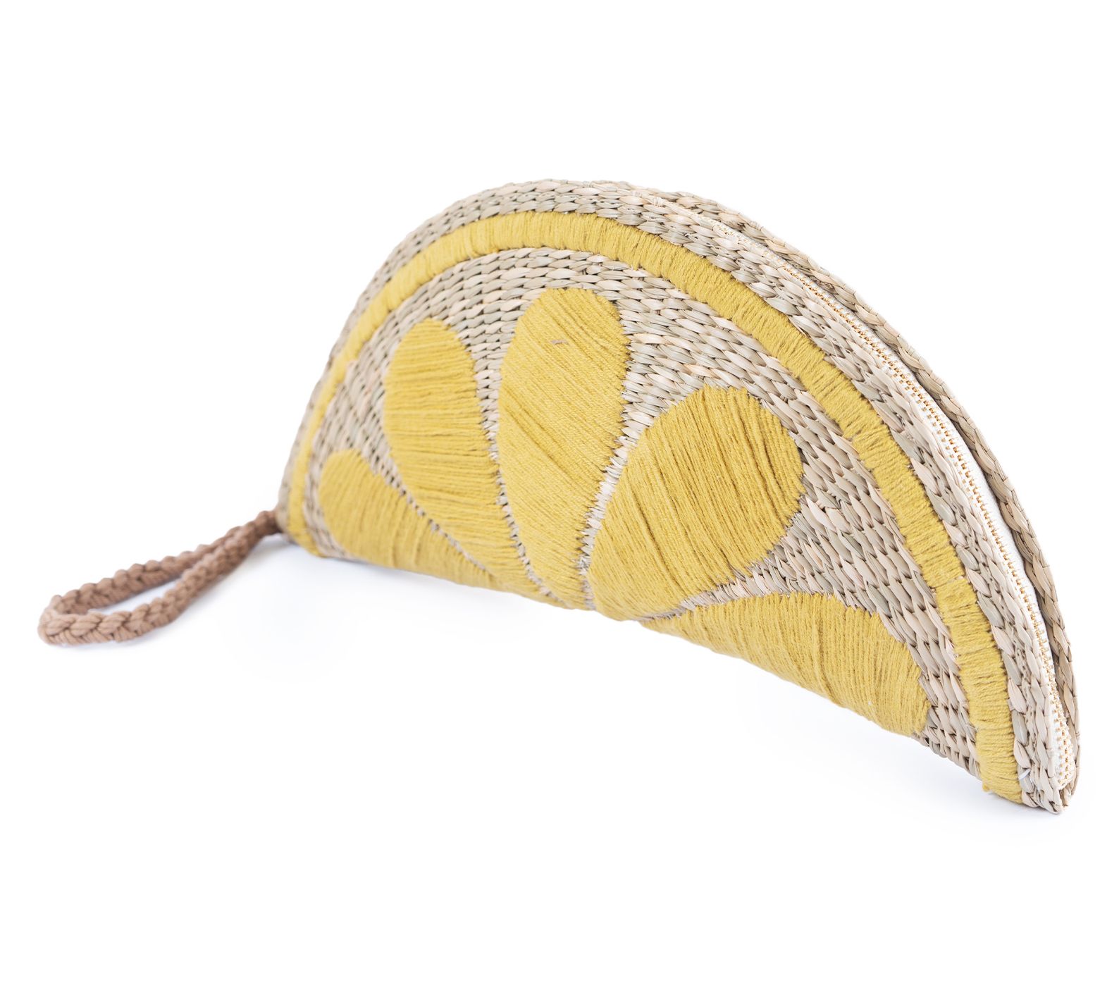 Whether headed to a rooftop party or a beachside brunch, this woven straw clutch instantly adds a playful pop to your look with its fruity stripes and eye-catching half-moon shape. The roomy interior offers space for your must-haves, while the zip top keeps everything secure as you move from day to night. From Jelavu.