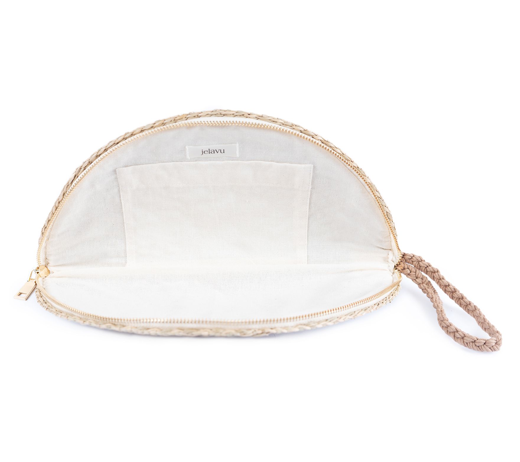 • Clutch style, zip-top closure, woven straw exterior, wrist strap, goldtone hardware