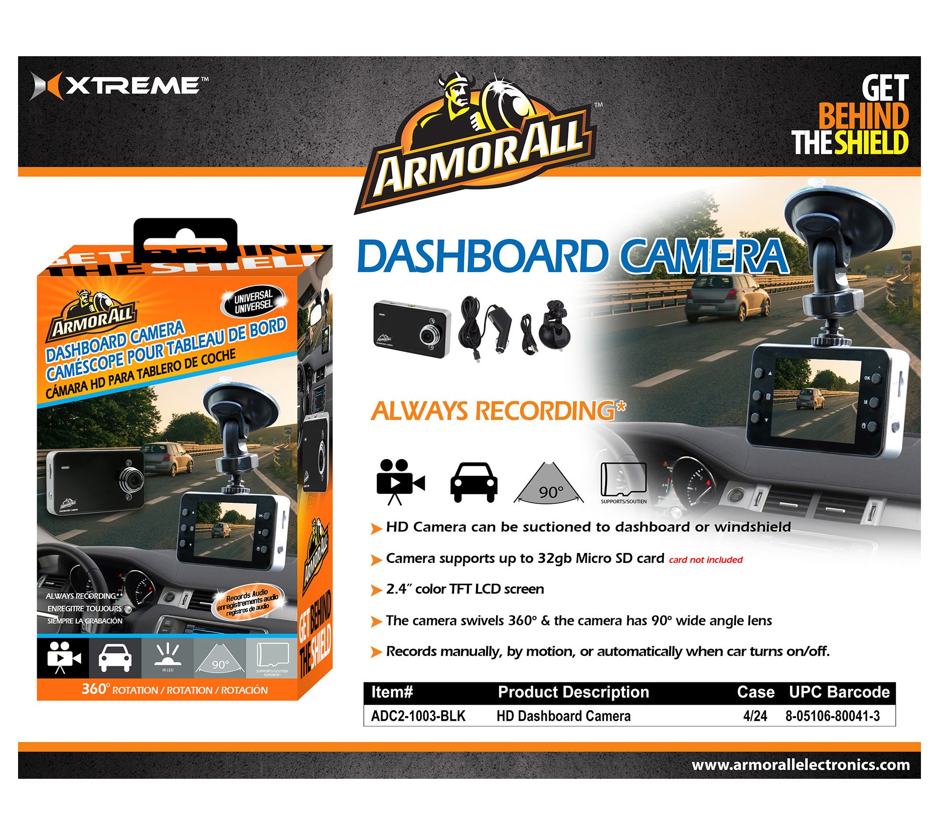 Keep eyes on the road with the ArmorAll Car Dashboard Camera. Complete with 360-degree swivel and 90-degree field-of-view, just place on your dashboard or windshield and you'll be able to easily monitor everything as you drive.