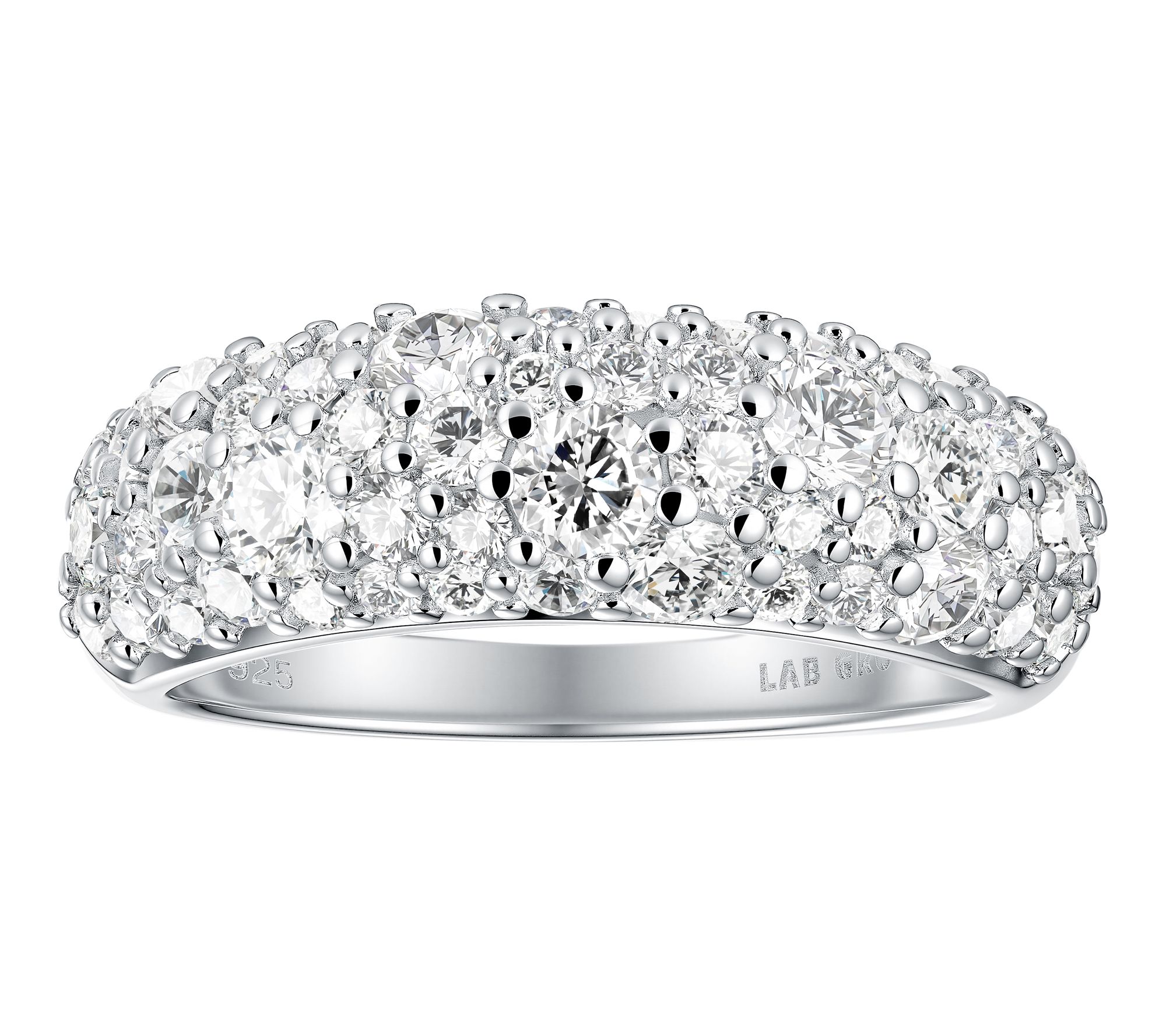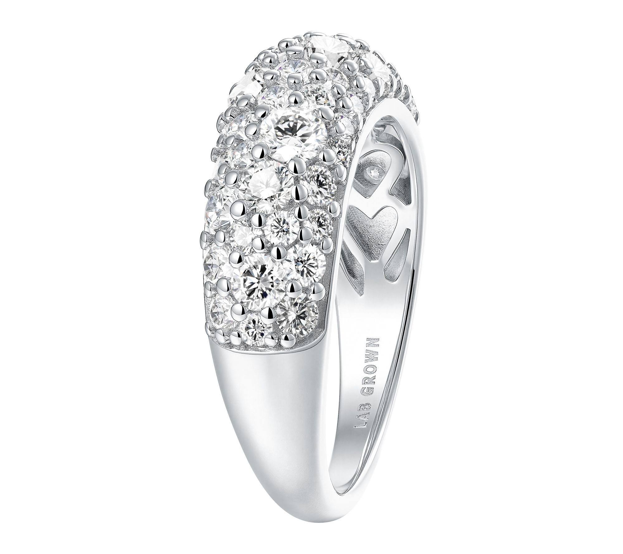 • Half-eternity-style band ring with cobblestone design; round-cut, pave-set lab-grown diamonds