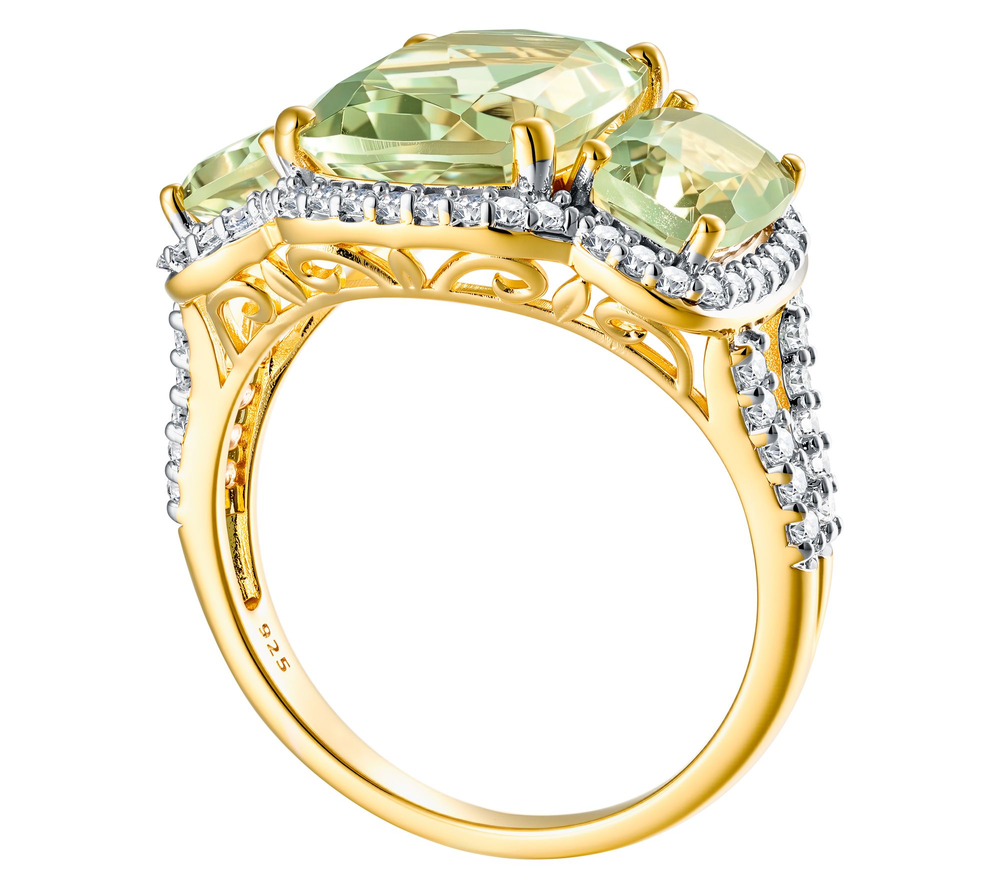 Prong-set emerald-cut prasiolite or pink amethyst center stones; white zircon halo; cocktail ring style