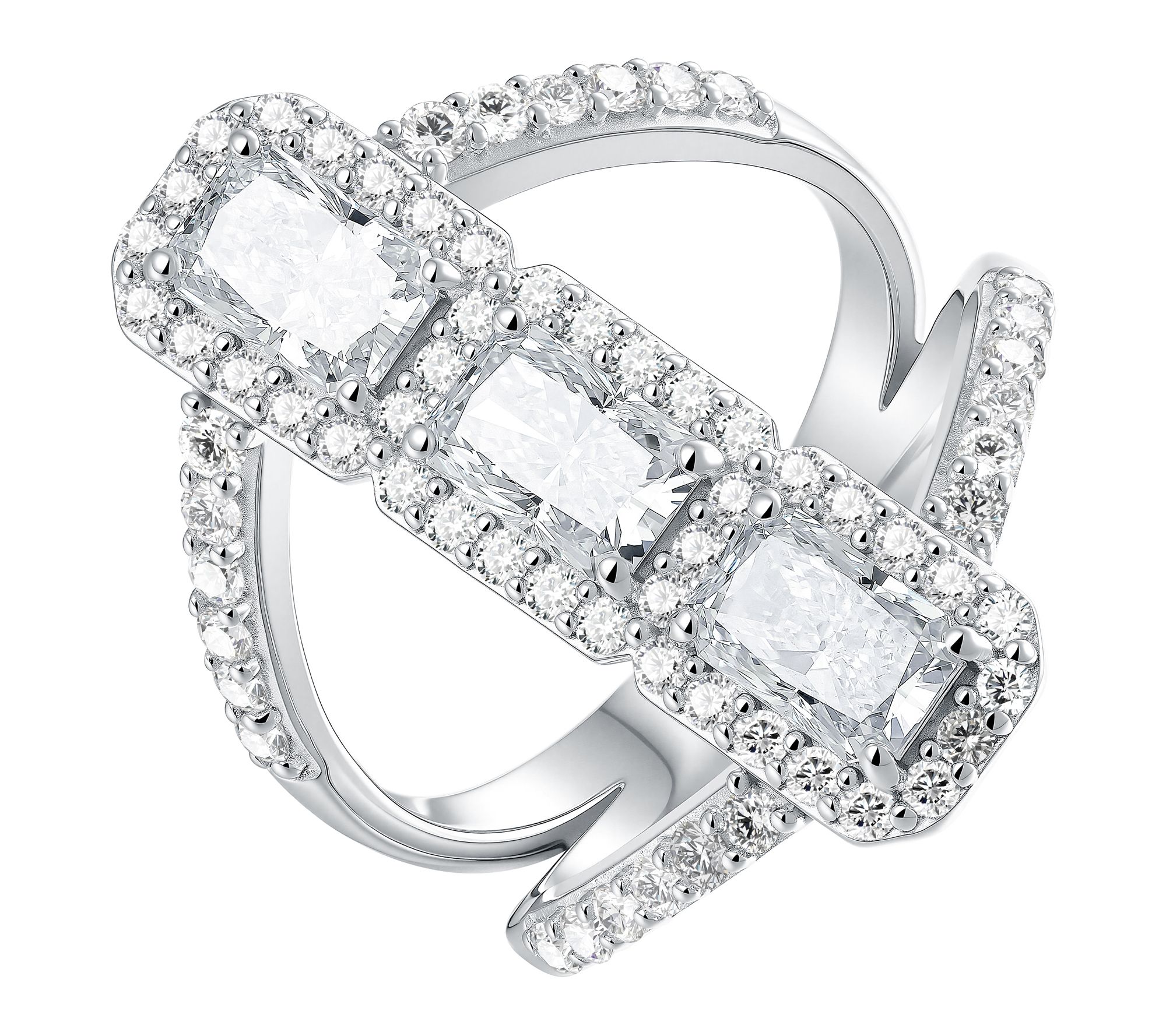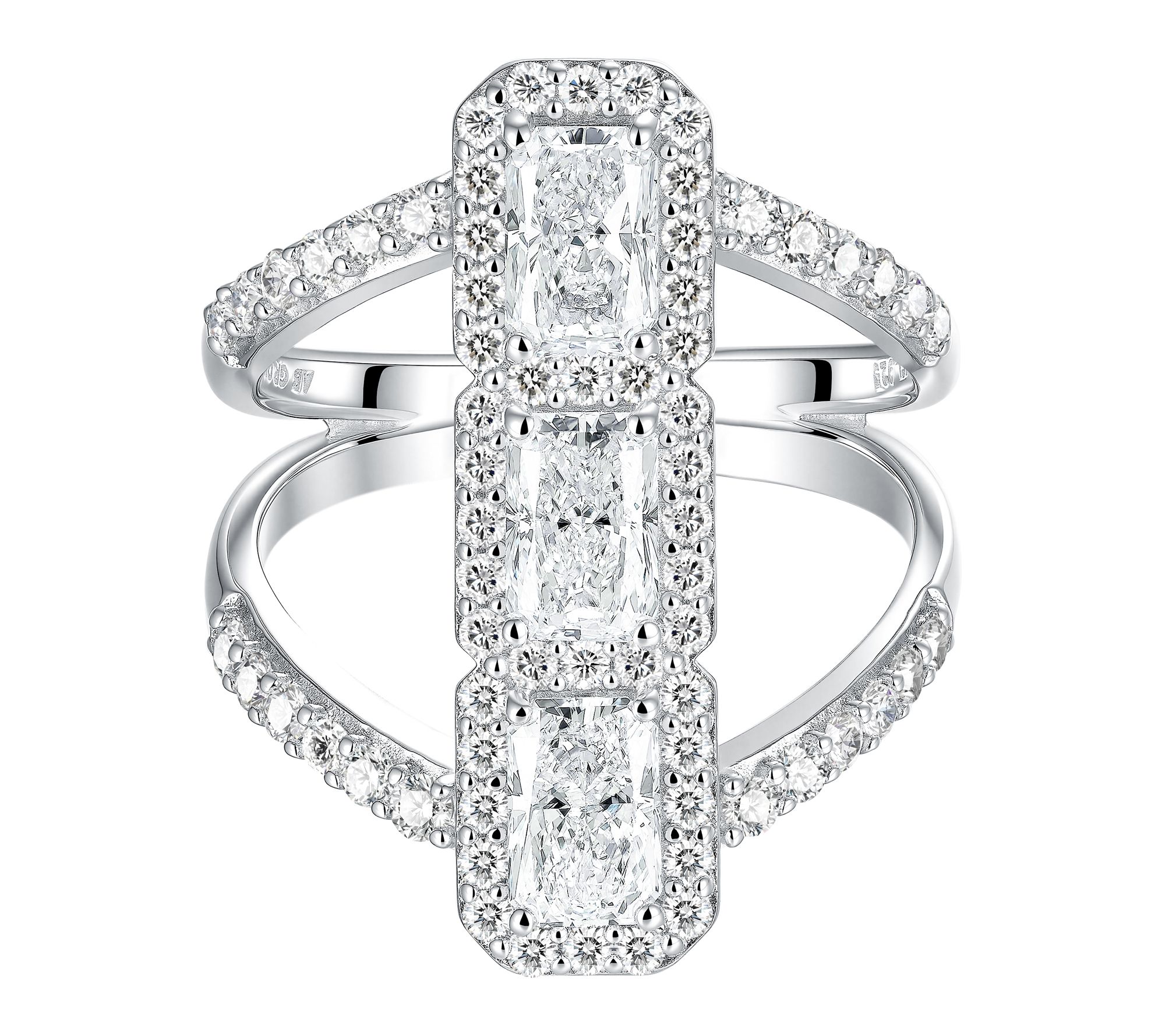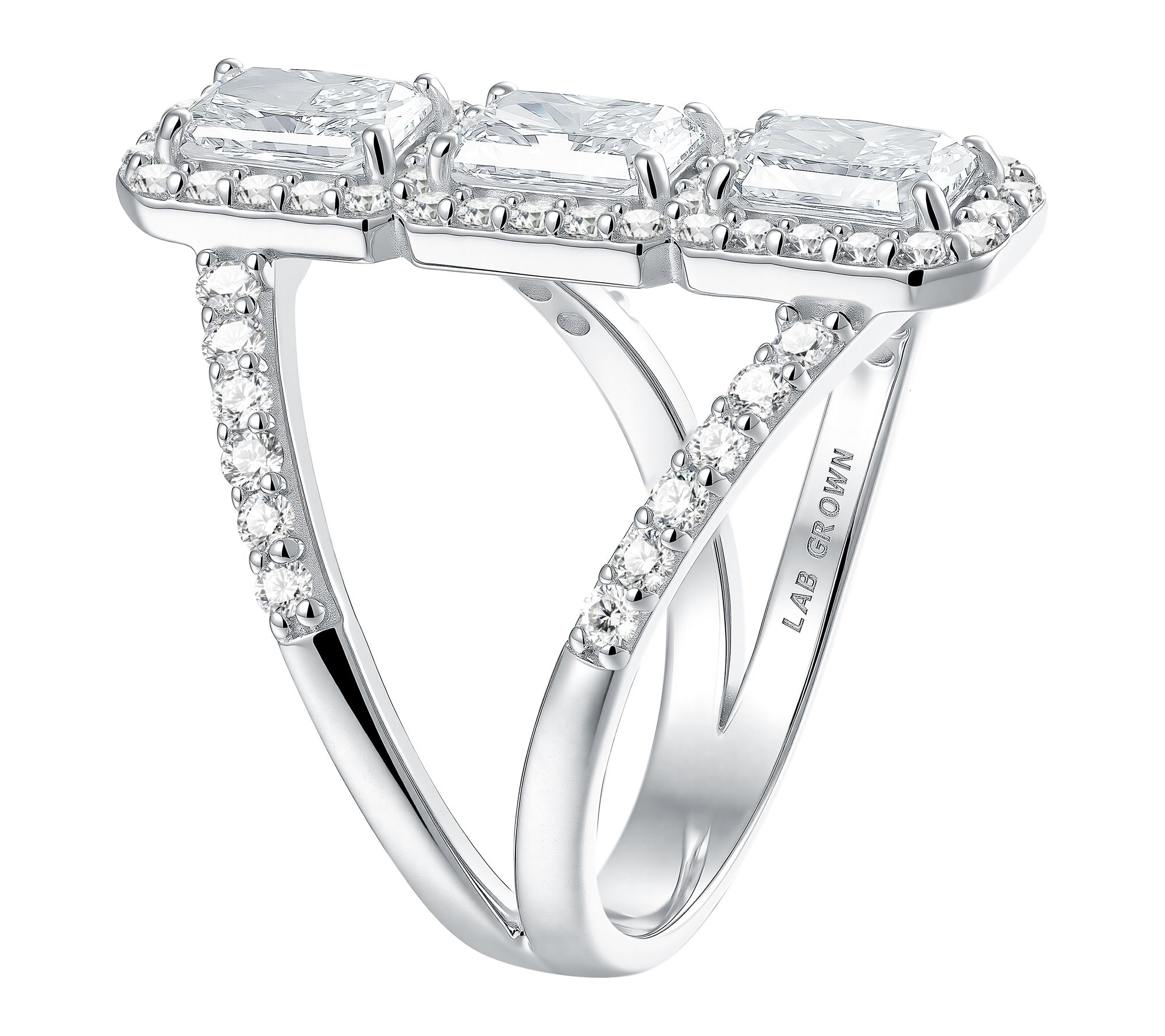 North/south design of three radiant-cut, prong-set lab-grown diamonds; halos of round, prong-set lab-grown diamonds; round, pave-set lab-grown diamonds along shank; polished