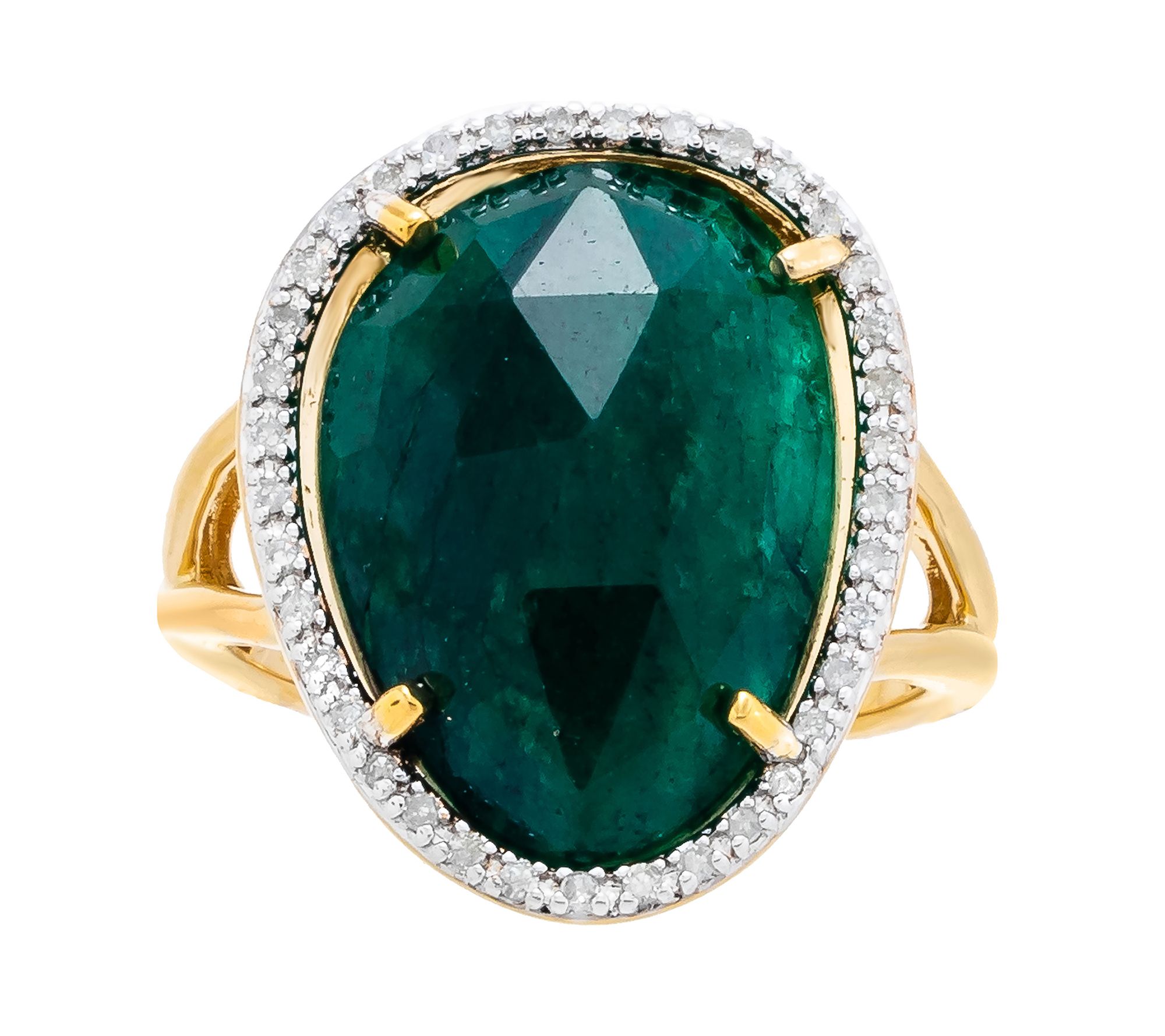 - Ring with freeform rose-cut, prong-set dyed green beryl gemstone center and round-cut diamonds surrounding it; polished finish