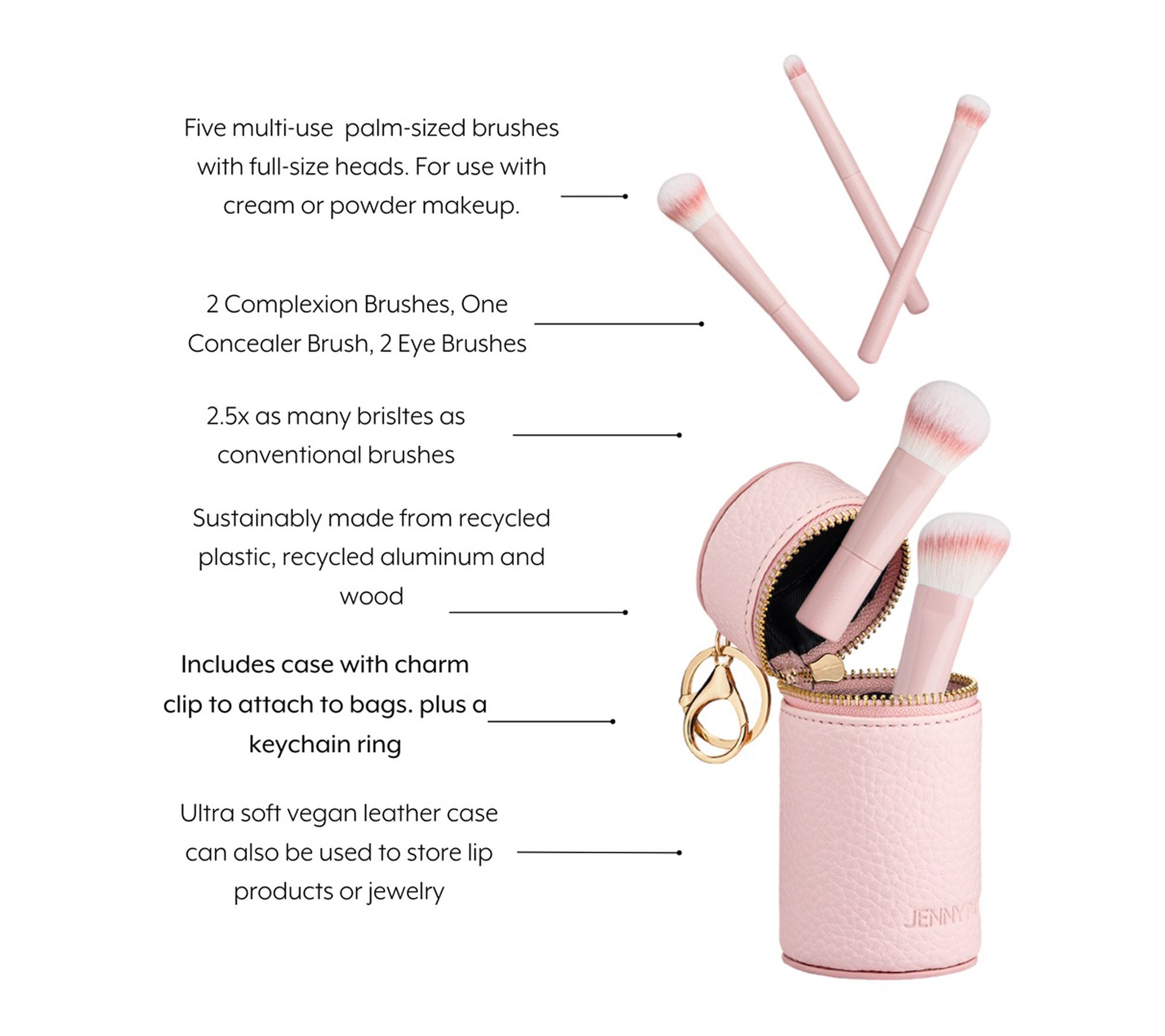 This Charmed, I'm Sure multi-purpose mini makeup brushes are for complexion and eyes. The full sized brush heads feature weighted handles. Brushes have many bristles for a super-smooth application and luxurious feel. Brushes are for use with cream or powder products. The set comes with a chic pink cylinder case. From Lazy Perfection.