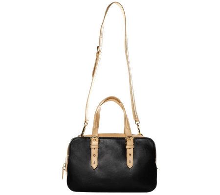 • Double handles, adjustable/removable shoulder strap, goldtone hardware, bottom feet