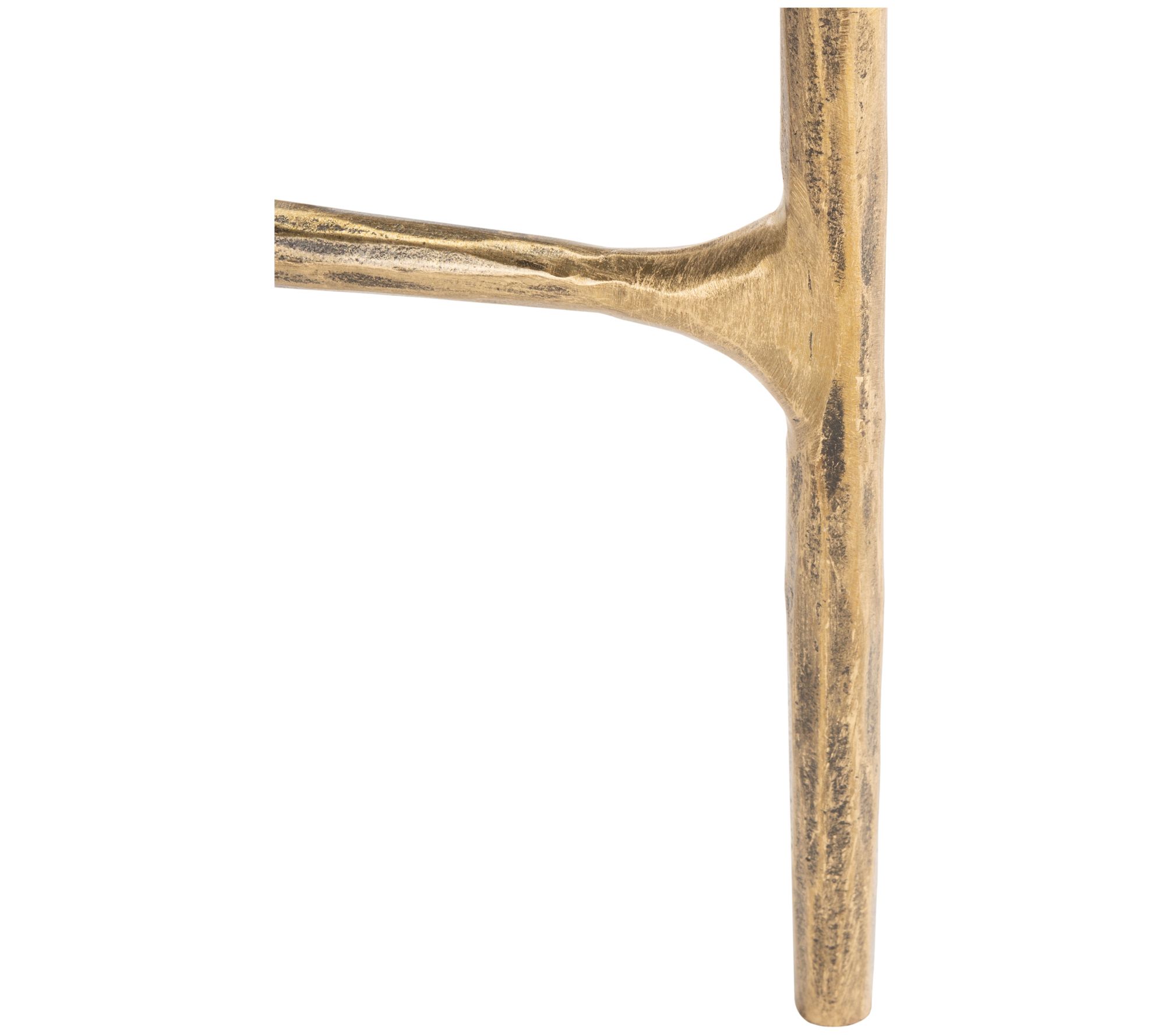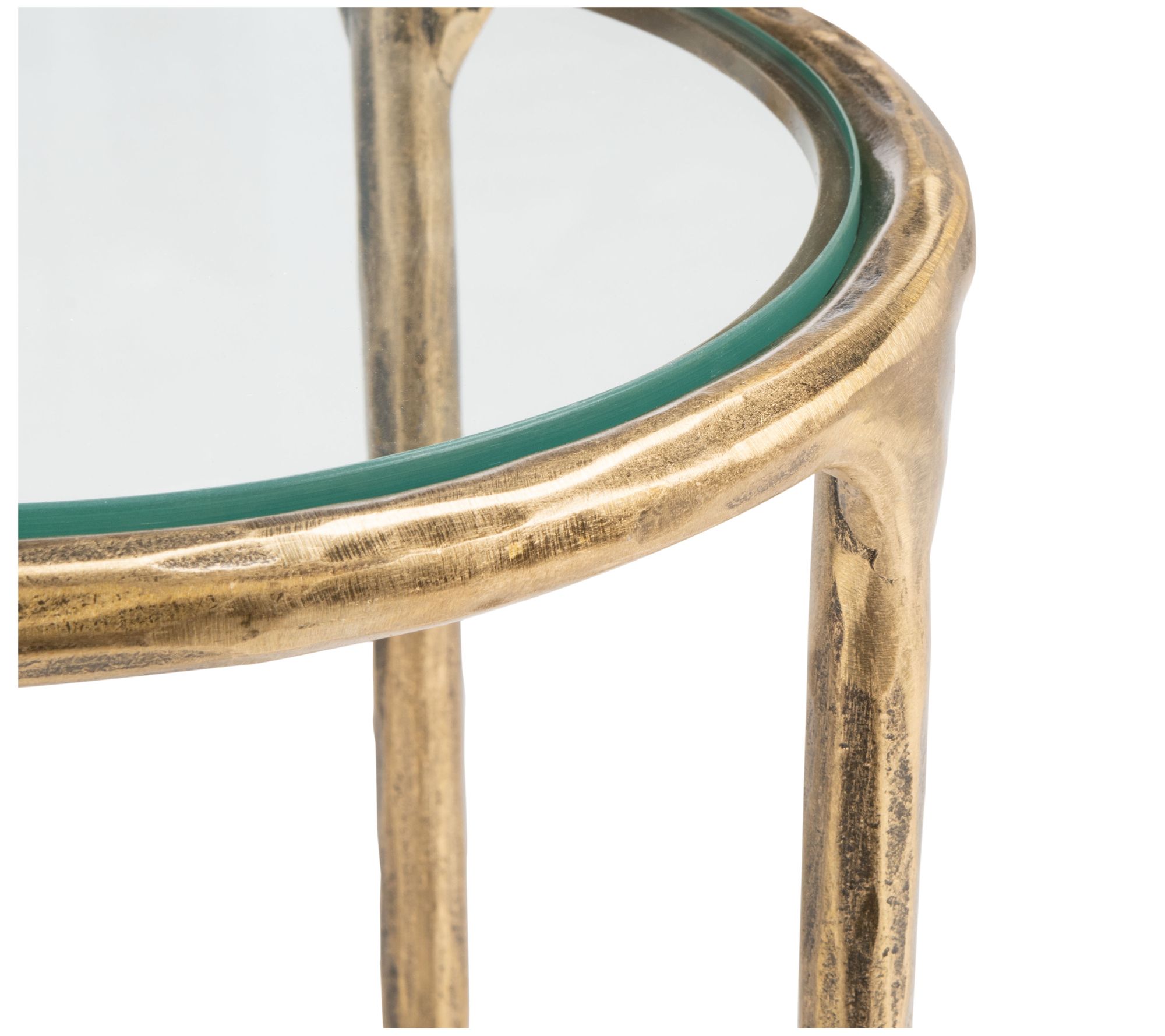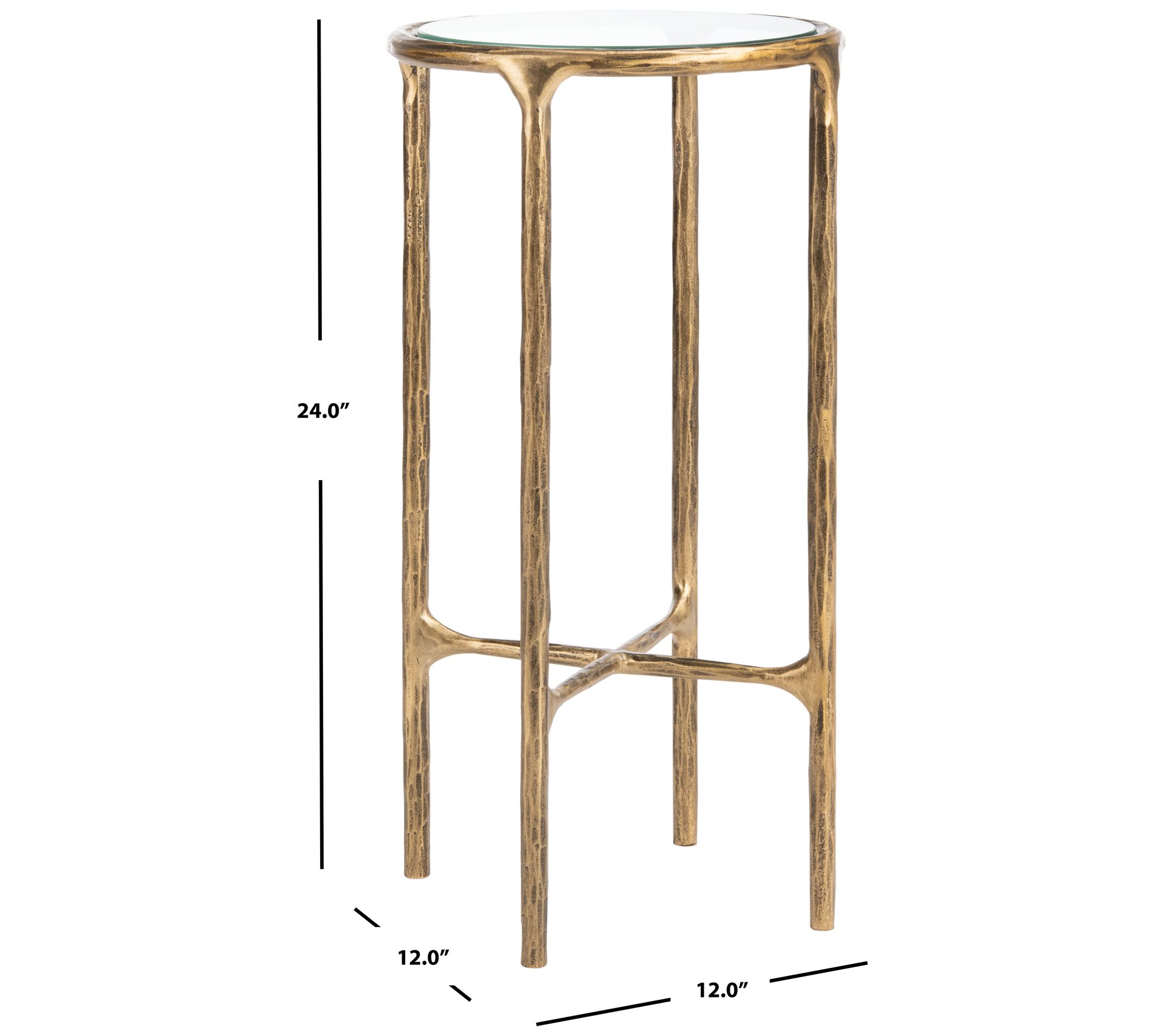 Elevate your home decor with the Jessa Forged Metal Tall Round End Table by Valerie. This chic piece brings aristocratic glamour to any room with its shining open brass frame and sleek tempered glass top. Perfect for modern interiors, it features a crossed stretcher for added elegance. From Valerie.