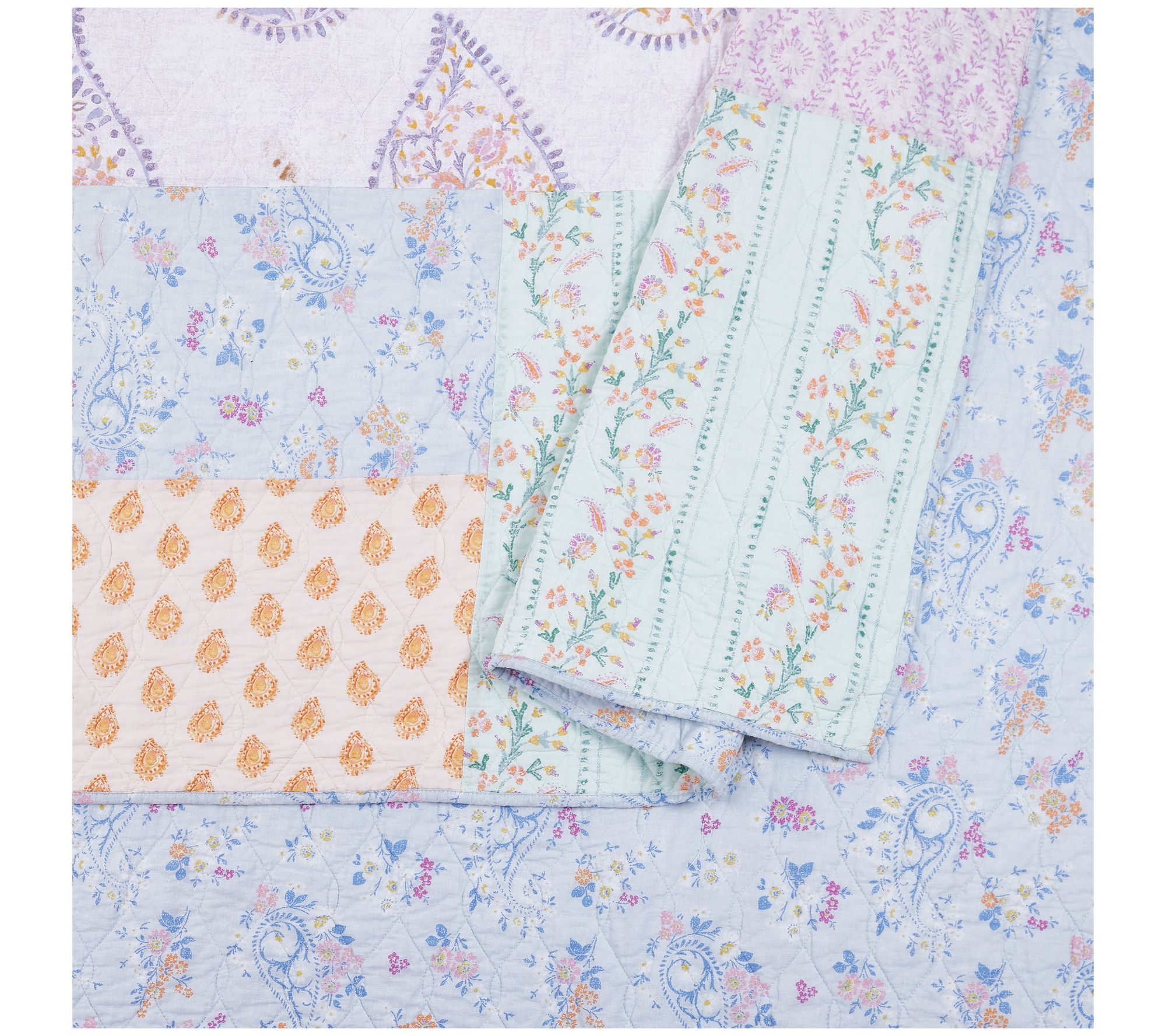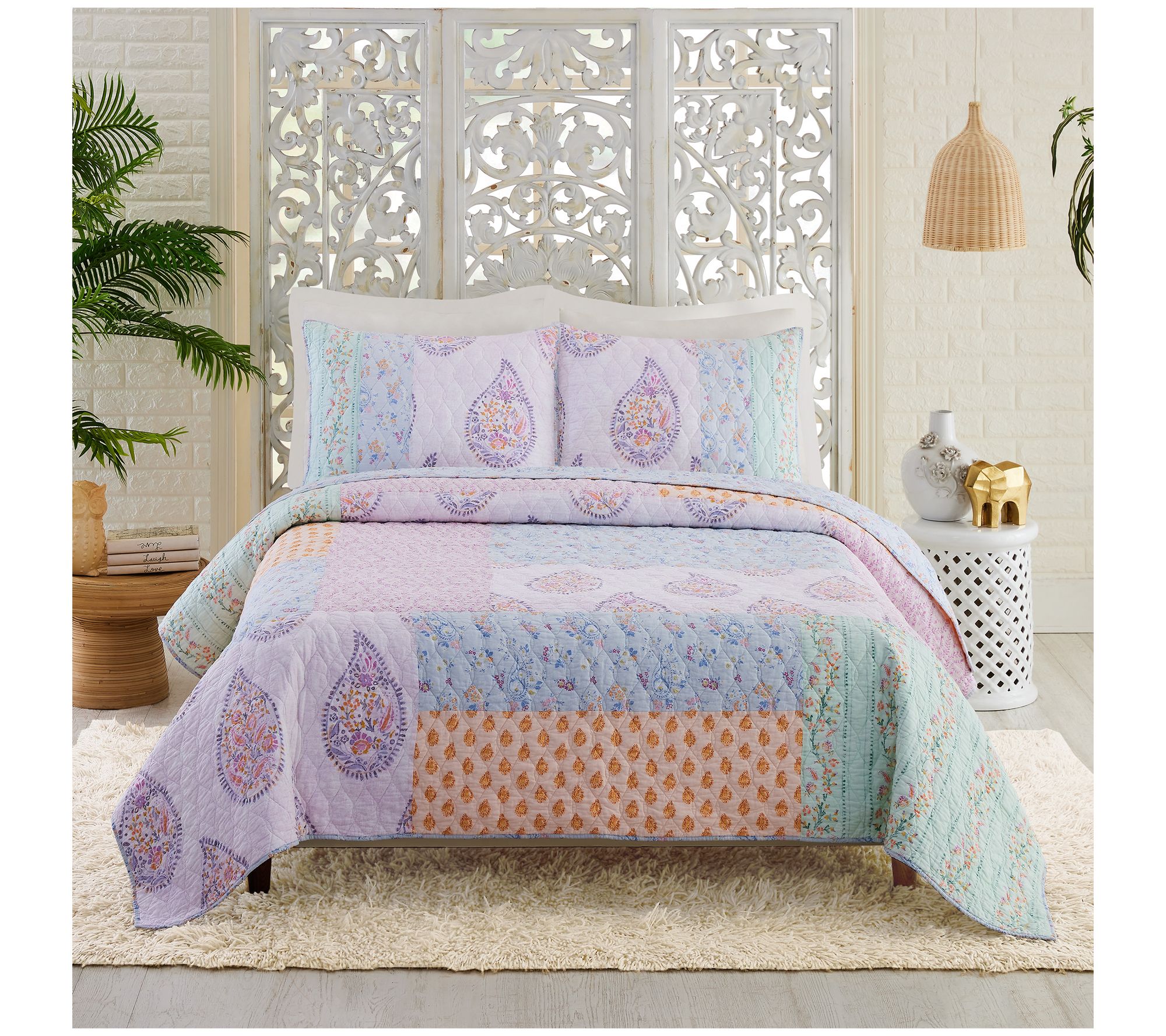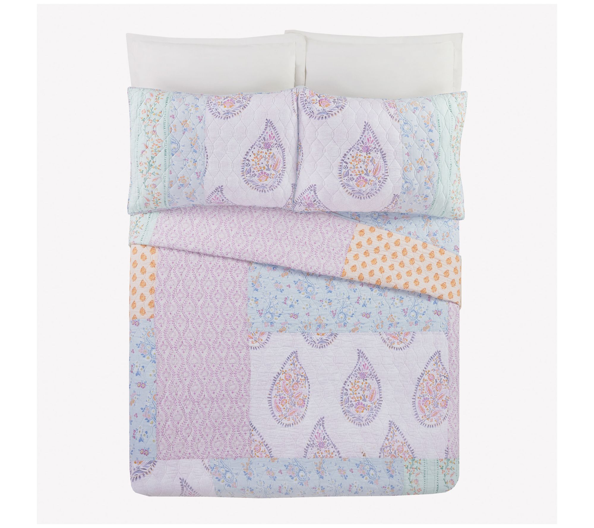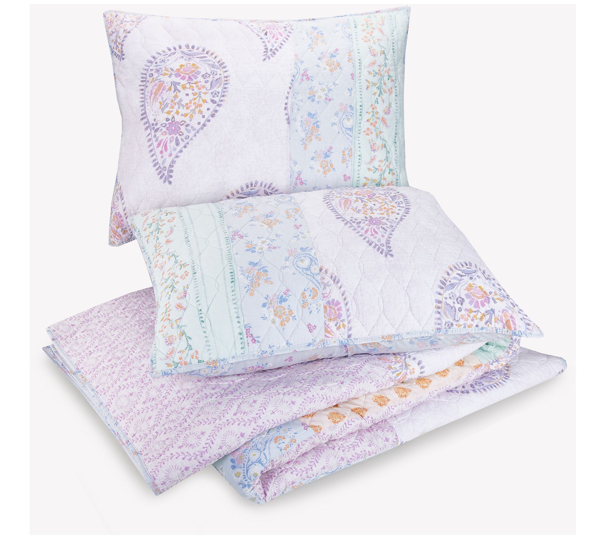 Drift off to sleep on a patchwork of dreamy pastels with this Thornhill quilt set. Beautiful paisley and floral prints in lovely hues combine to create a stylish boho look. Finishing off the design is an allover vermicelli quilting that adds subtle texture and dimension. From Jessica Simpson.