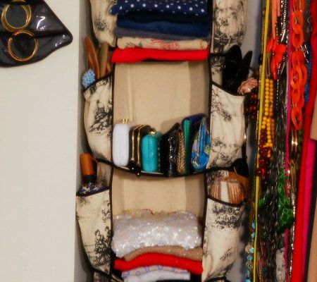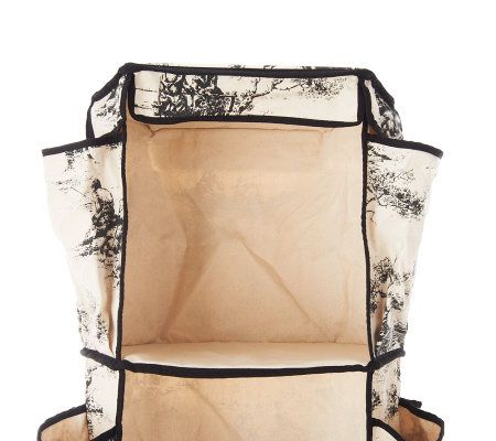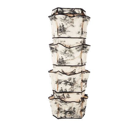 A new spin on organization. Done in fabulous printed canvas, this hexagonal closet organizer is suspended from a silvertone metal hook that rotates a full 360 degrees, so you can pick out your ensemble in a snap. Just hang up the organizer, sort your wardrobe amongst its four shelves and 20 pockets, and give it a whirl! From Jill Martin.