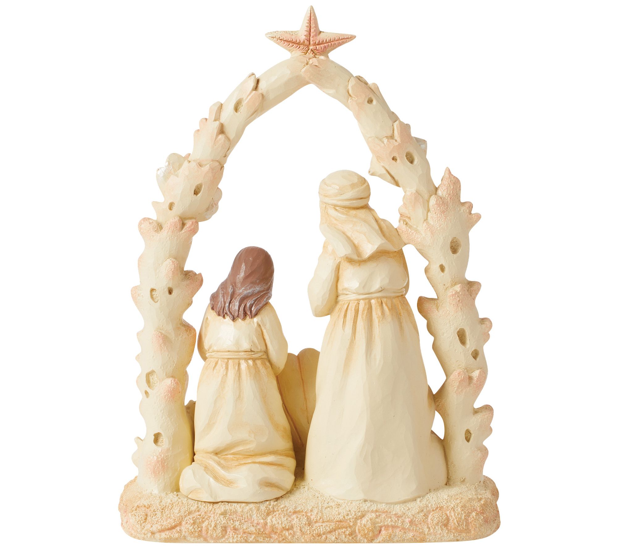 Showcase your personal faith during the Christmas season when you display this enchanting coastal nativity figurine. Inspired by the sea, the holy family rests under a creche constructed from seashells, with baby Jesus peacefully sleeping inside an open clam shell upon the sand. From Jim Shore.