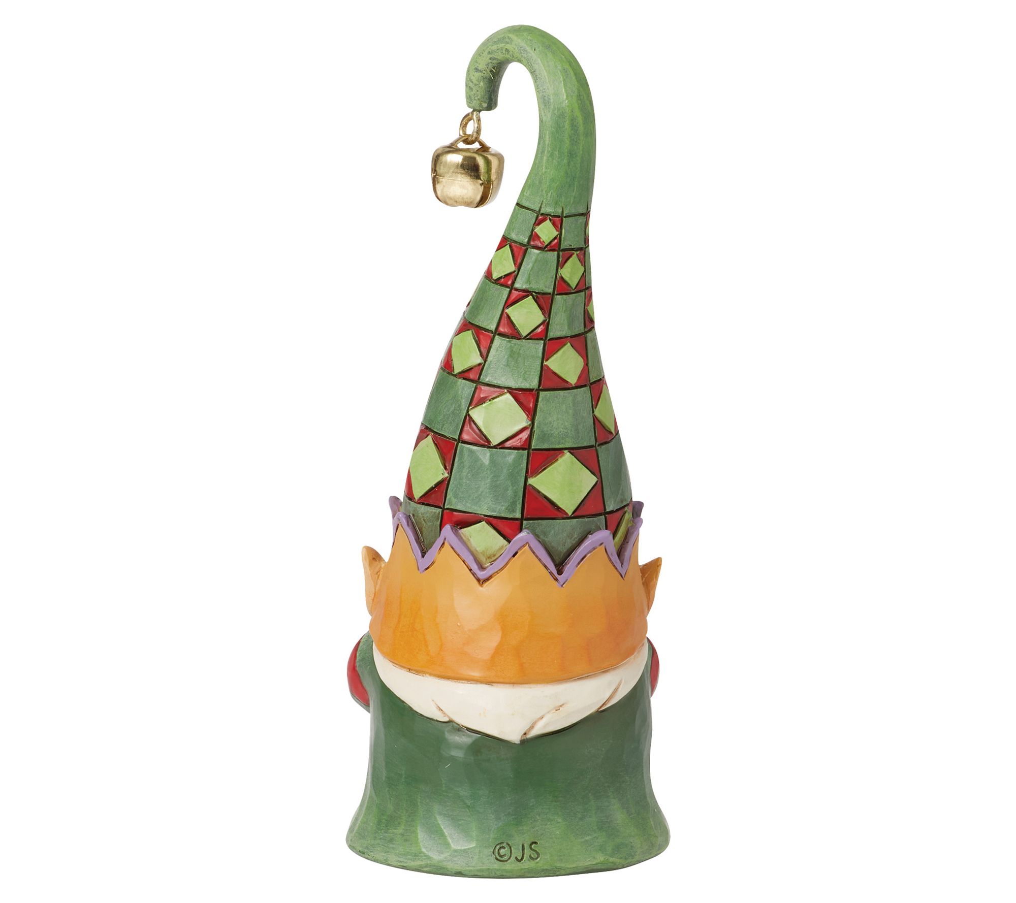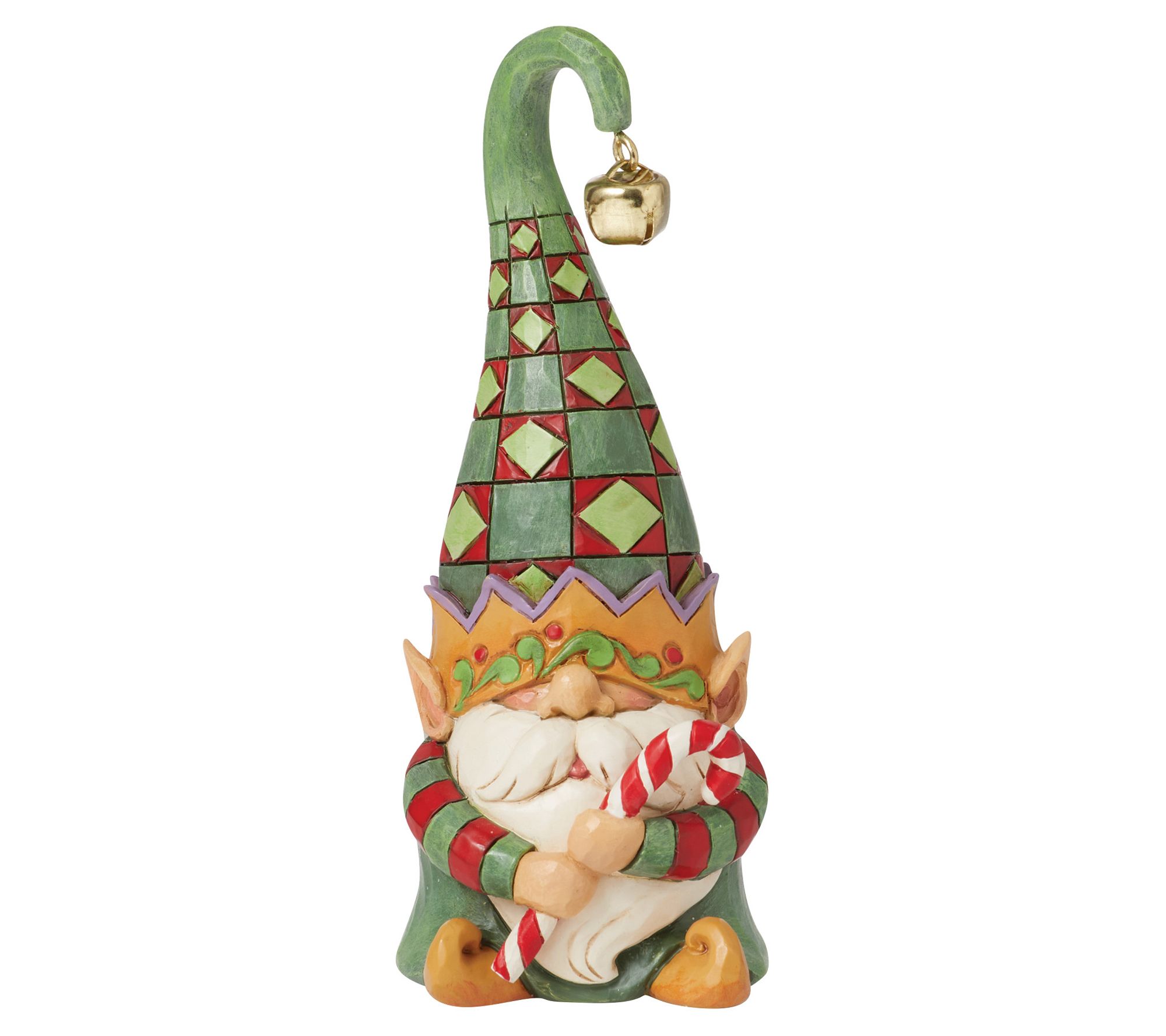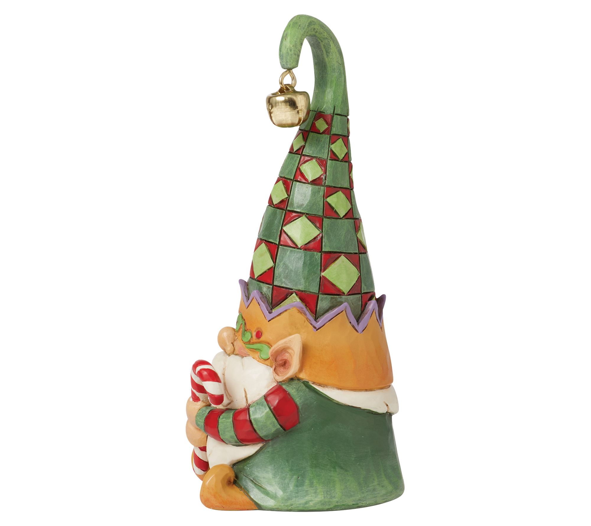 Bring a touch of whimsy to your holiday decor with this charming gnome elf figurine. Clad in a festive red and green patterned hat adorned with rosemale details and a jingle bell, this elf captures the spirit of Christmas with his adorable ears, long white beard, and a candy cane held with care. A delightful addition to any festive display. From Jim Shore.