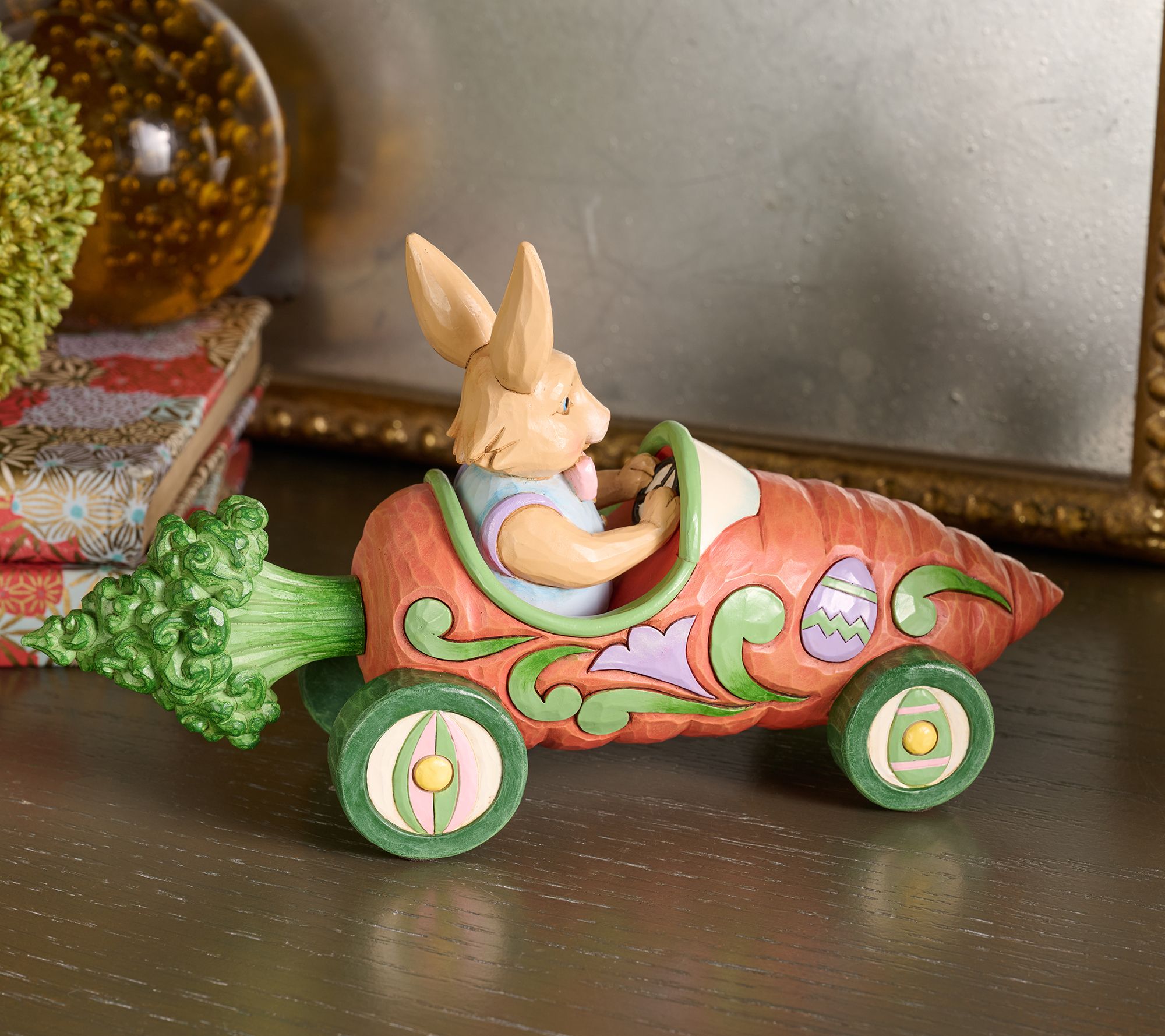 Start your Easter celebration with a dash of whimsy -- this Jim Shore Heartwood Creek Carrot Cruiser figurine captures a bunny racing in a vibrant carrot-shaped car. Display it on a mantel or tabletop for an energetic nod to spring, delighting guests and adding cheerful charm to your holiday decor. From the Heartwood Creek Collection by Jim Shore.