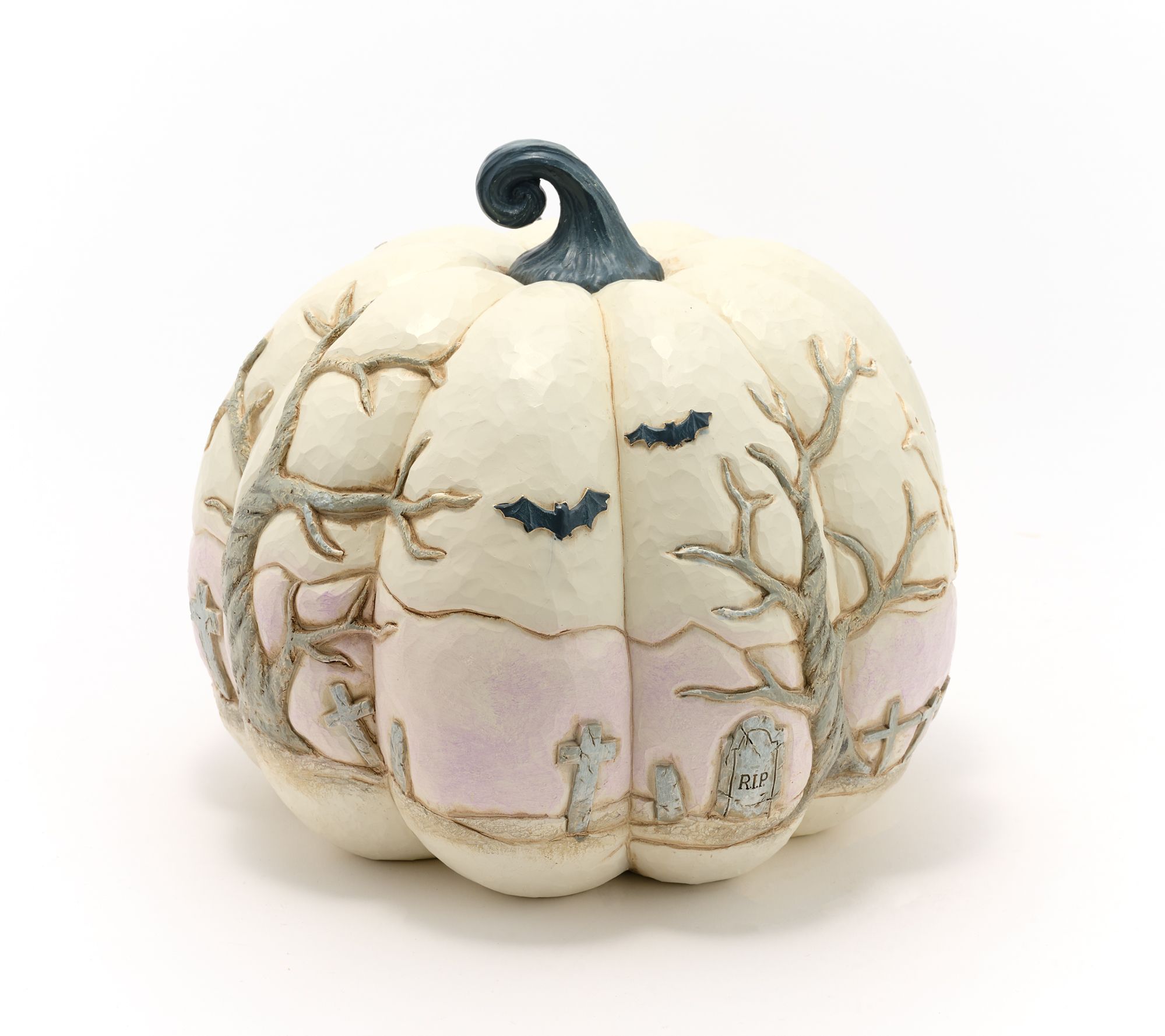 • Features white pumpkin figurine with detailed haunted graveyard, haunted house, bats, and full moon
