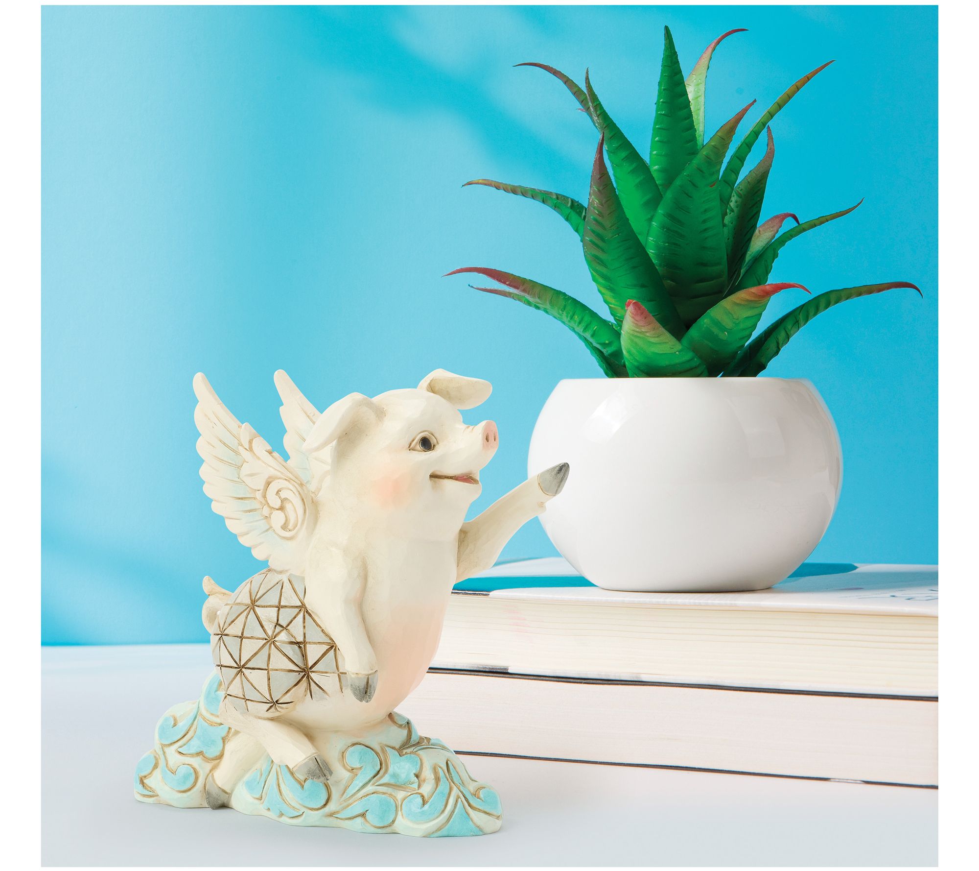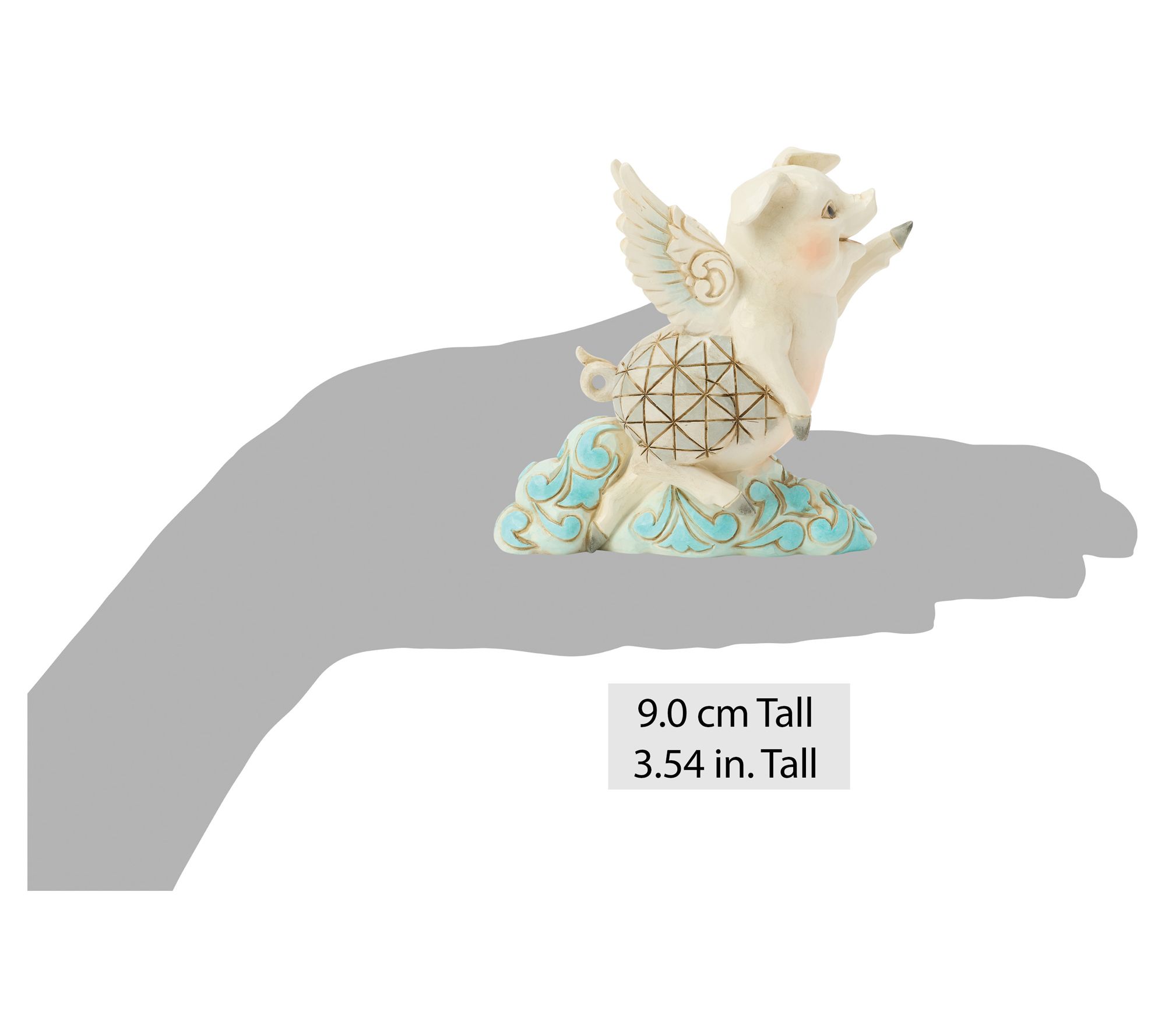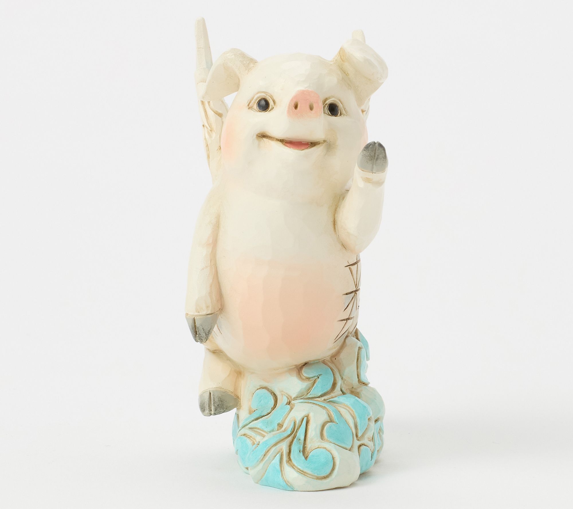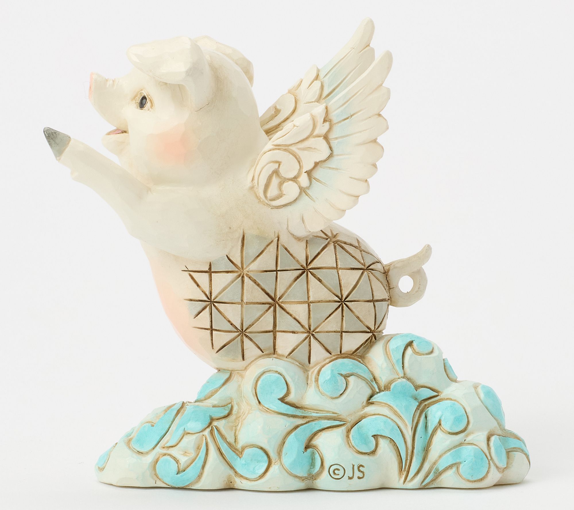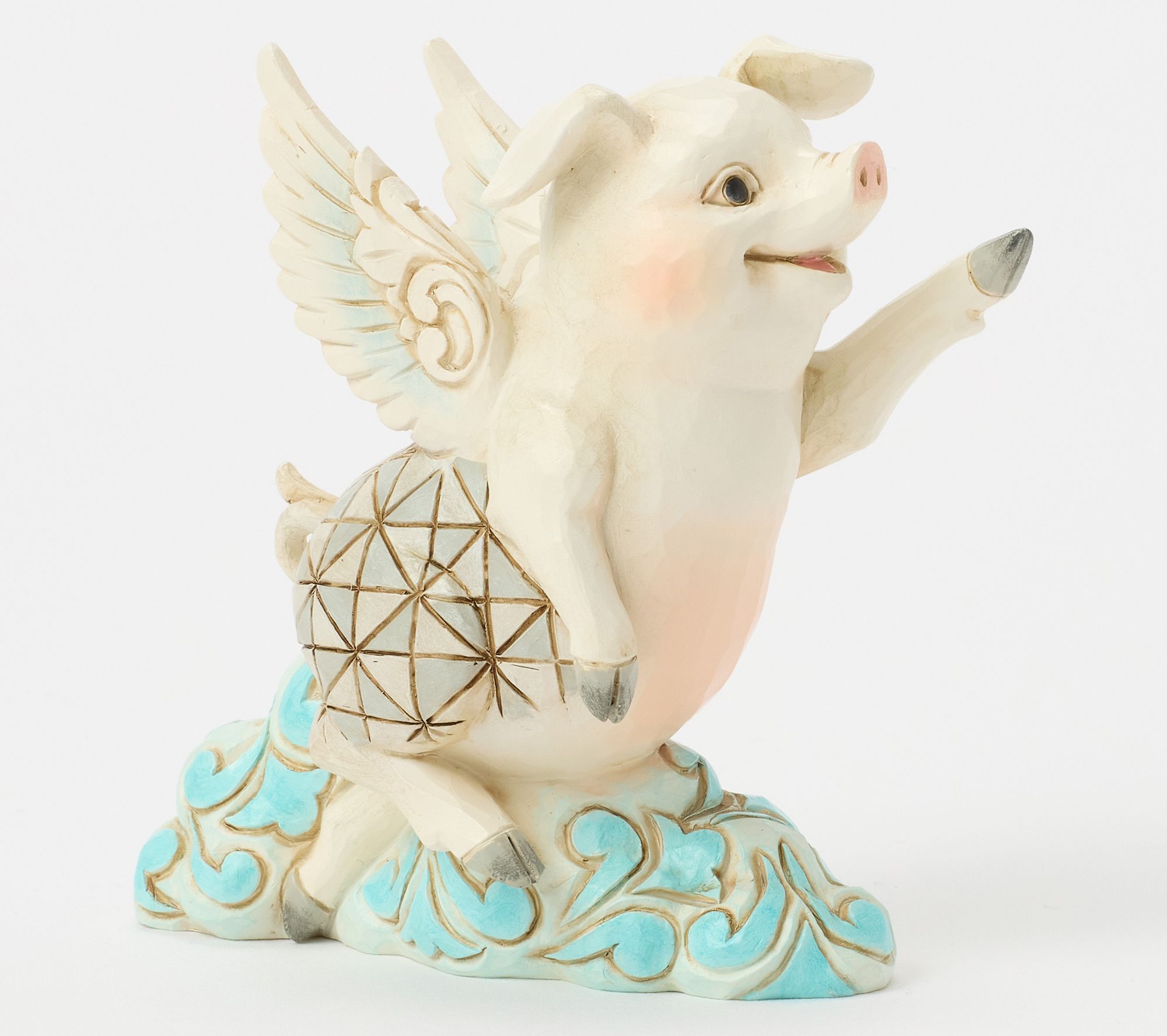 Adding a touch of whimsy to your shelf, this flying pig figurine by Jim Shore Heartwood Creek celebrates dreams in the most cheerful way. Detailed with rosemaling clouds and outstretched wings, it brightens any space with inspiration and charm -- whether as a delightful gift or a conversation starter for your own collection. From the Heartwood Creek Collection by Jim Shore.