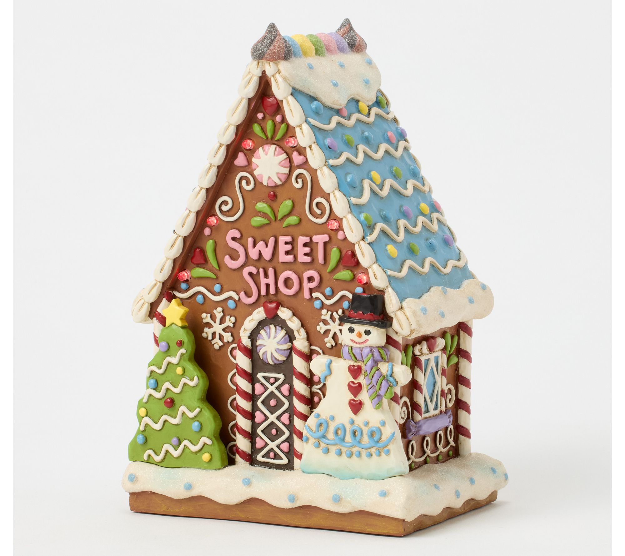 Beneath the soft glow of festive lights, this charming sweet shop brings the spirit of the holidays to your table or mantel. Colorful icing, candies, and cheerful gingerbread details invite sweet moments and warm memories, making it a delightful addition to your seasonal decor. Battery-operated LED illumination ensures it shines wherever you choose to display it. From the Heartwood Creek Collection by Jim Shore.