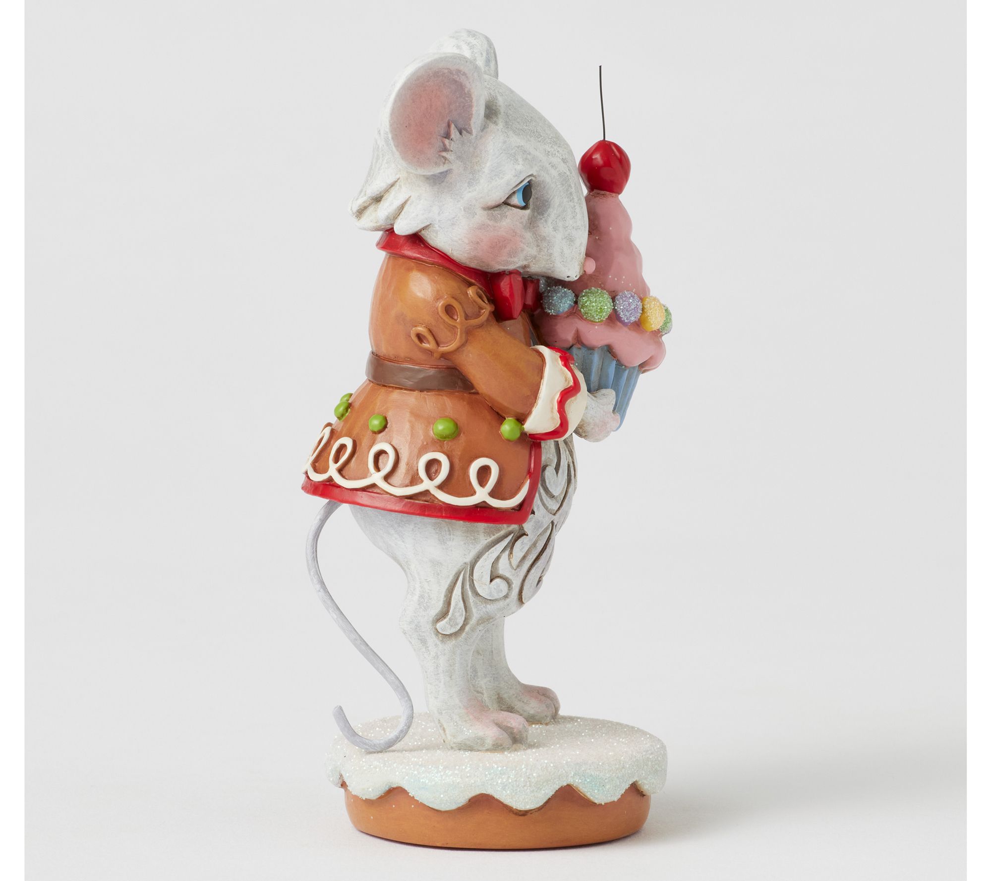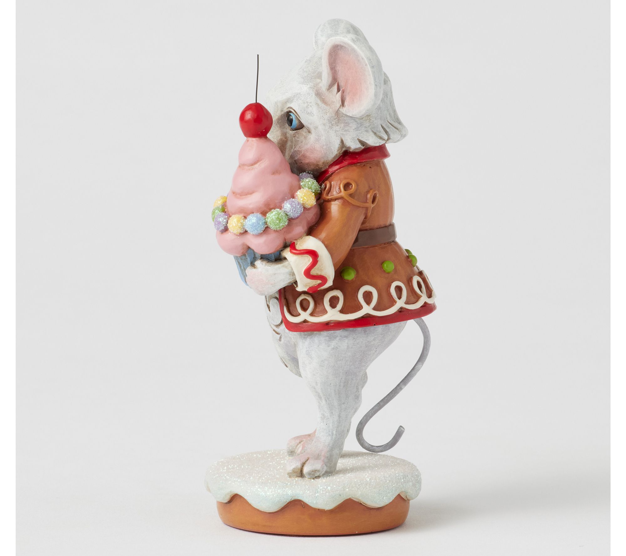 Brighten holiday shelves or tabletops with a cheerful scene -- a sweet mouse in a gingerbread coat offering you a cupcake topped with a cherry. Whimsical icing details and a playful spirit make it easy to share a little extra holiday joy, whether you display it alone or let it join your festive collection. From the Heartwood Creek Collection by Jim Shore.