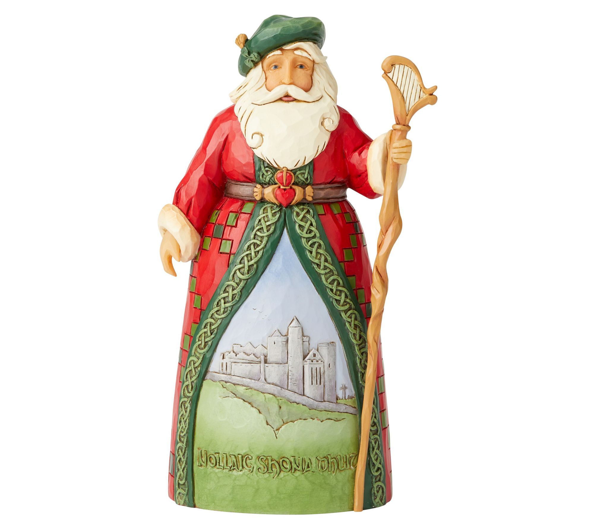 Celebrate your love for Ireland with this Heartwood Creek Santa figurine, a charming representation of Father Christmas adorned in his luckiest attire. From his newsboy cap to his claddagh clasped belt, this figurine showcases a beautifully detailed castle scene and a harp-topped staff, capturing the spirit of the Emerald Isle. A perfect addition to your holiday decor or a thoughtful gift for someone special. From Jim Shore.