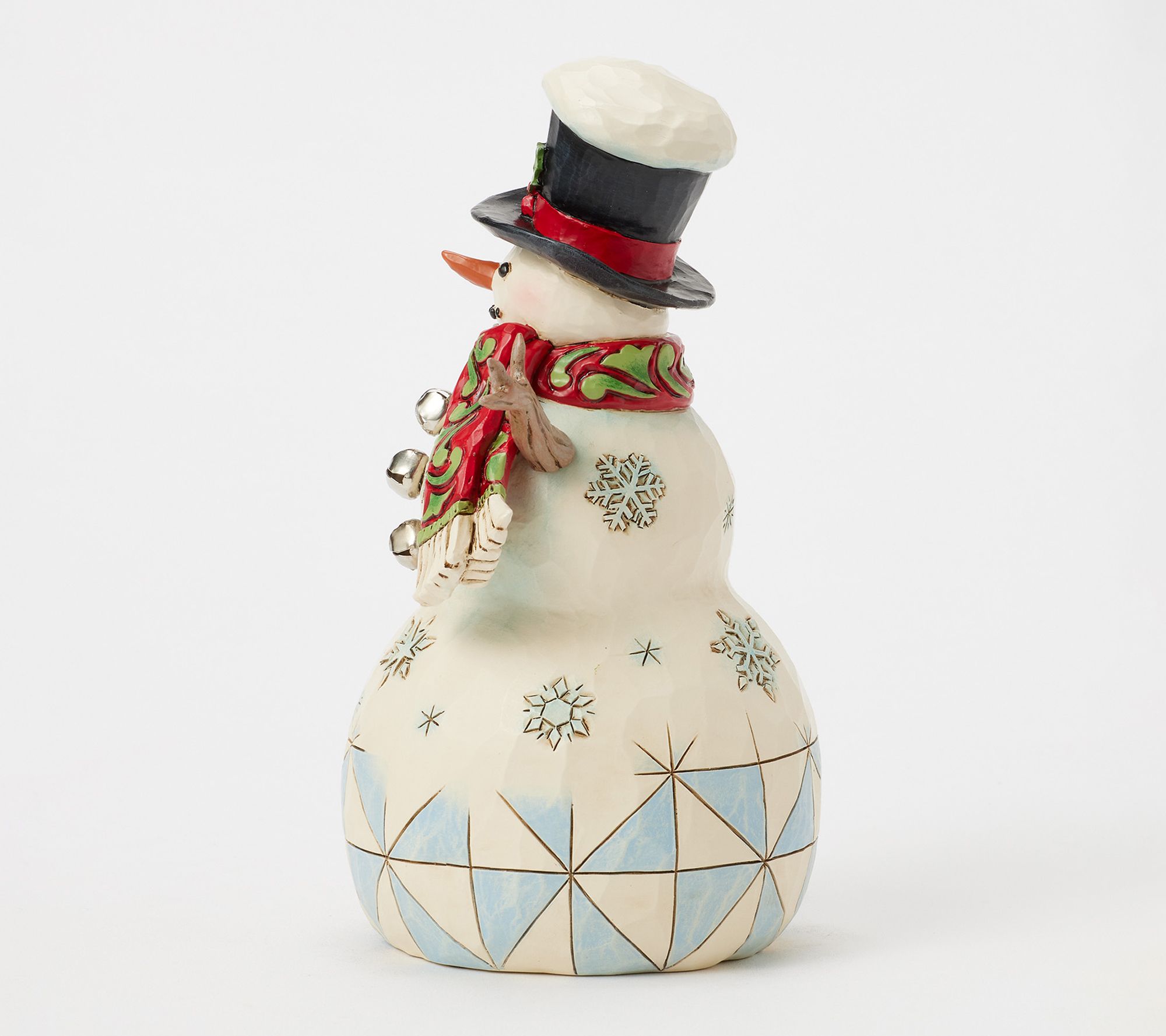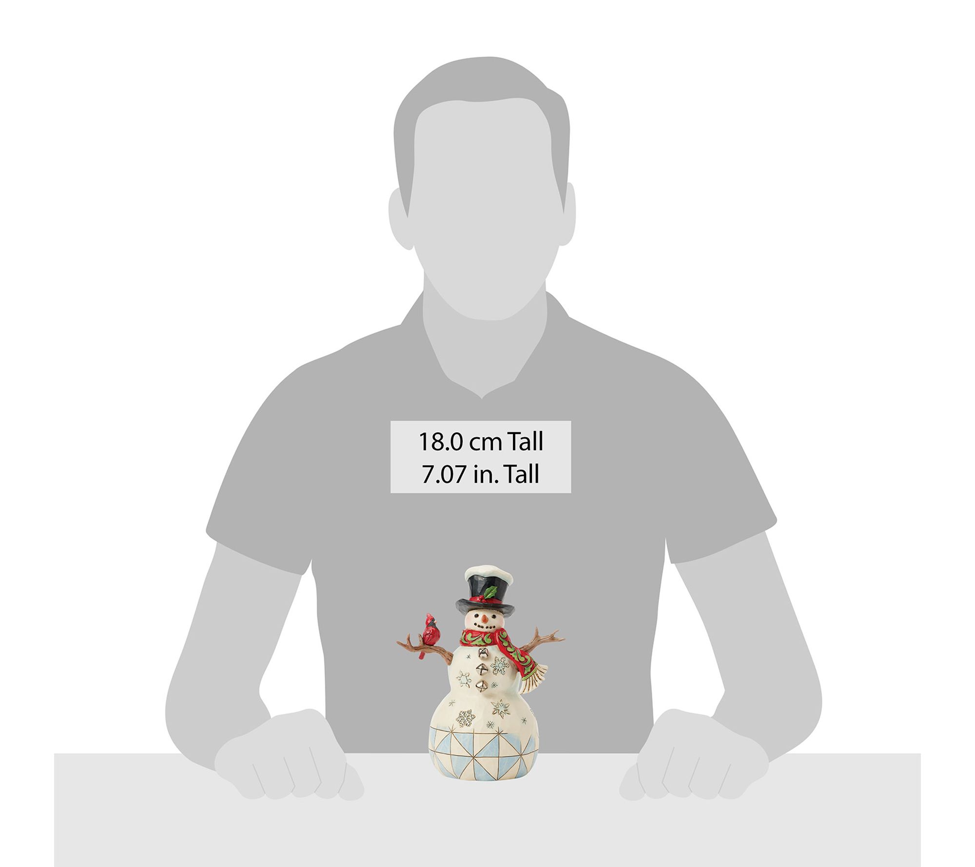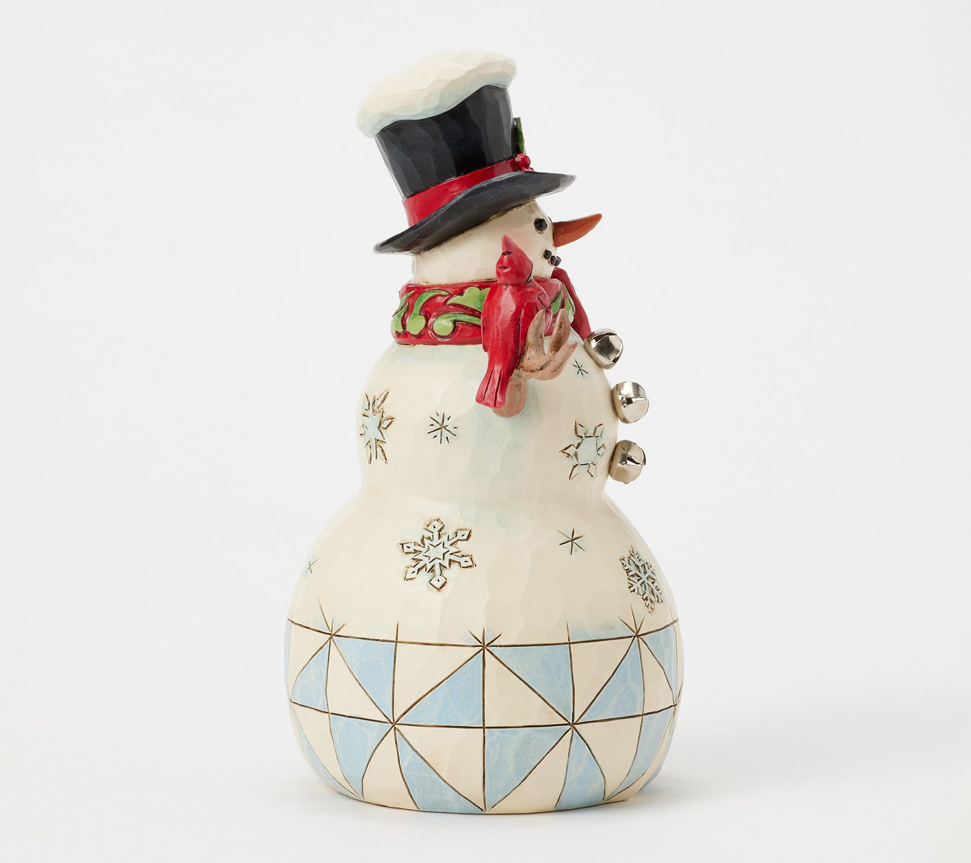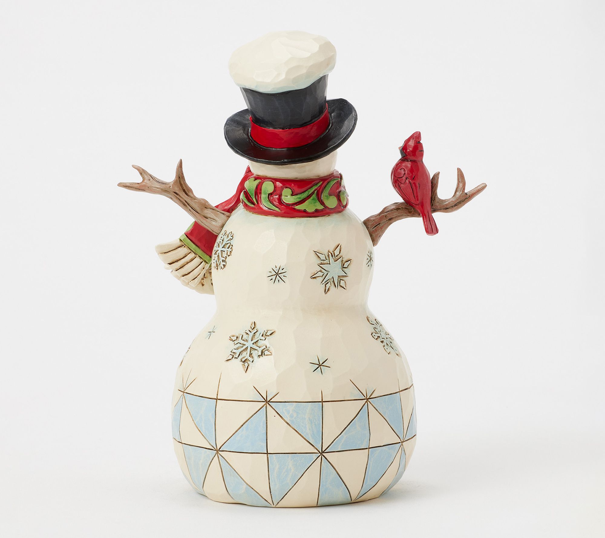 A cheery snowman figurine brings the warmth of the season to any holiday setting, with a vibrant cardinal perched on his arm and a scarf that dances with charming rosemaling accents. Gift it or display it on a mantel, entryway, or cozy tabletop to welcome in the joy of winter and festive tradition. From Jim Shore.