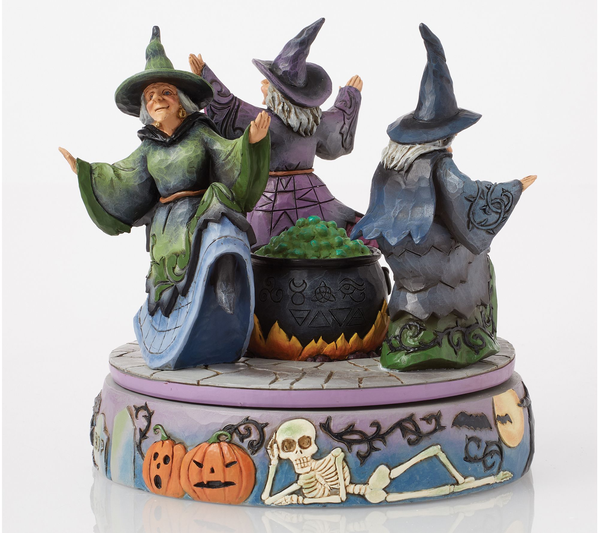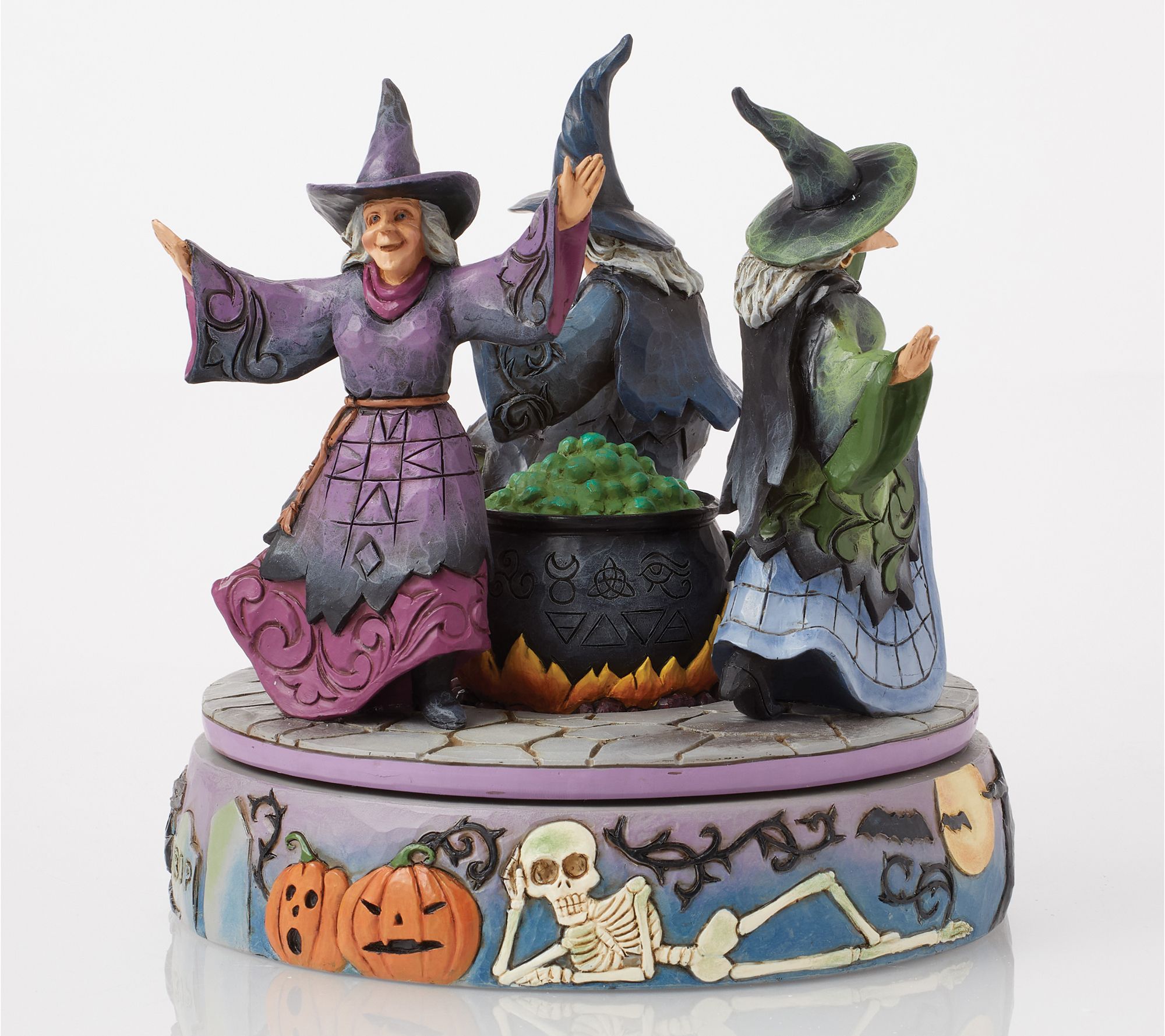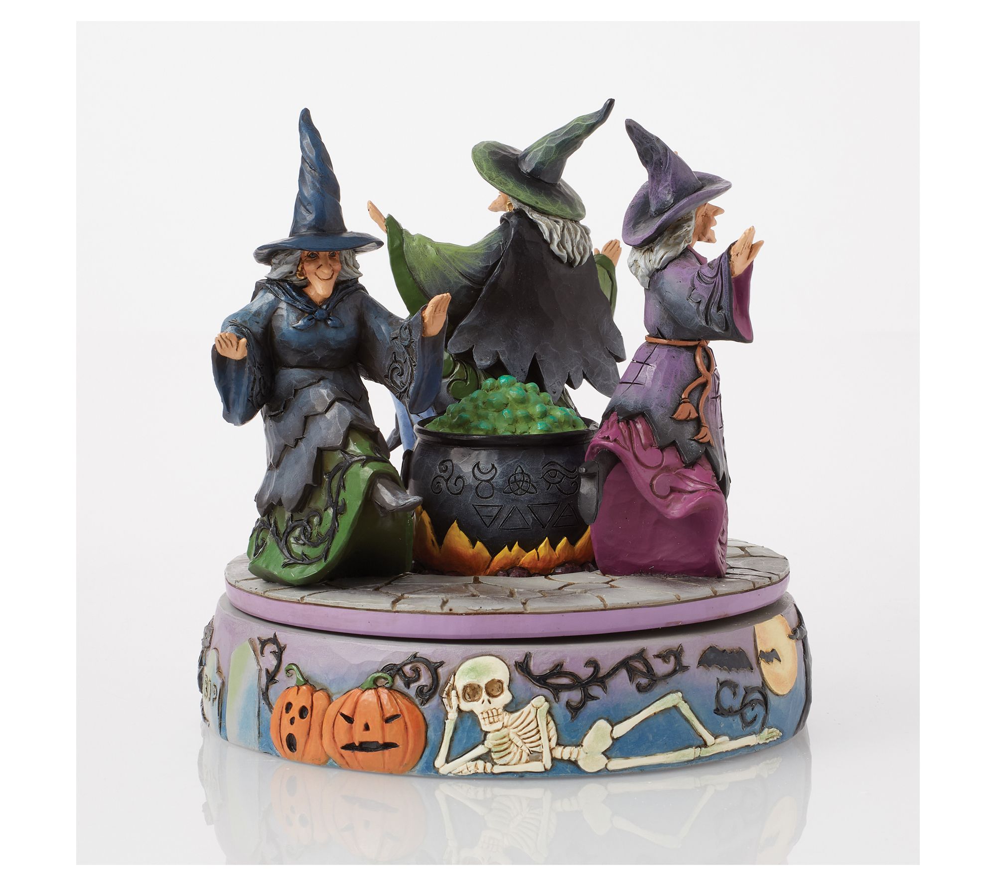 A sense of Halloween magic fills the air as three witches whirl around a bubbling cauldron, drawing curiosity and delight from all who pass by. Decorated with charmingly spooky touches like jack-o'-lanterns, skeletons, black cats, and more, this rotating cauldron figurine brings a playful spirit to your seasonal display. From the Heartwood Creek Collection by Jim Shore.
