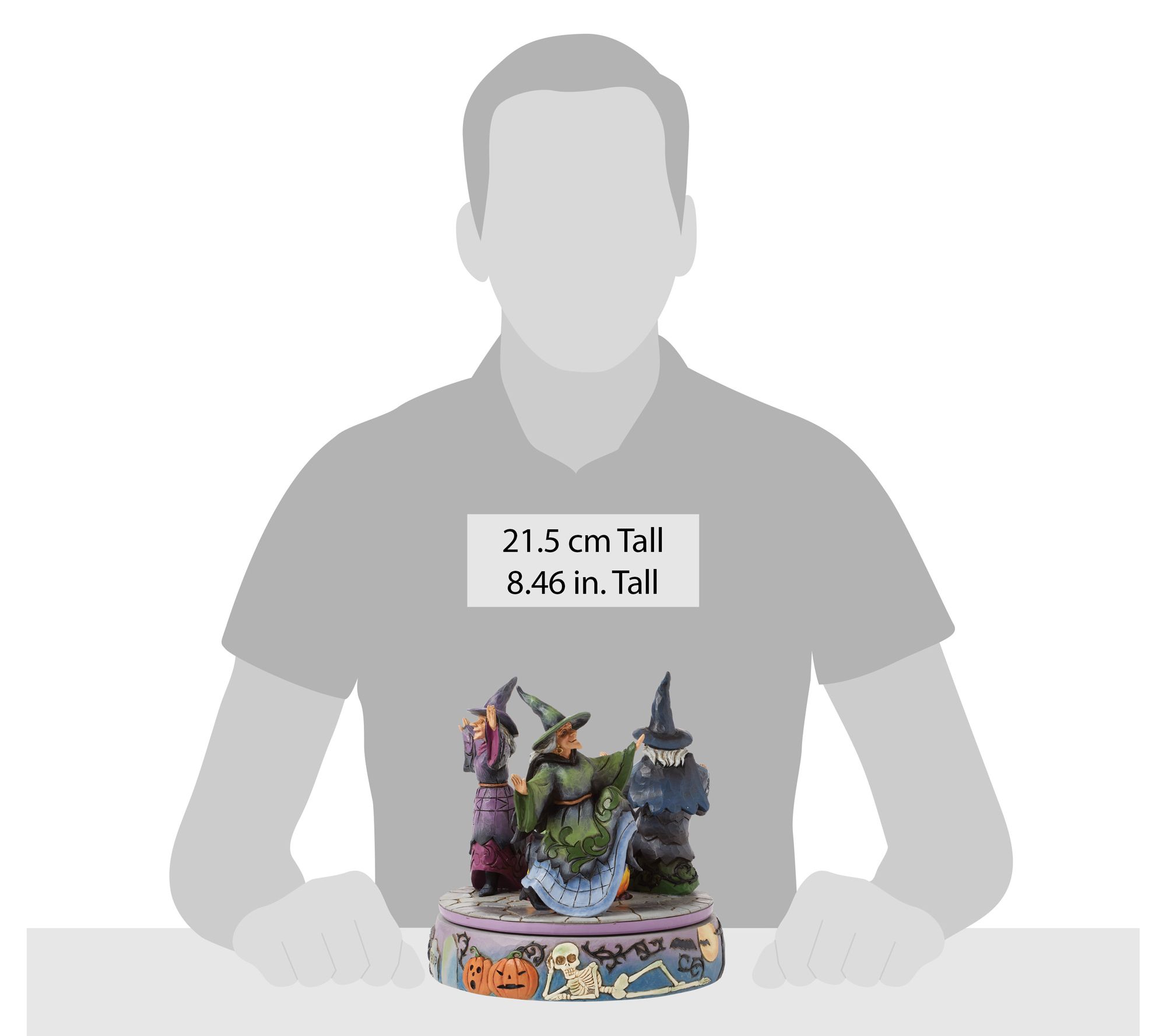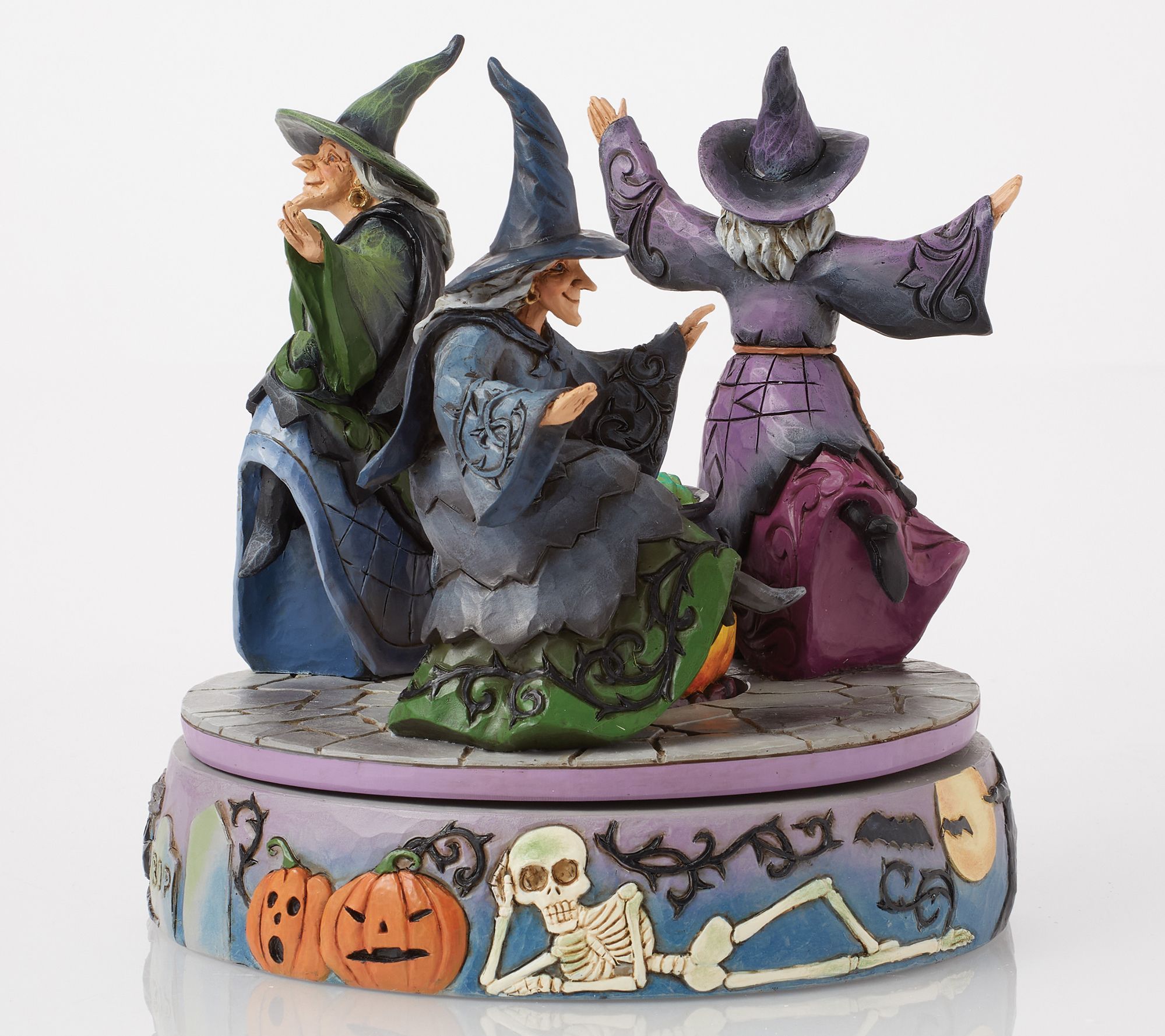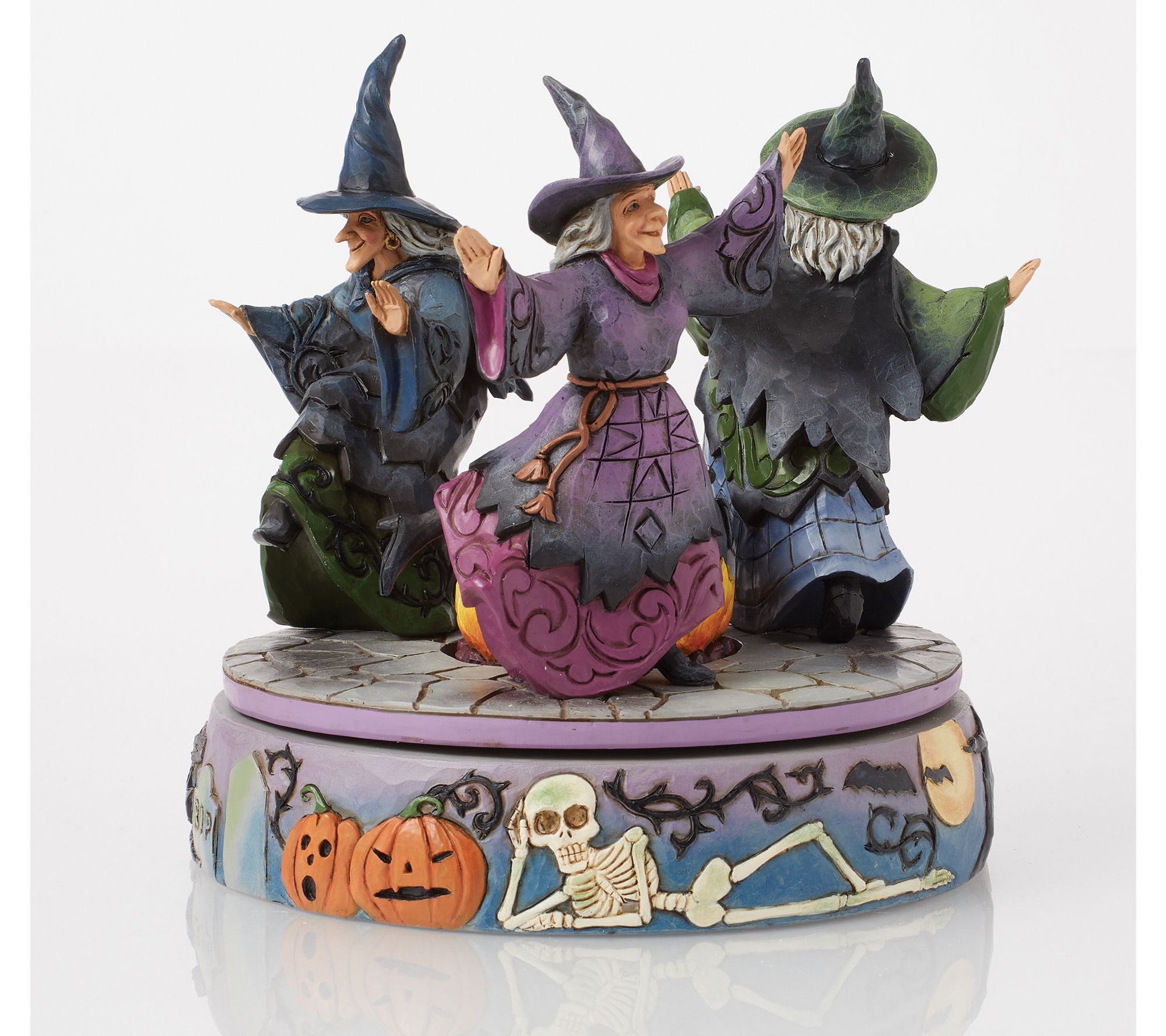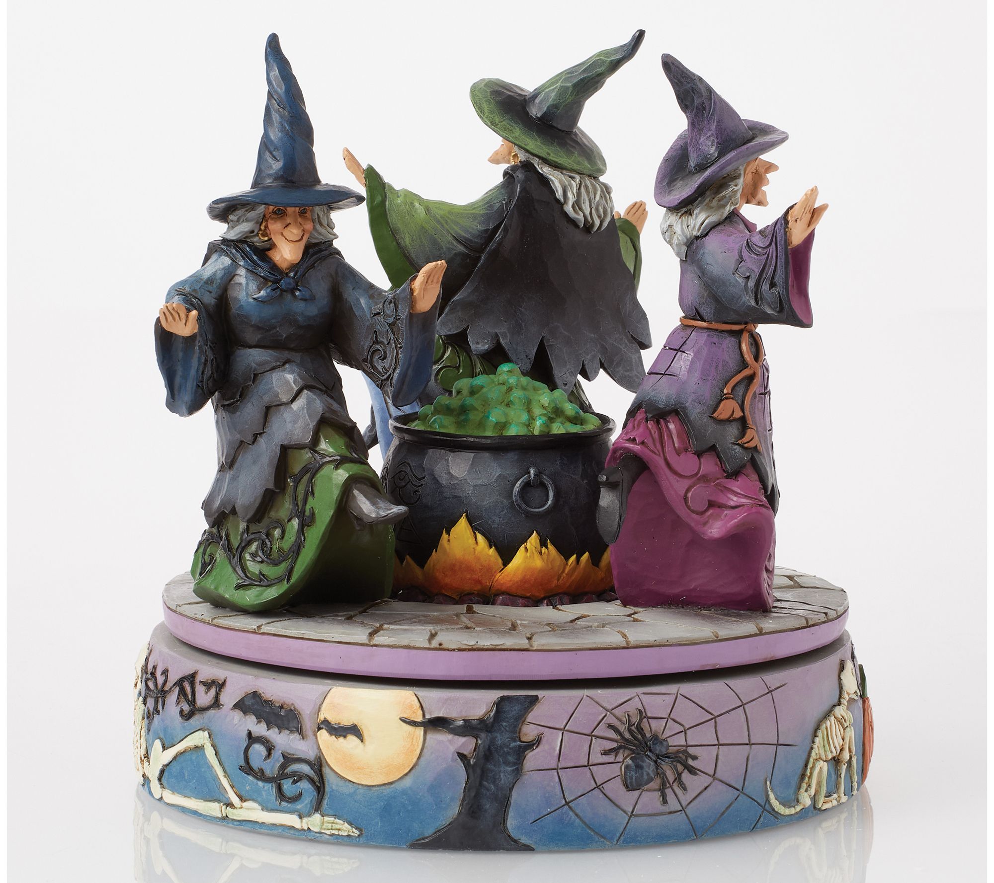 A sense of Halloween magic fills the air as three witches whirl around a bubbling cauldron, drawing curiosity and delight from all who pass by. Decorated with charmingly spooky touches like jack-o'-lanterns, skeletons, black cats, and more, this rotating cauldron figurine brings a playful spirit to your seasonal display. From the Heartwood Creek Collection by Jim Shore.