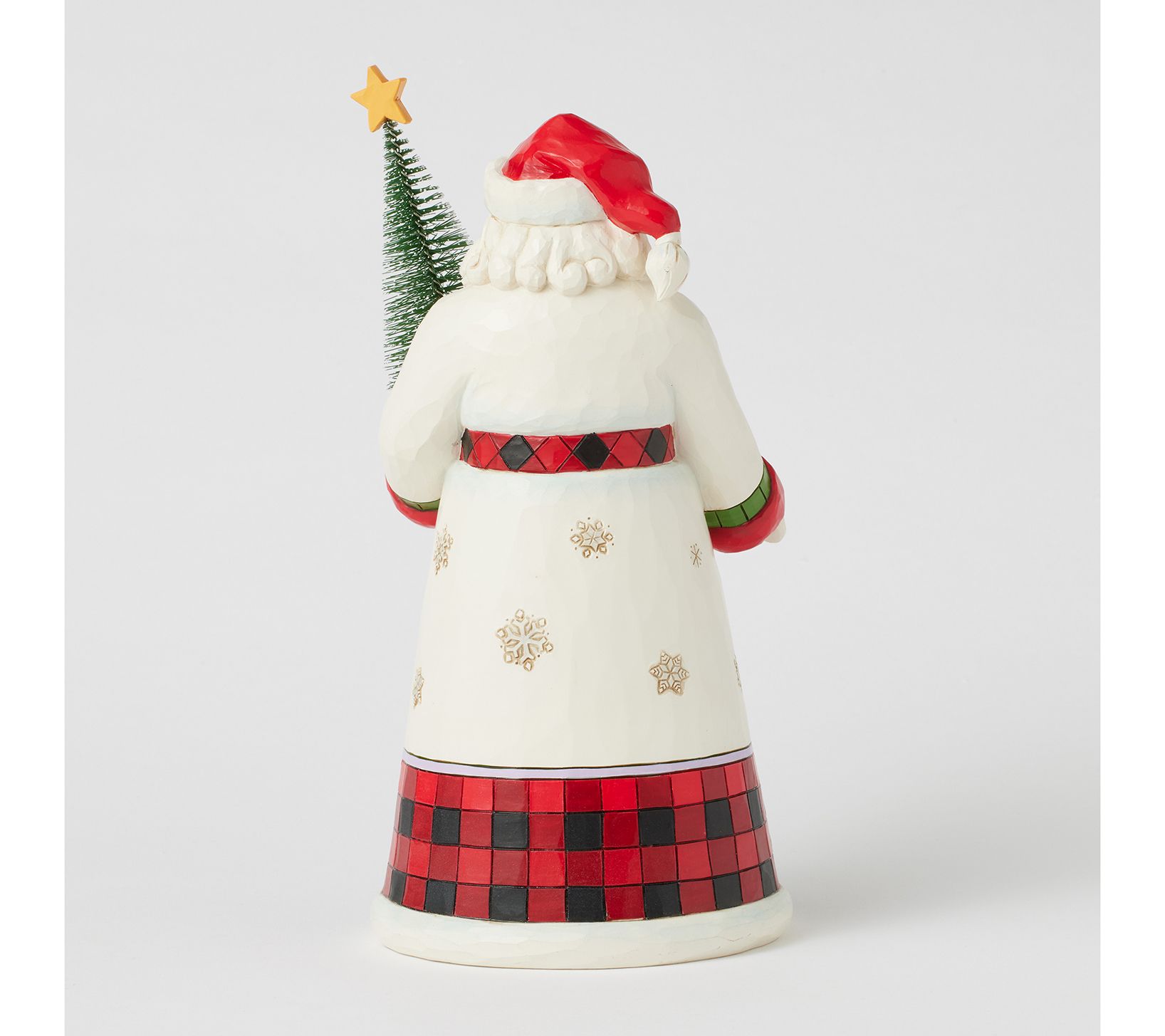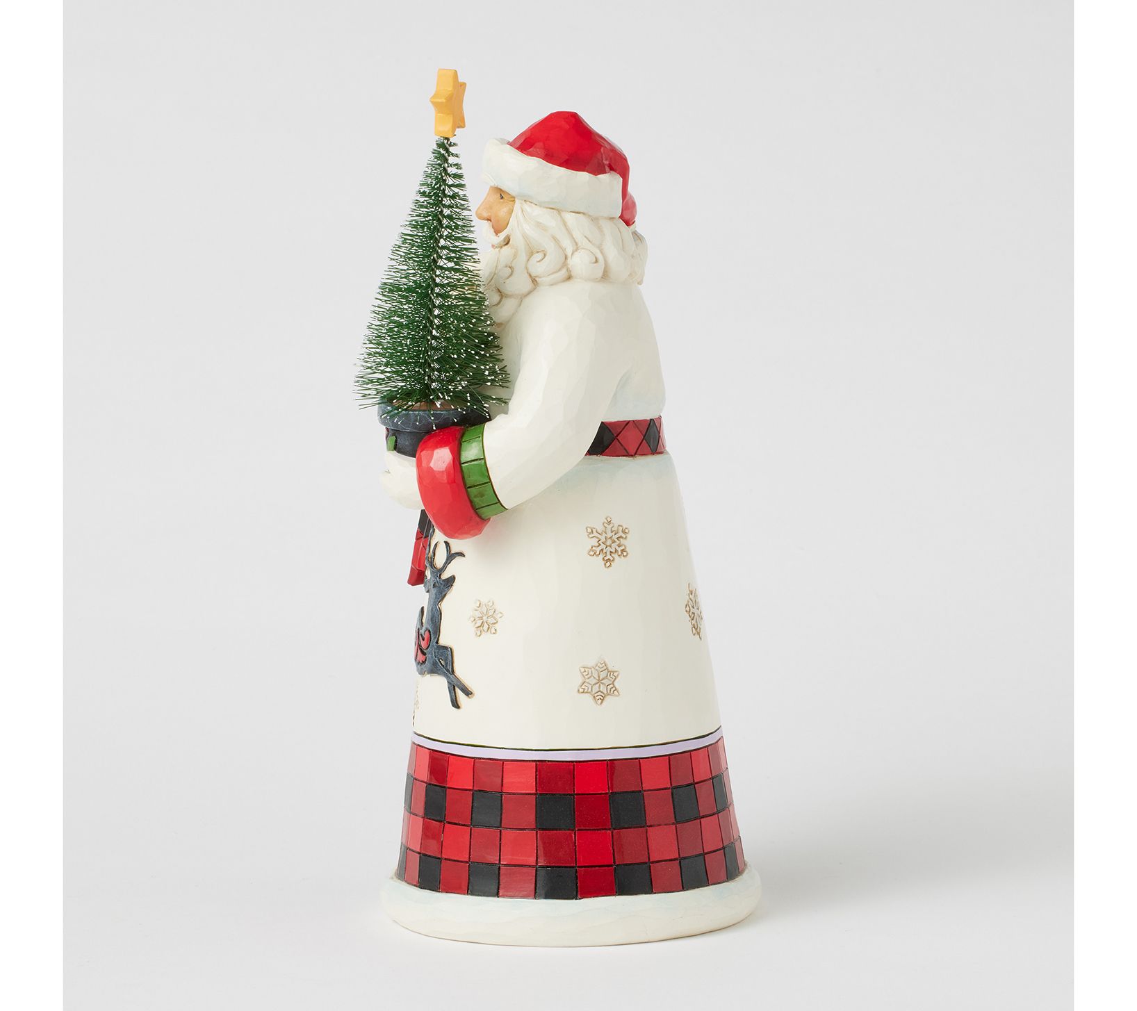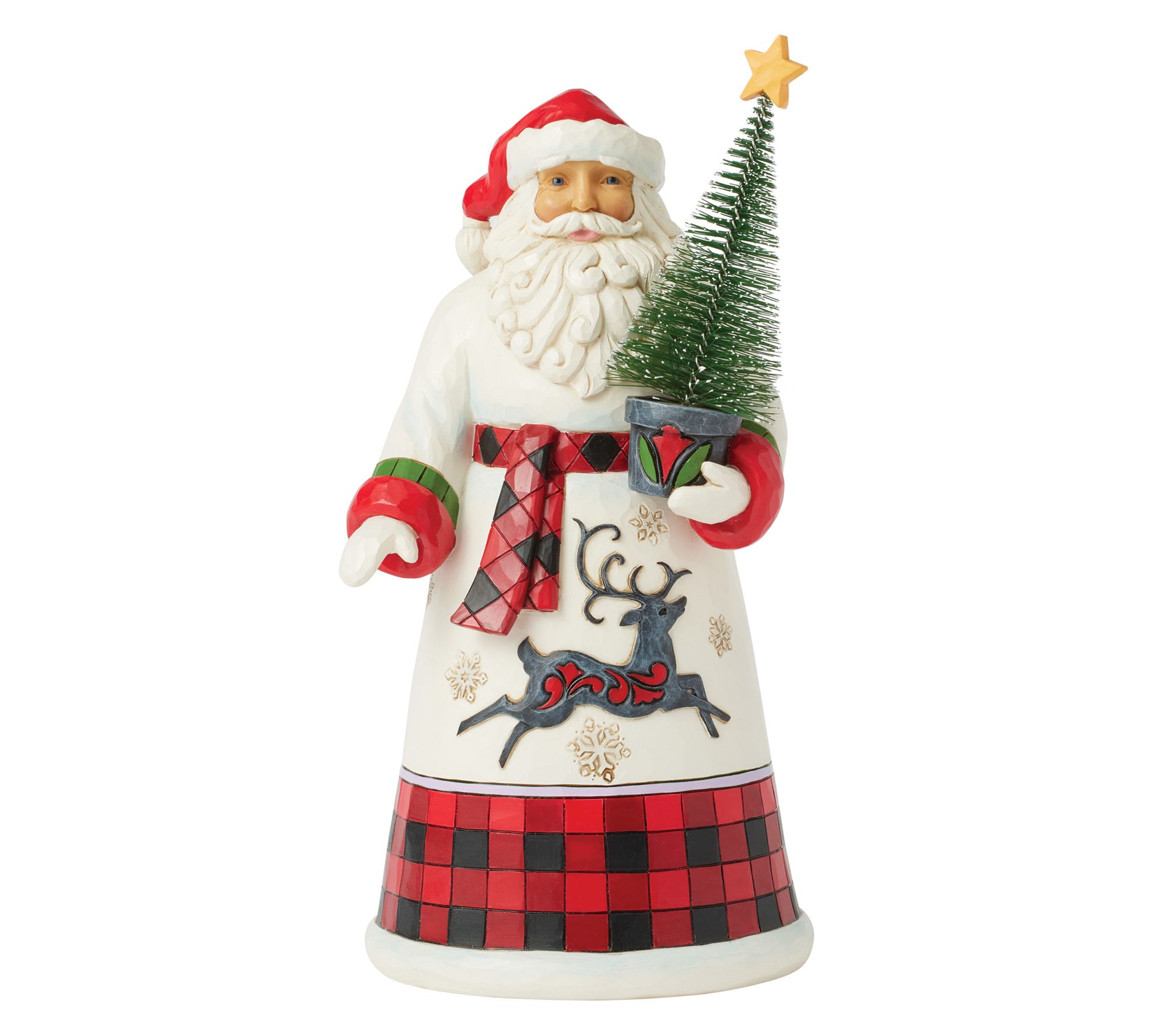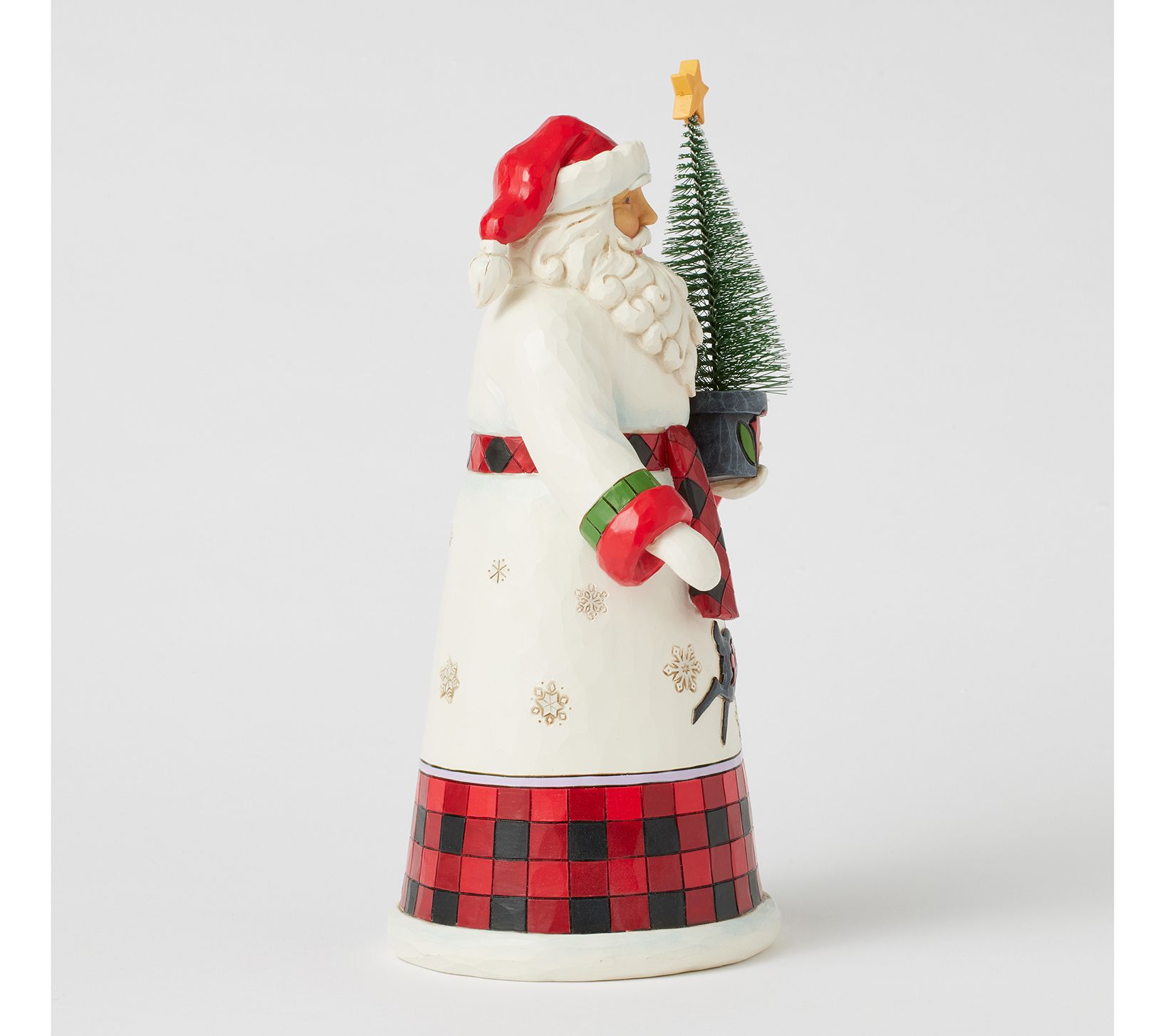 Welcoming guests feels even more special with this festive Santa, dressed in a cozy buffalo plaid cloak and holding a decorated sisal tree. Snowflake accents and a reindeer silhouette capture the cheerful spirit of Jim Shore's Highland Glen collection, bringing an inviting touch of tradition to any mantel or entryway. From Jim Shore.