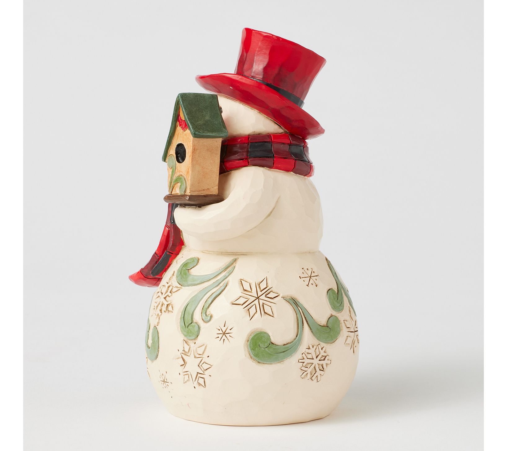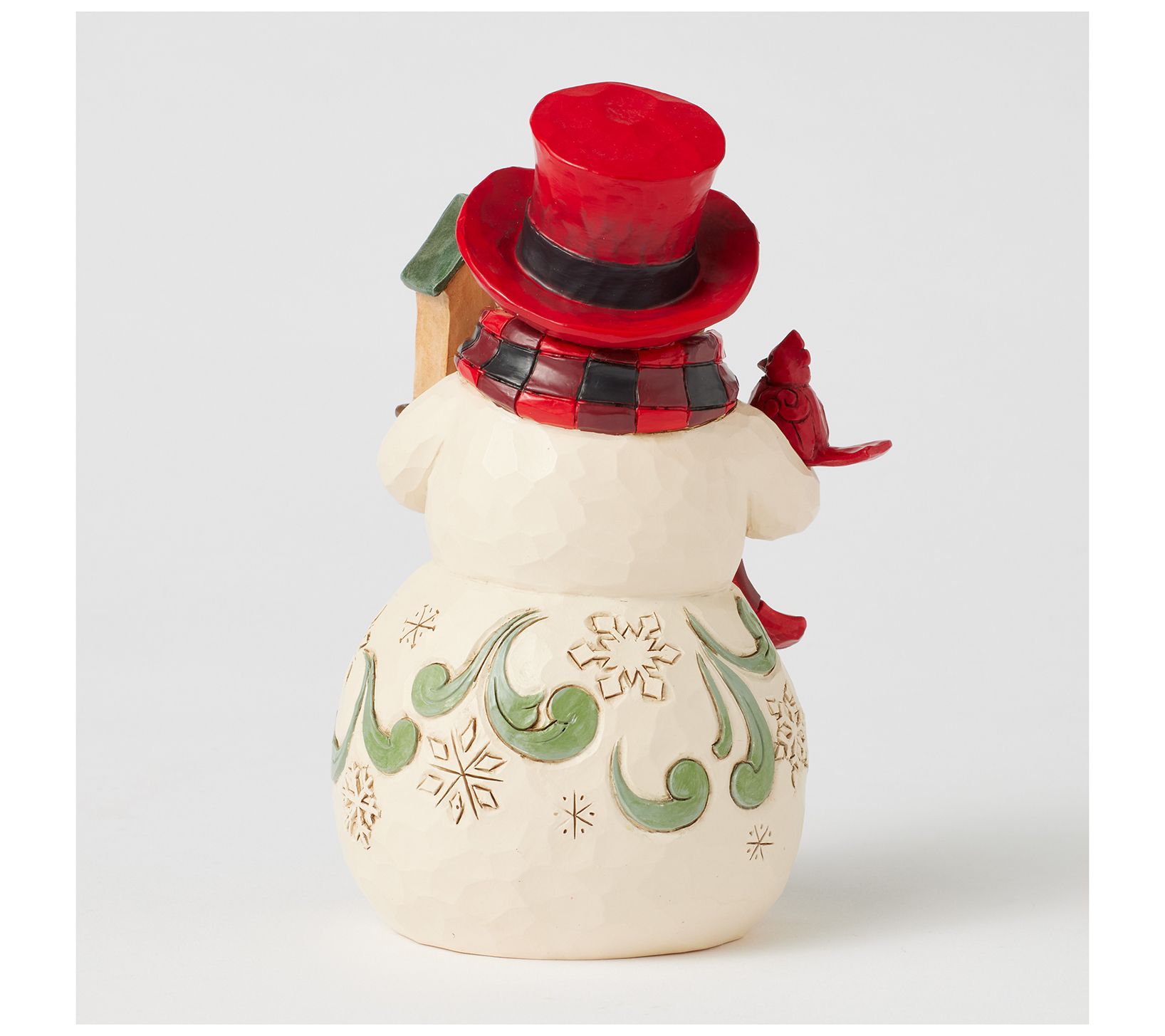 Let this festive snowman fill your home with cheer as he greets guests, decked out in a cozy buffalo plaid scarf and striking red top hat. A charming birdhouse rests in hand, with a cheerful cardinal companion adding a dash of seasonal delight. Place him on a mantel or entryway table to spread warmth and a merry mood throughout your holiday home. From Jim Shore.