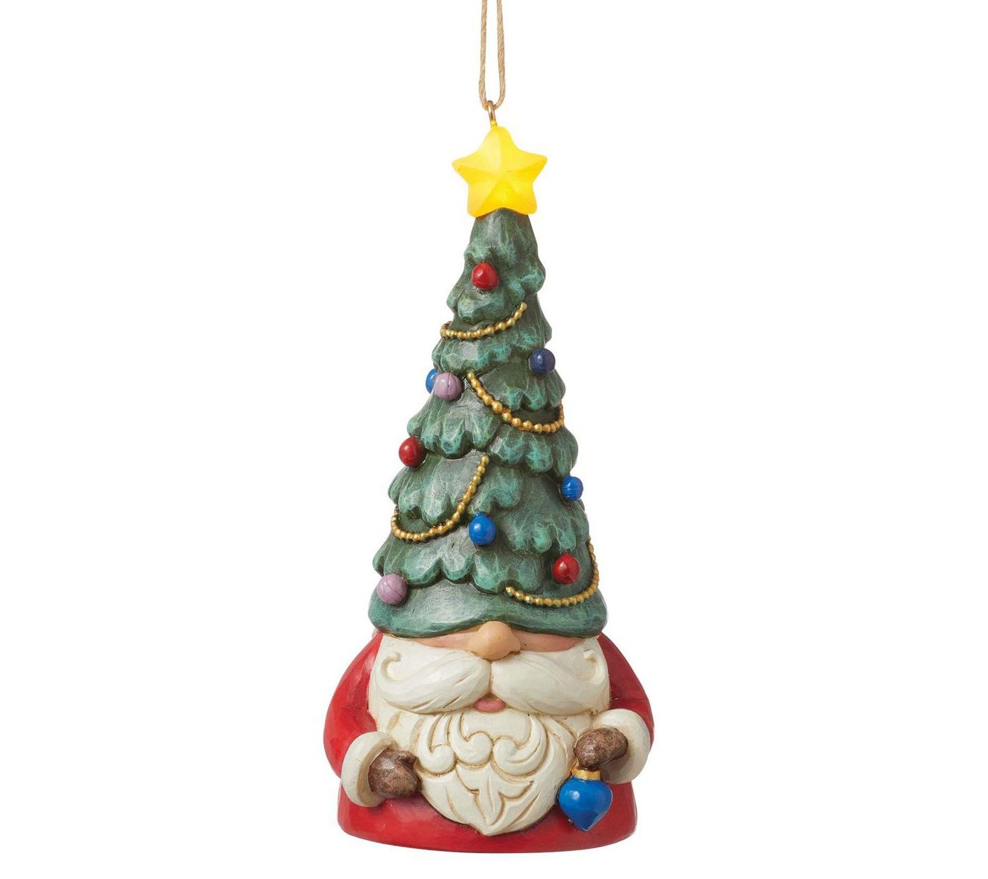 Wearing a playful Christmas tree hat topped with a light-up star, this fun gnome is holding an ornament and he's ready to decorate your tree with color and cheer. From Enesco.