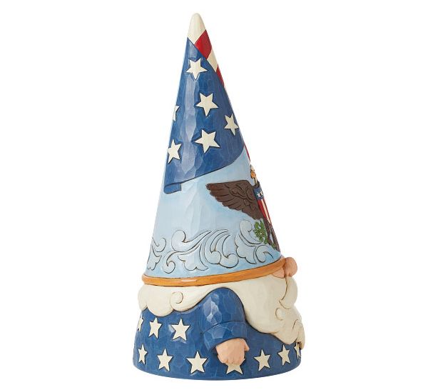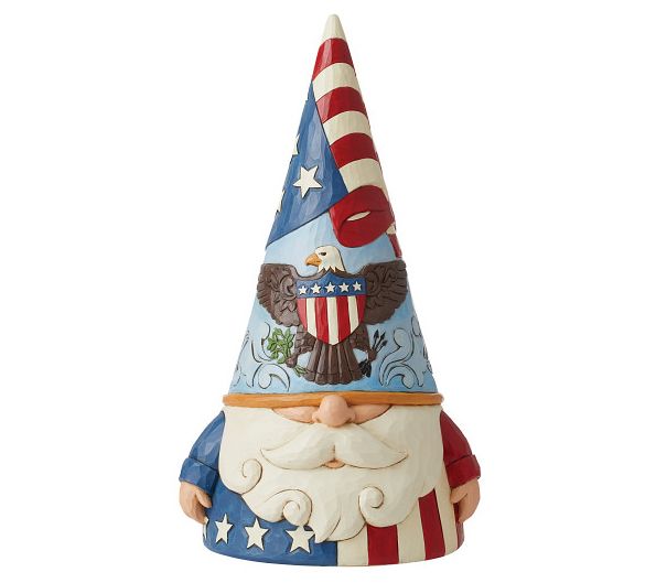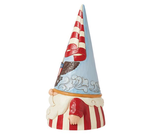 Celebrate your patriotism in a whimsical way with the Jim Shore Patriotic Gnome, featuring a design that showcases the stars and stripes of the USA with pride. From Jim Shore.