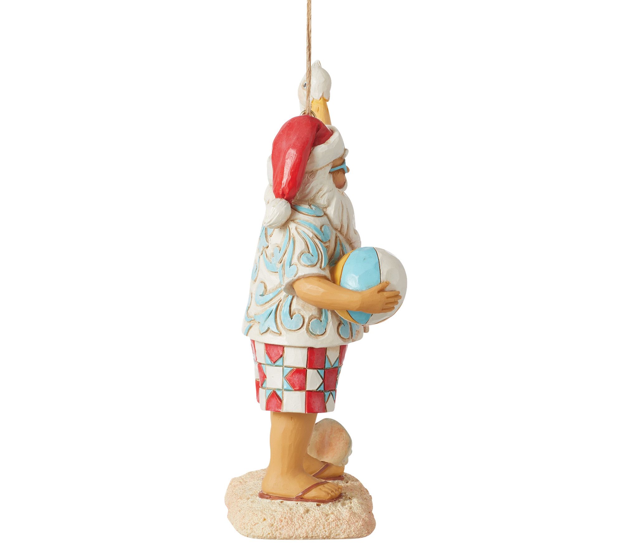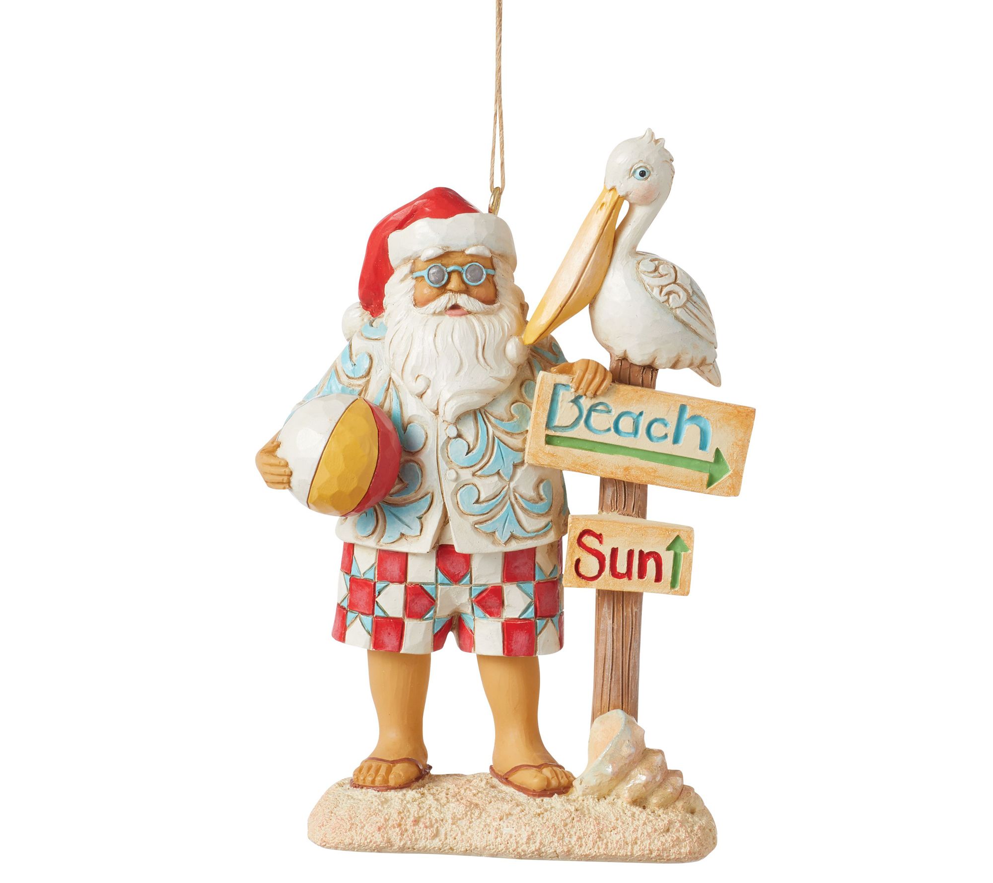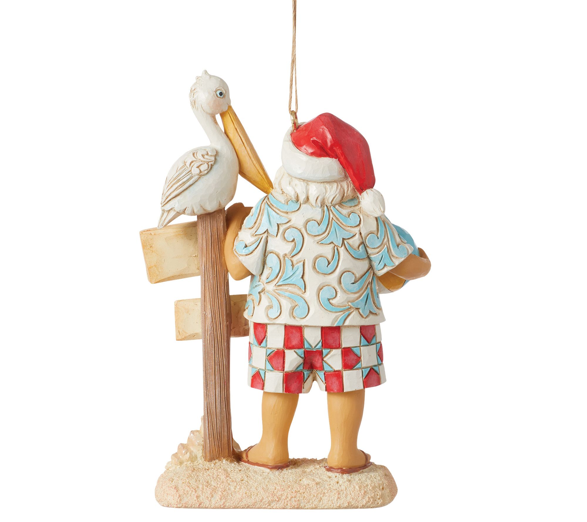Starting December 26th, Santa hits the beach for a well-deserved vacation! With patchwork swim trunks, a Hawaiian-styled shirt adorned with blue rosemaling, and a pair of shades and flip-flops, Santa is standing with his pelican friend as a sign points the way to the seaside. From Jim Shore.