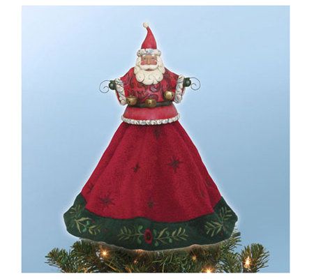 Top your tree with this cheery fellow. Santa is holding a real set of bells to ring in the holiday season. And his fabric skirt is decorated with an allover star pattern and a gorgeous embroidered trim. From the Heartwood Creek Collection by Jim Shore.