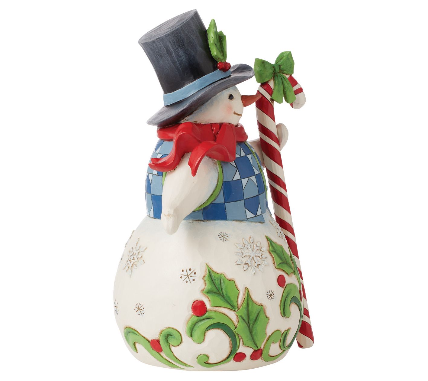 • Features a snowman with a patchwork vest, red scarf, and holly brimmed top hat