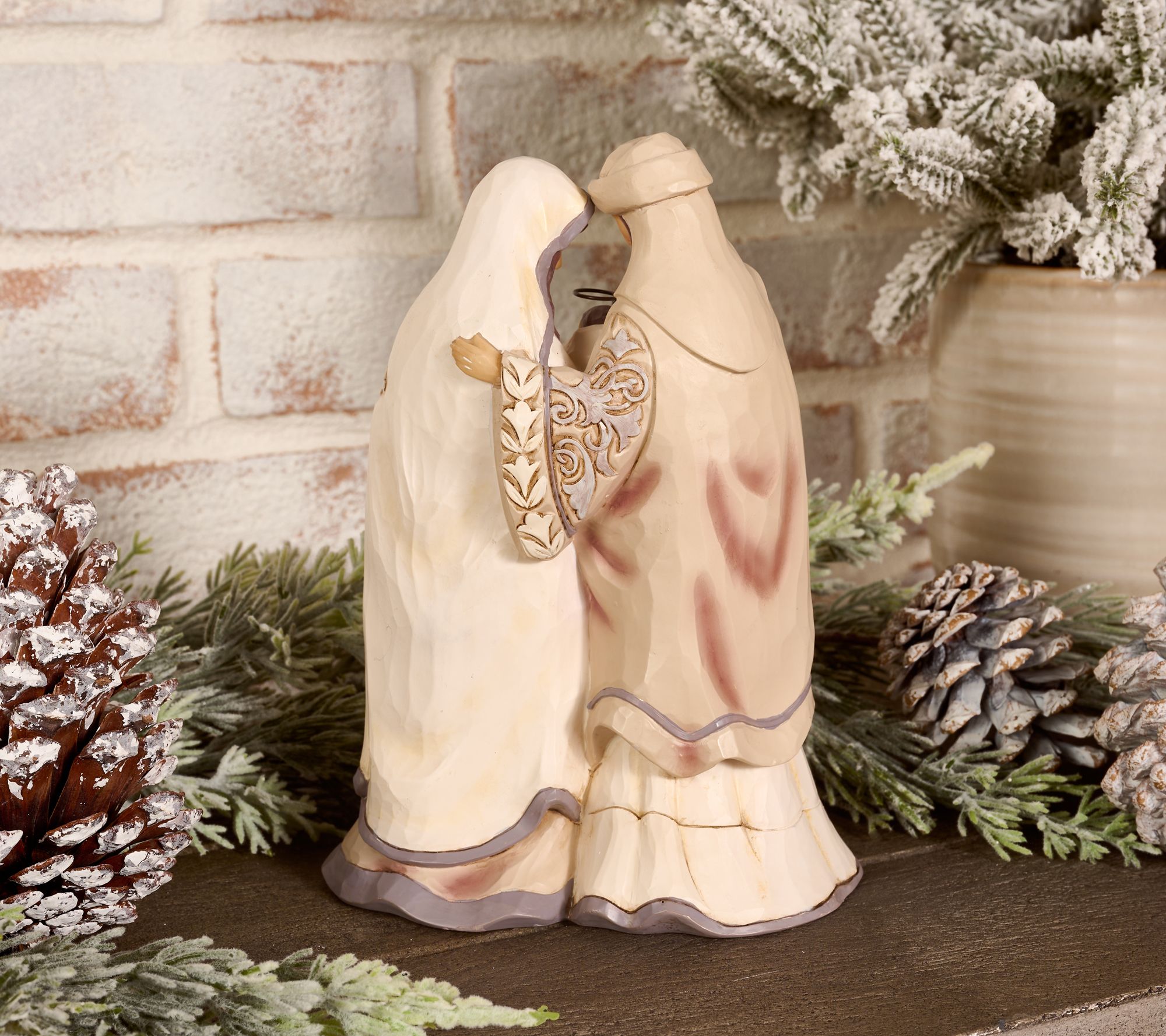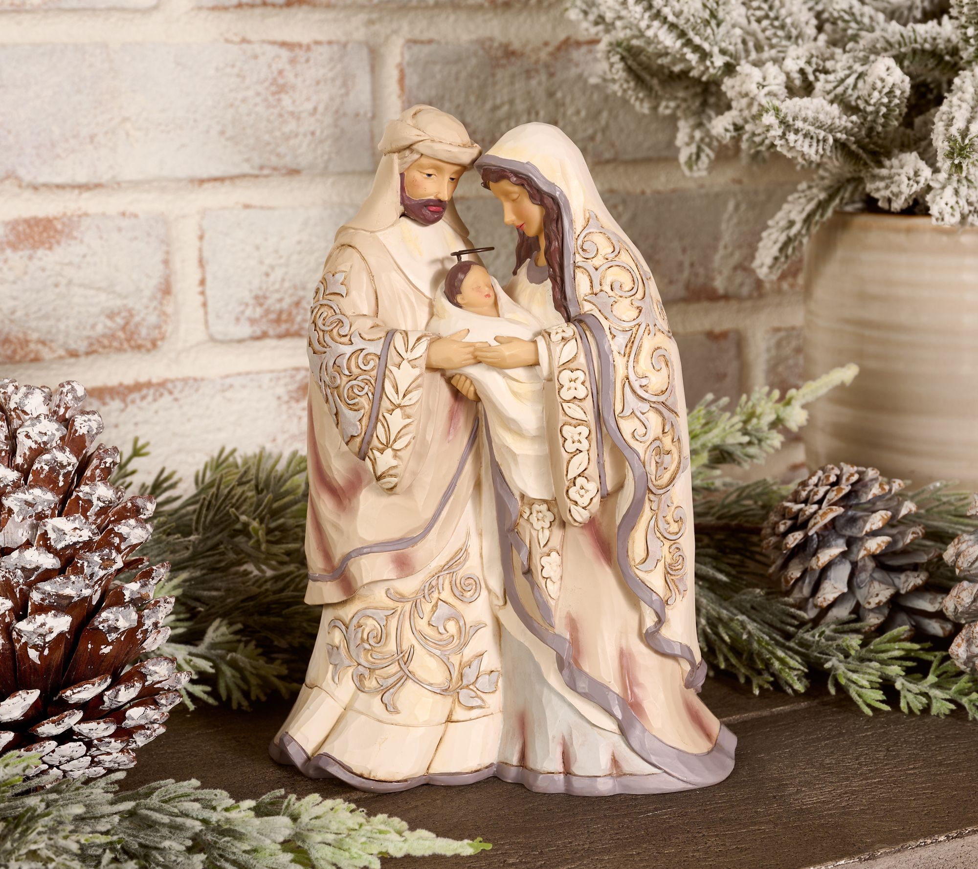 Celebrate the reason for the season with this gorgeous holy family figurine from Jim Shore. In ornate rosemaling robes patterned with petals, Mary and Joseph hold baby Jesus in a loving embrace as they revel in the miracle of Christmas. From the White Woodland Collection by Jim Shore.