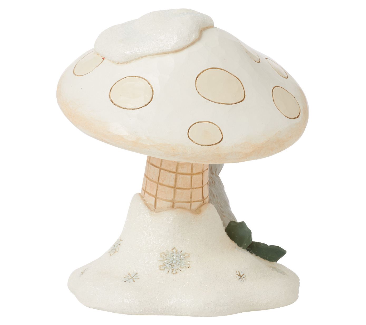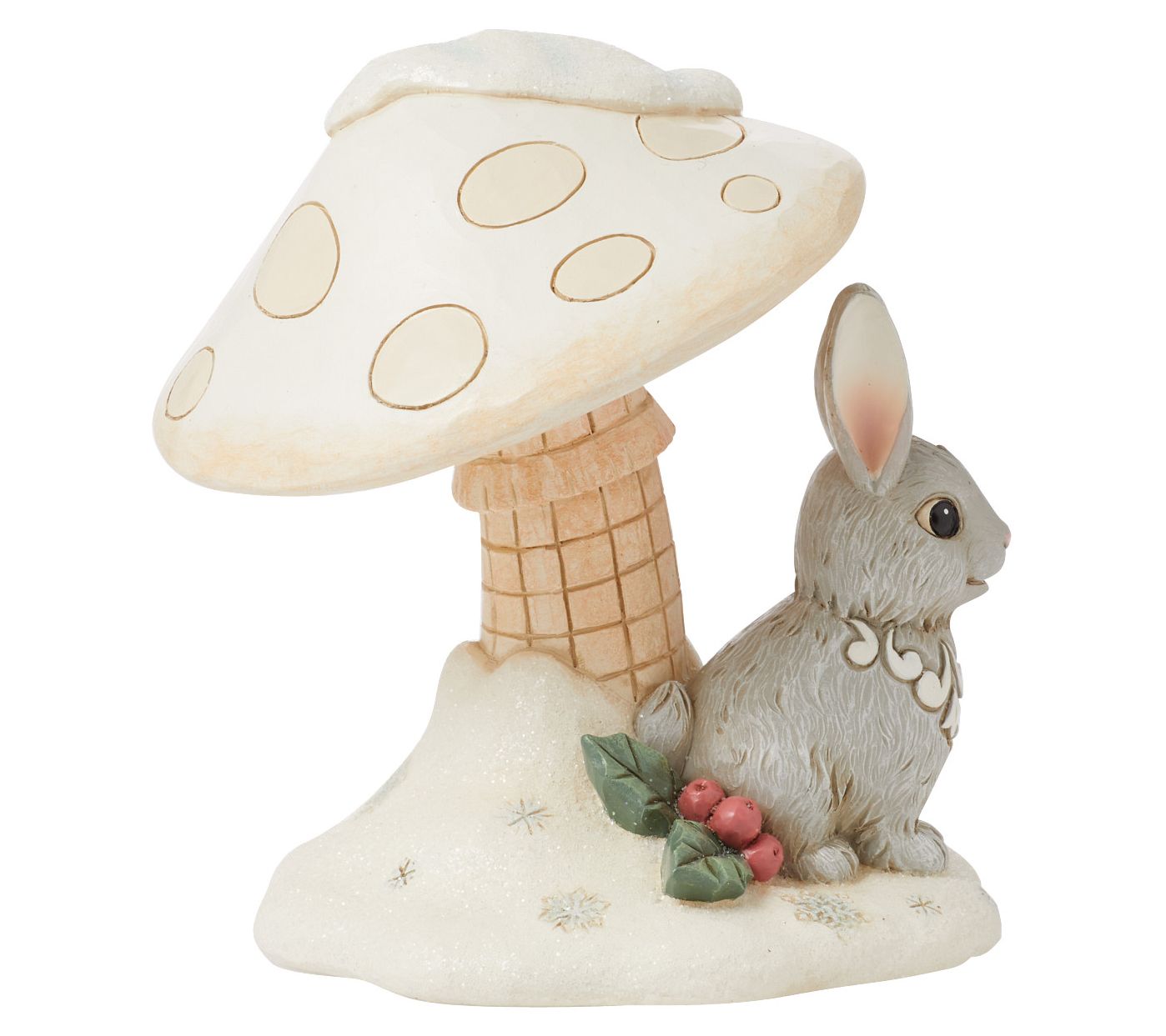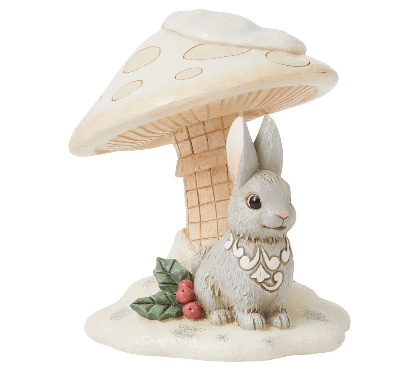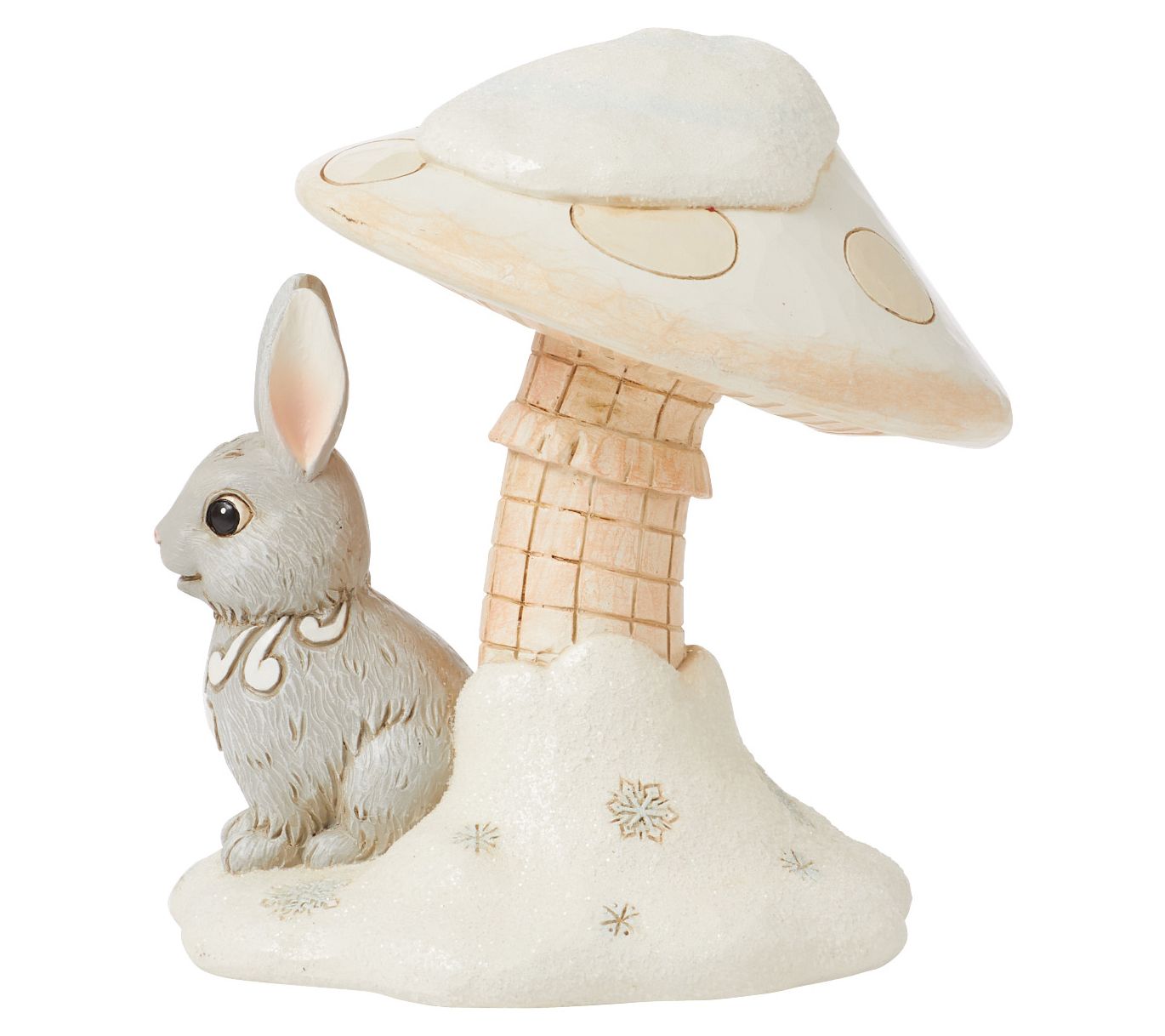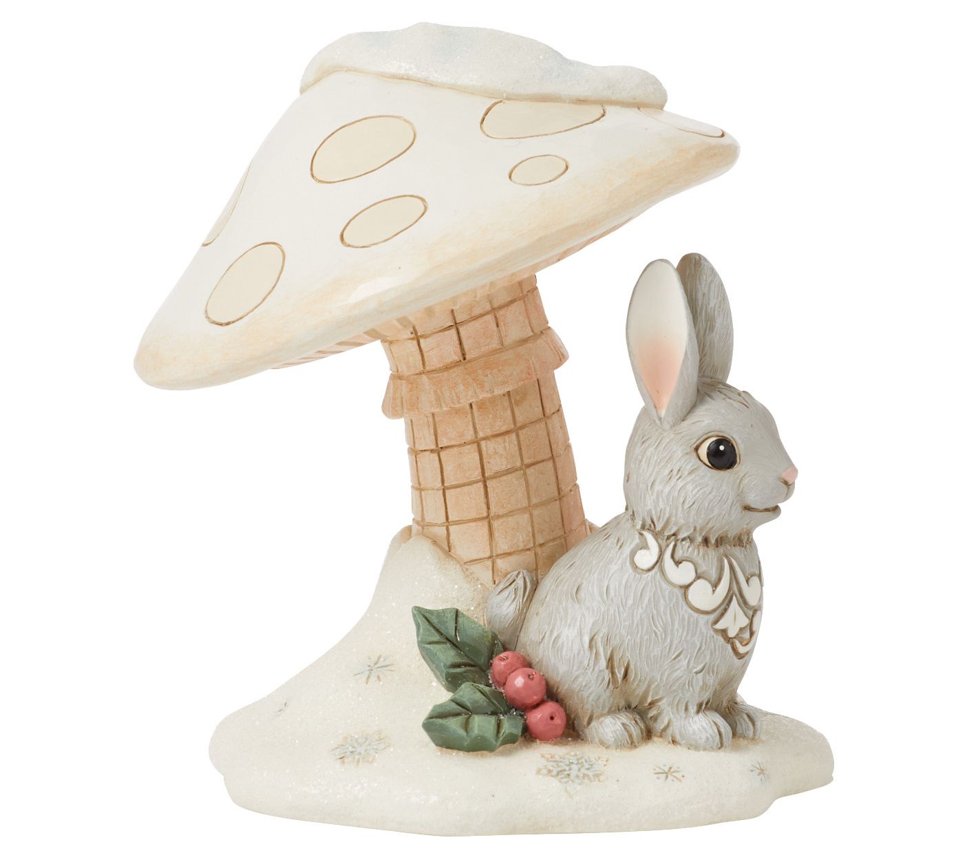 Discover the enchanting charm of winter with this delightful figurine that captures a serene moment as a tiny bunny finds refuge under a beautifully patterned mushroom cap. Surrounded by glistening snowflakes, this figurine is intricately designed with a signature rosemaling technique. From Jim Shore.