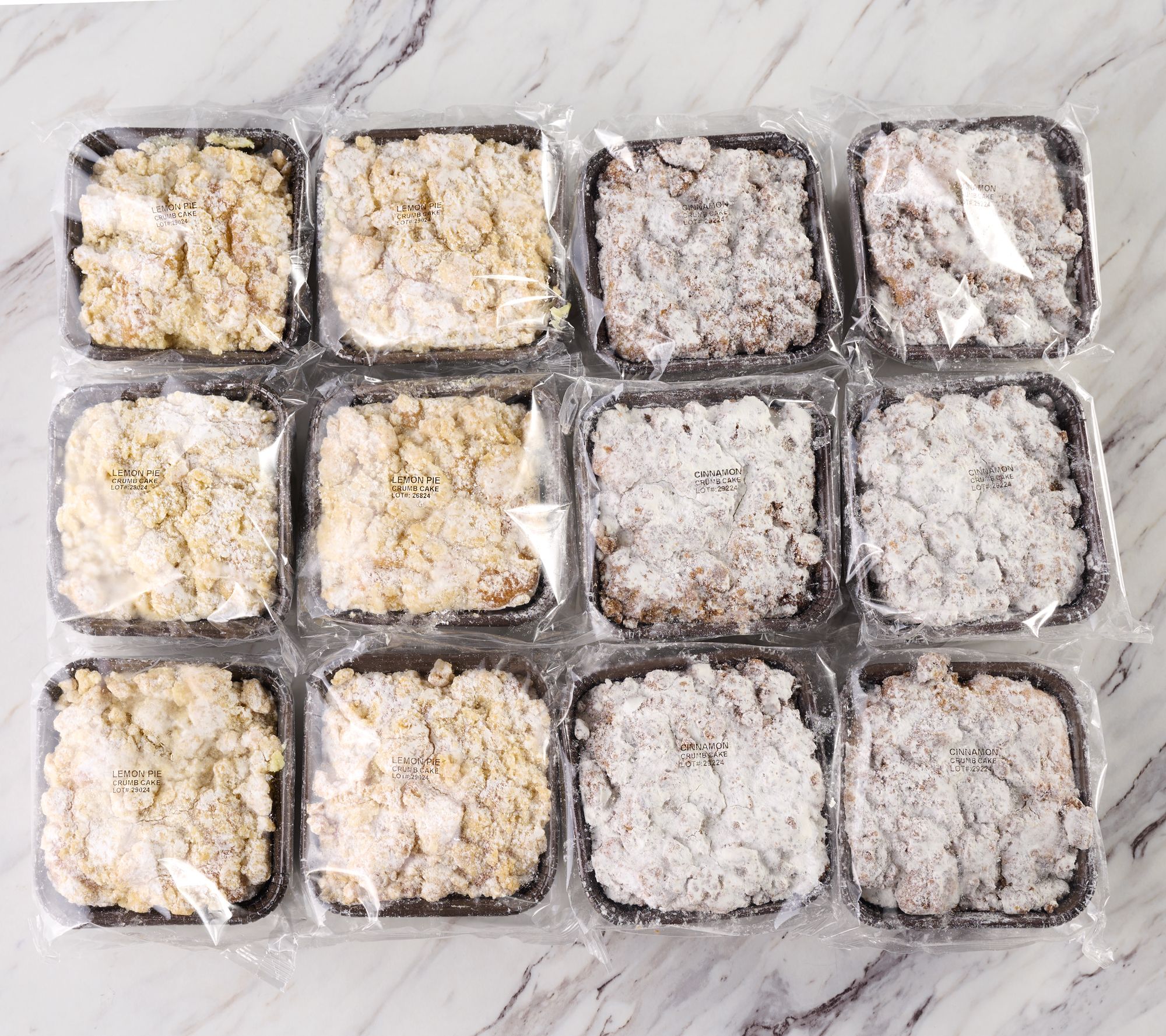 • Combo options: six cinnamon and six apple cider with coarse sugar topping crumb cakes; or six cinnamon and six almond crunch crumb cakes; or six cinnamon and six lemon pie with white crumb topping crumb cakes