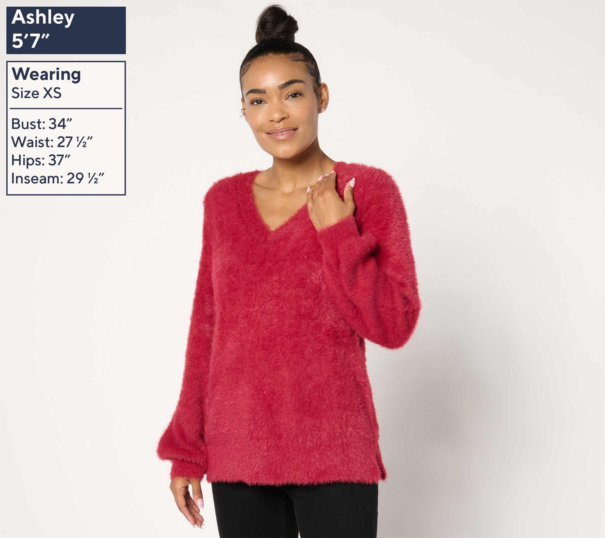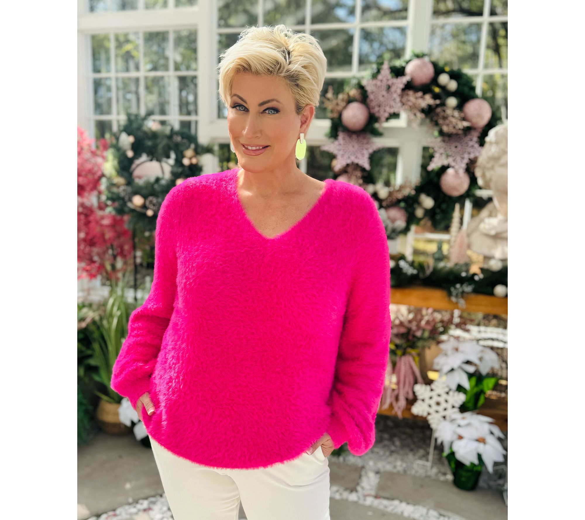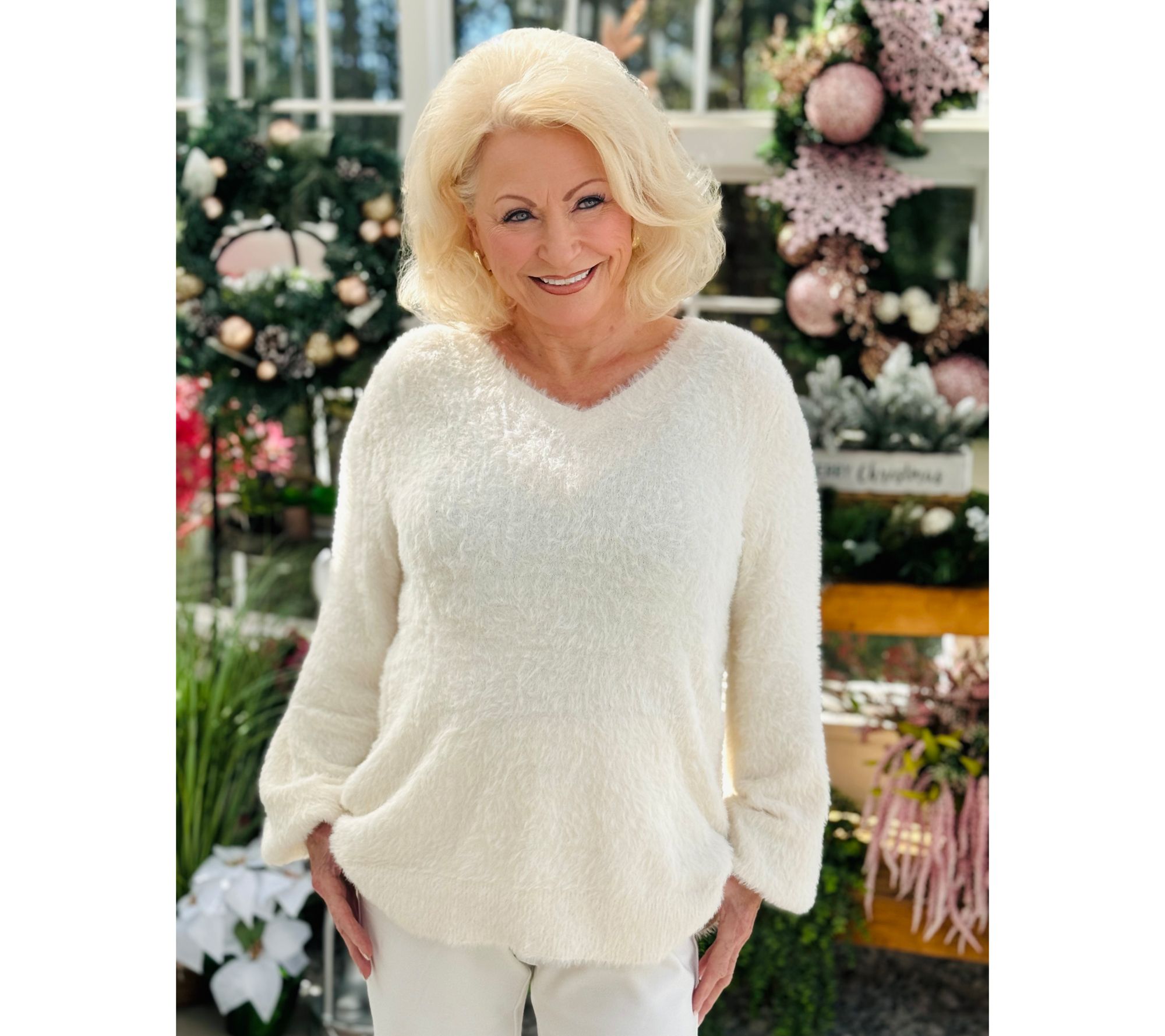 Take on holiday festivities with flair wearing this lovely sweater. The long-sleeve V-neck design is crafted for both comfort and style, featuring blouson sleeves and ribbed cuffs that add a delightful touch. You'll love the straight hem with side slits, offering a relaxed yet polished look. From Jingle Belles by Kim Gravel.