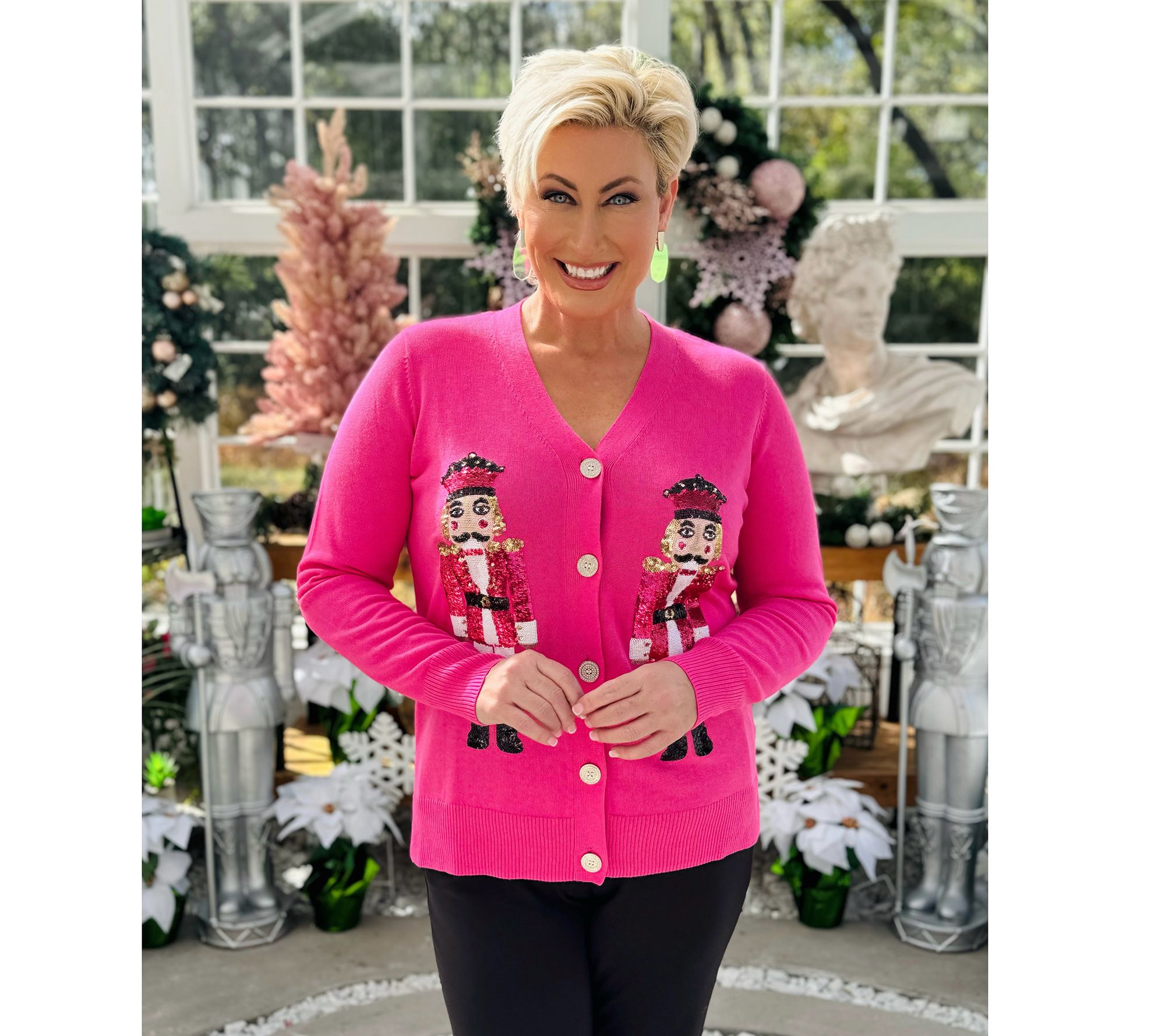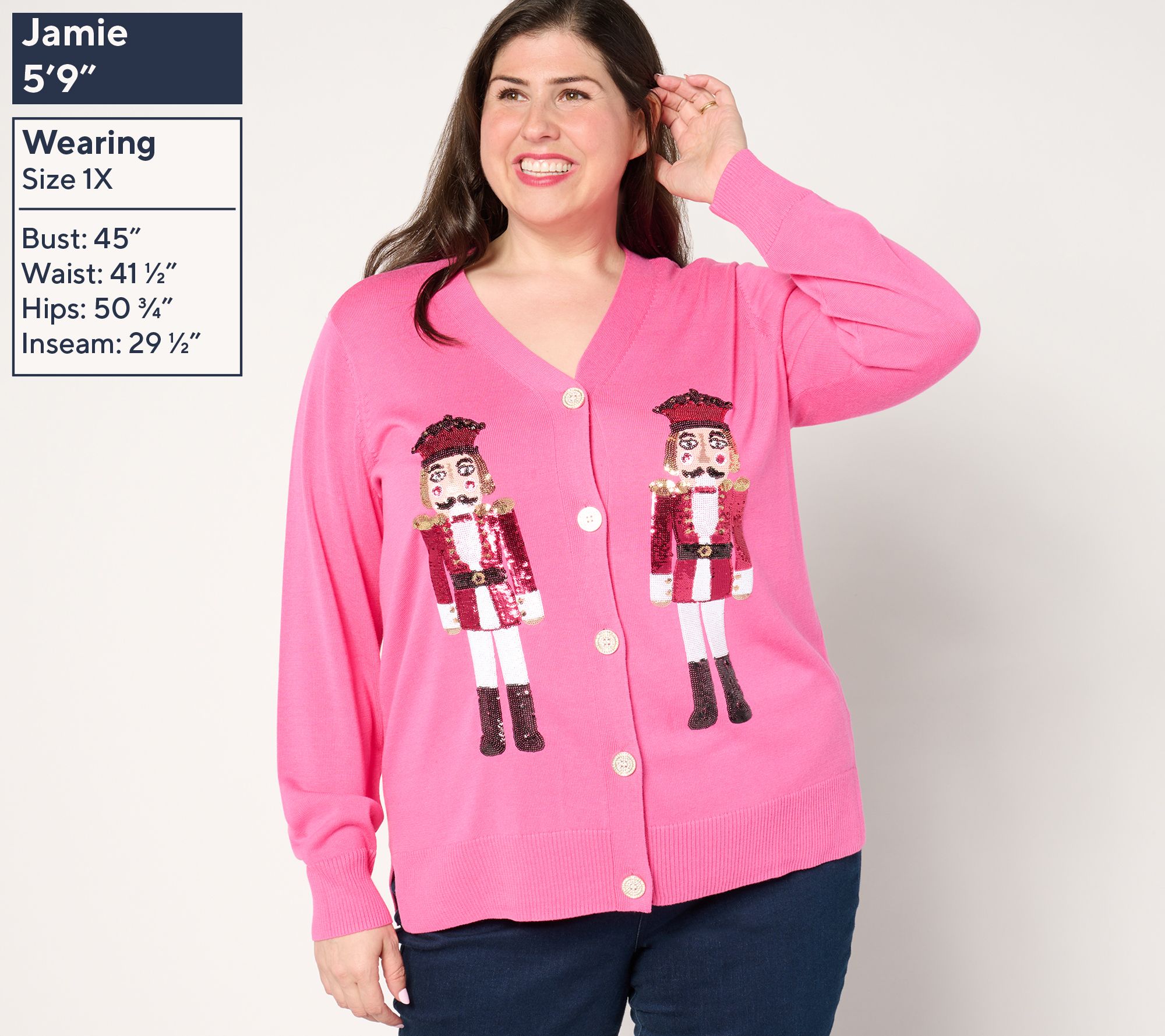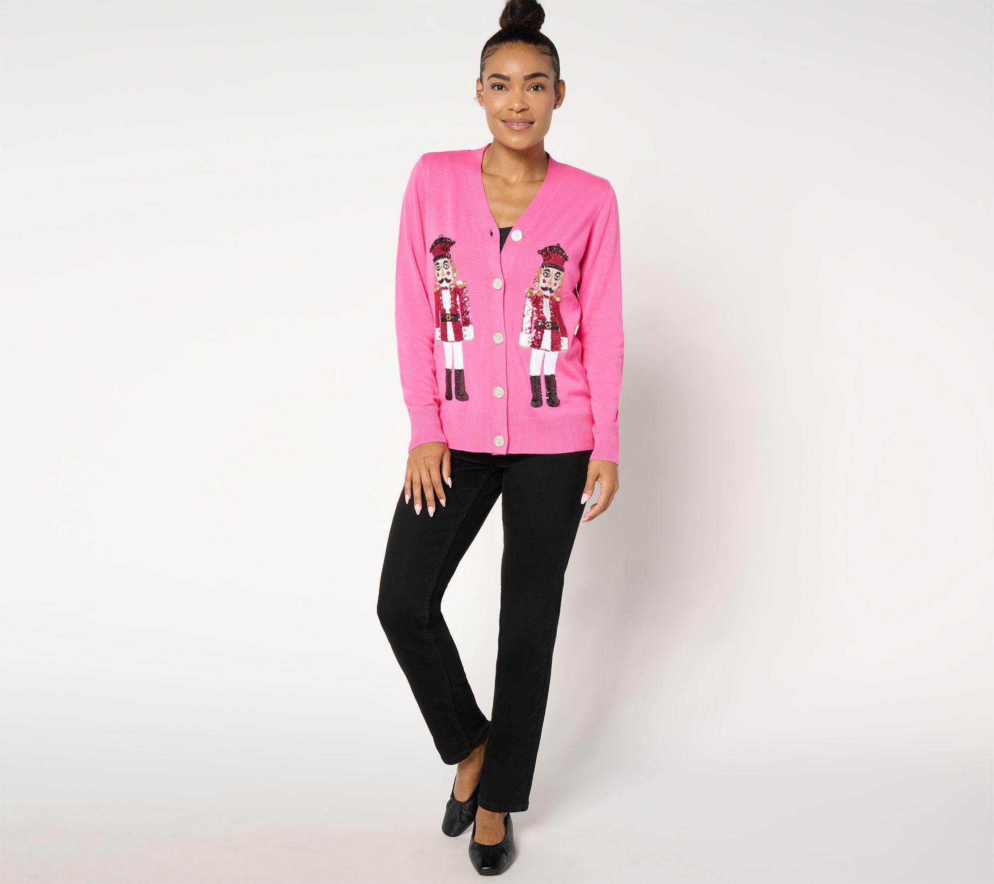 Slip into this sparkling sequin cardigan and let the festivities begin! With its shimmering design and cute button-front closure, it's destined to be your season's standout piece. Perfect for glamming up casual jeans or adding some sparkle to a holiday dress, it meets every merry occasion with style. From Jingle Belles by Kim Gravel.