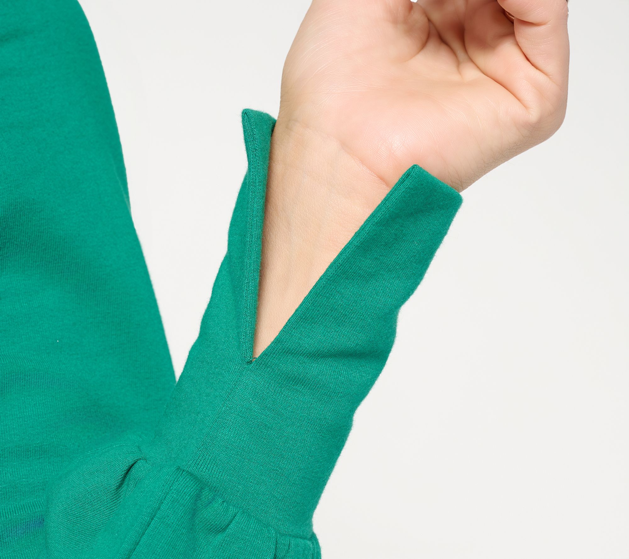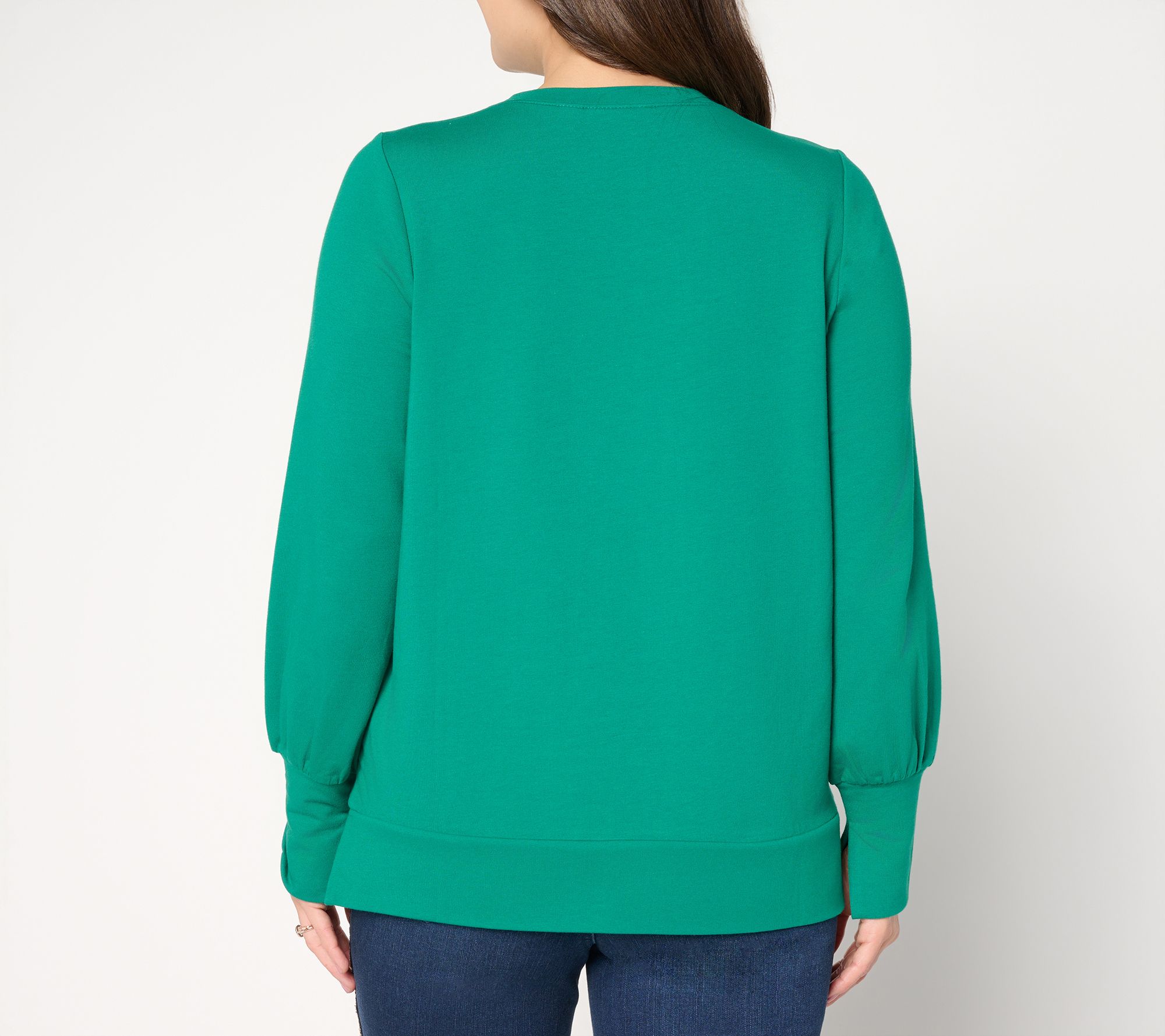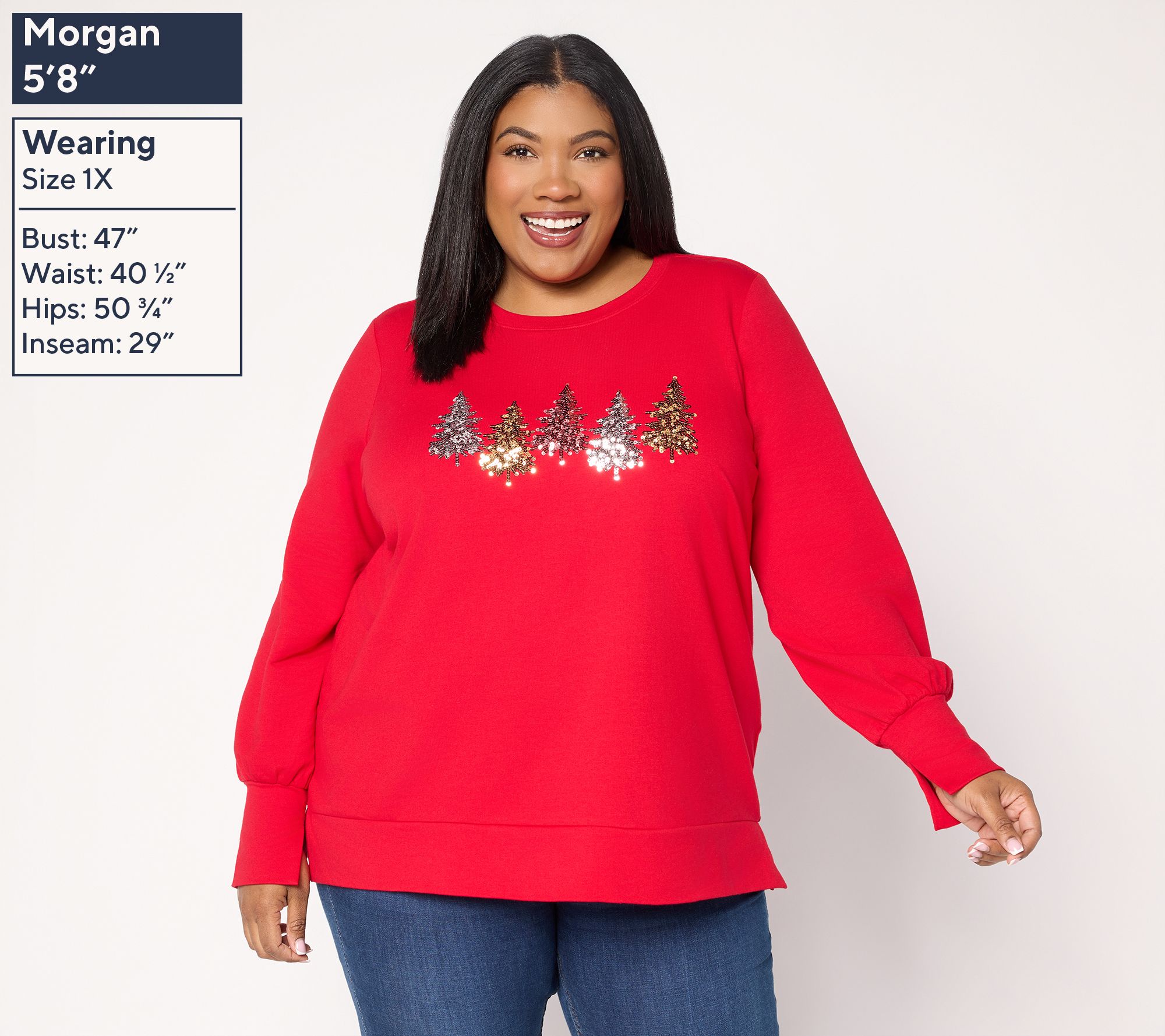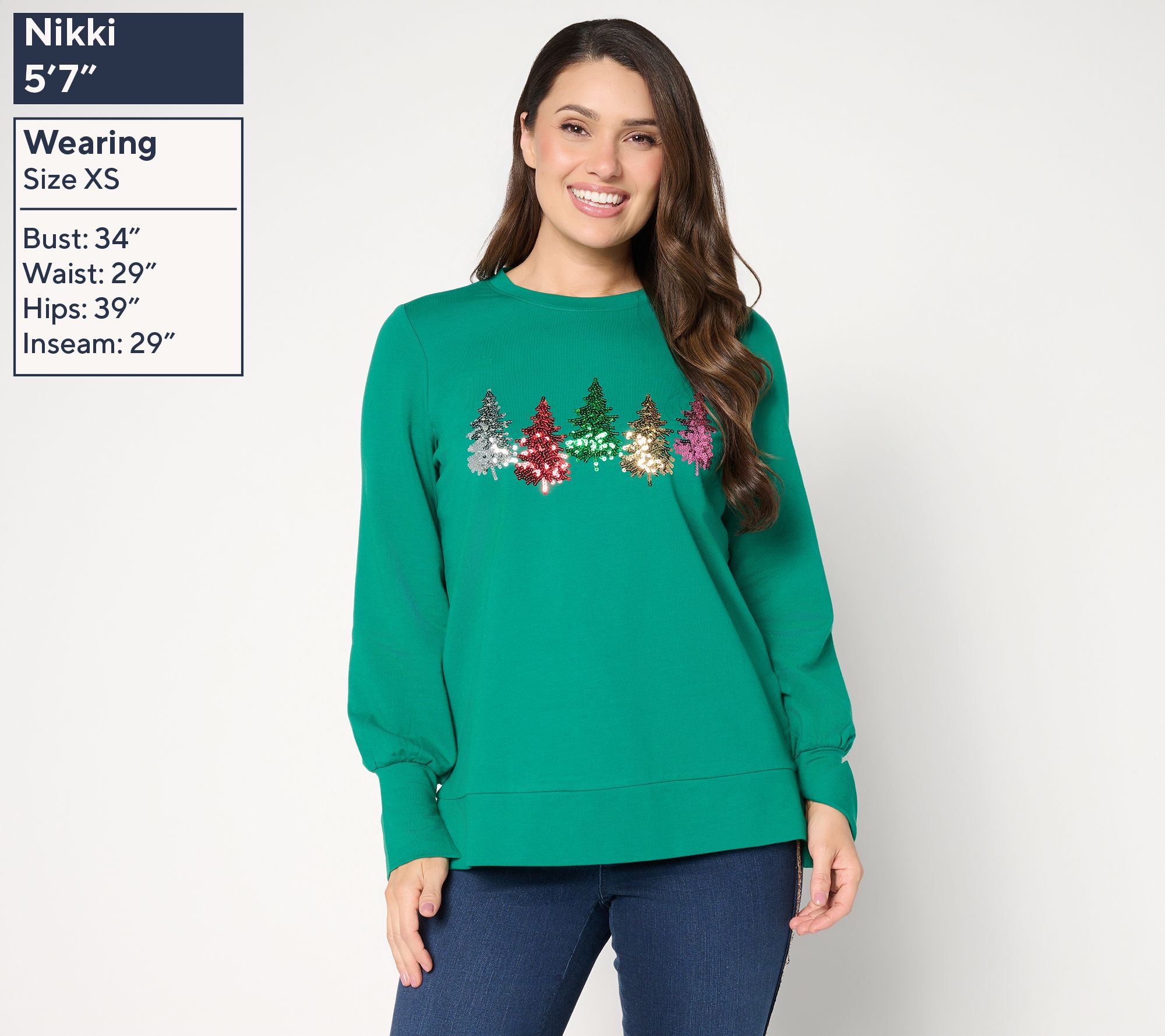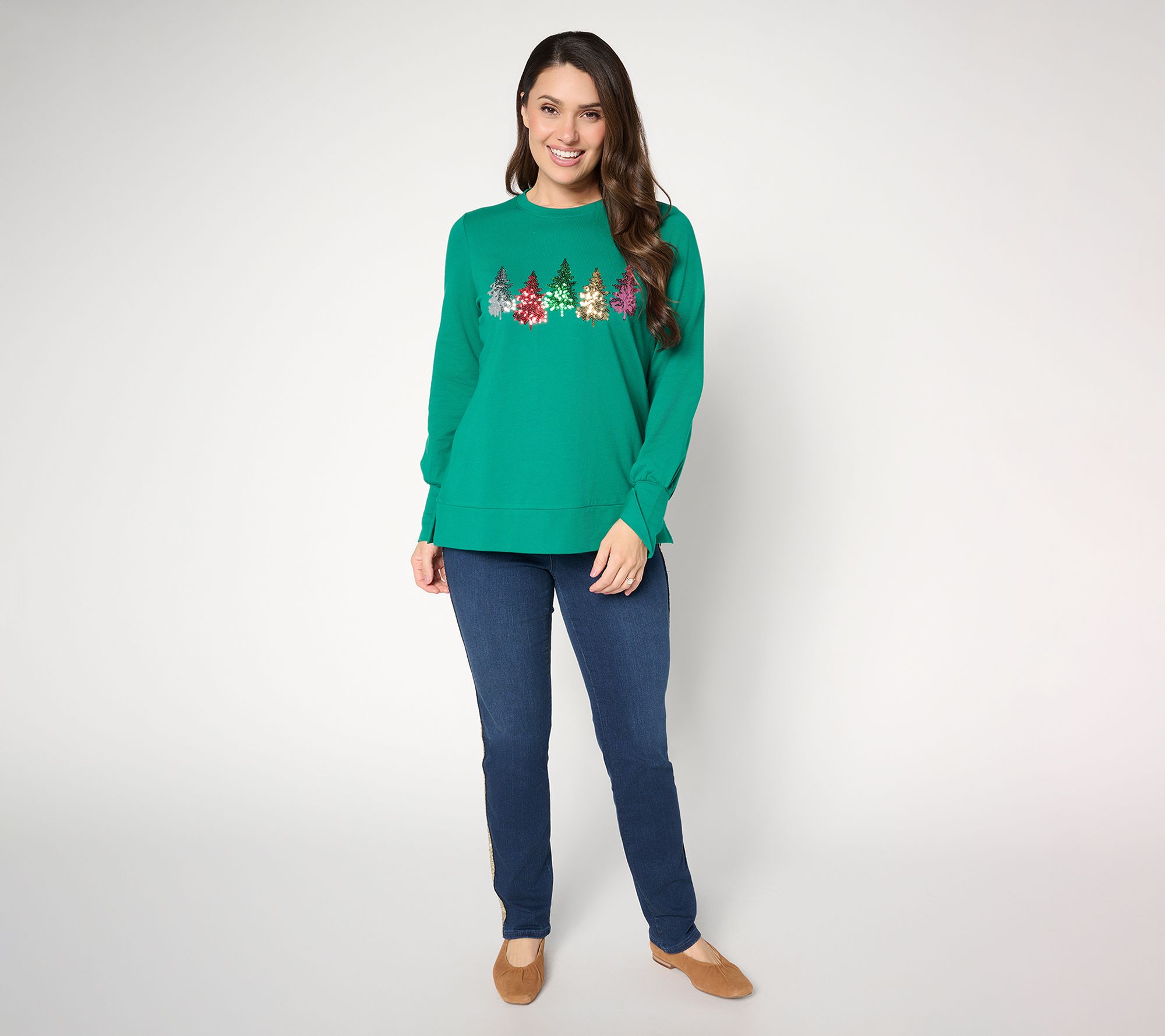 Features: crewneck, sequin Christmas tree embellishment on front chest, long sleeves with split cuff, side slits