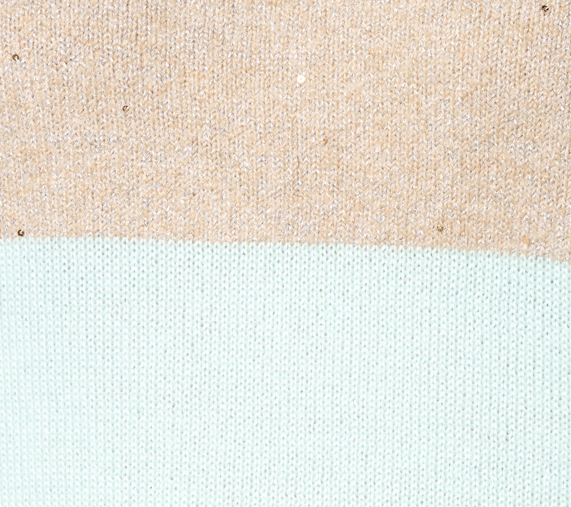 Features: striped pattern, mock neck, metallic accents, long sleeves with ribbed cuff, dropped shoulder, ribbed bottom band, straight hem, side slits