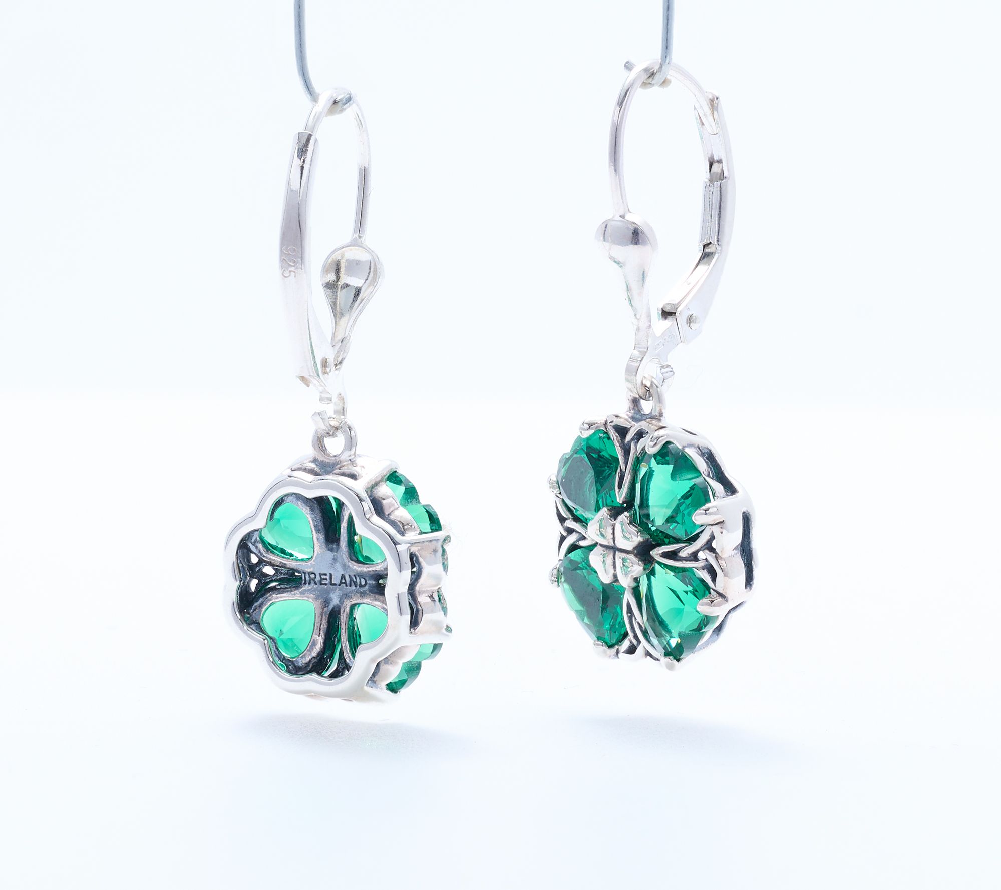 Spark hope and style with these sterling silver four-leaf clover earrings, where vivid heart-shaped simulated emeralds and intricate trinity knot detail add Irish charm to your ensemble. A polished finish and secure lever back closure mean these earrings are ready to shine for brunch, celebrations, or a thoughtful gift. From JMH Jewellery.