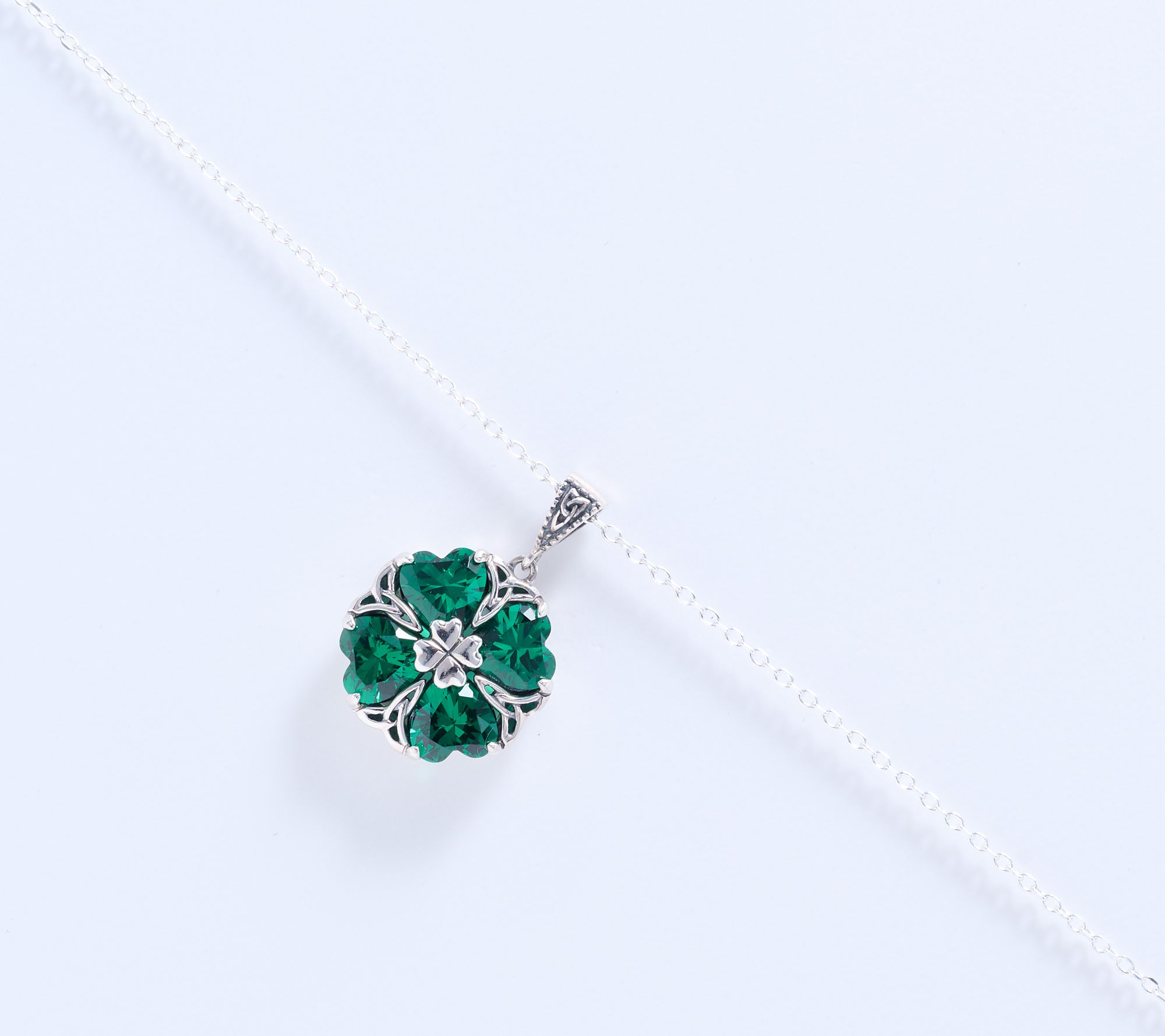 • Heart-shaped simulated emeralds in a four-leaf cover design; trinity knot details; clover at center; bail with trinity knot; hallmarked in the Assay Office in Dublin Castle