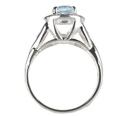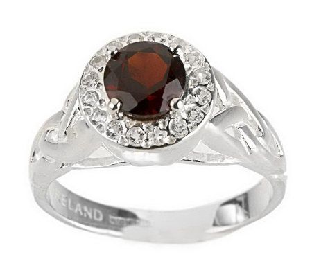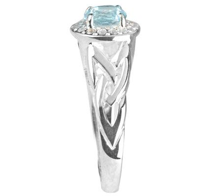 Heavenly beauty. At the center of this stunning sterling silver ring is a large, round gemstone that sparkles with color and brilliance. Encircling the central gemstone in an angelic aura are round white topaz gemstones. An ornate openwork trinity knot motif lends authentic Irish charm to the shoulders.
